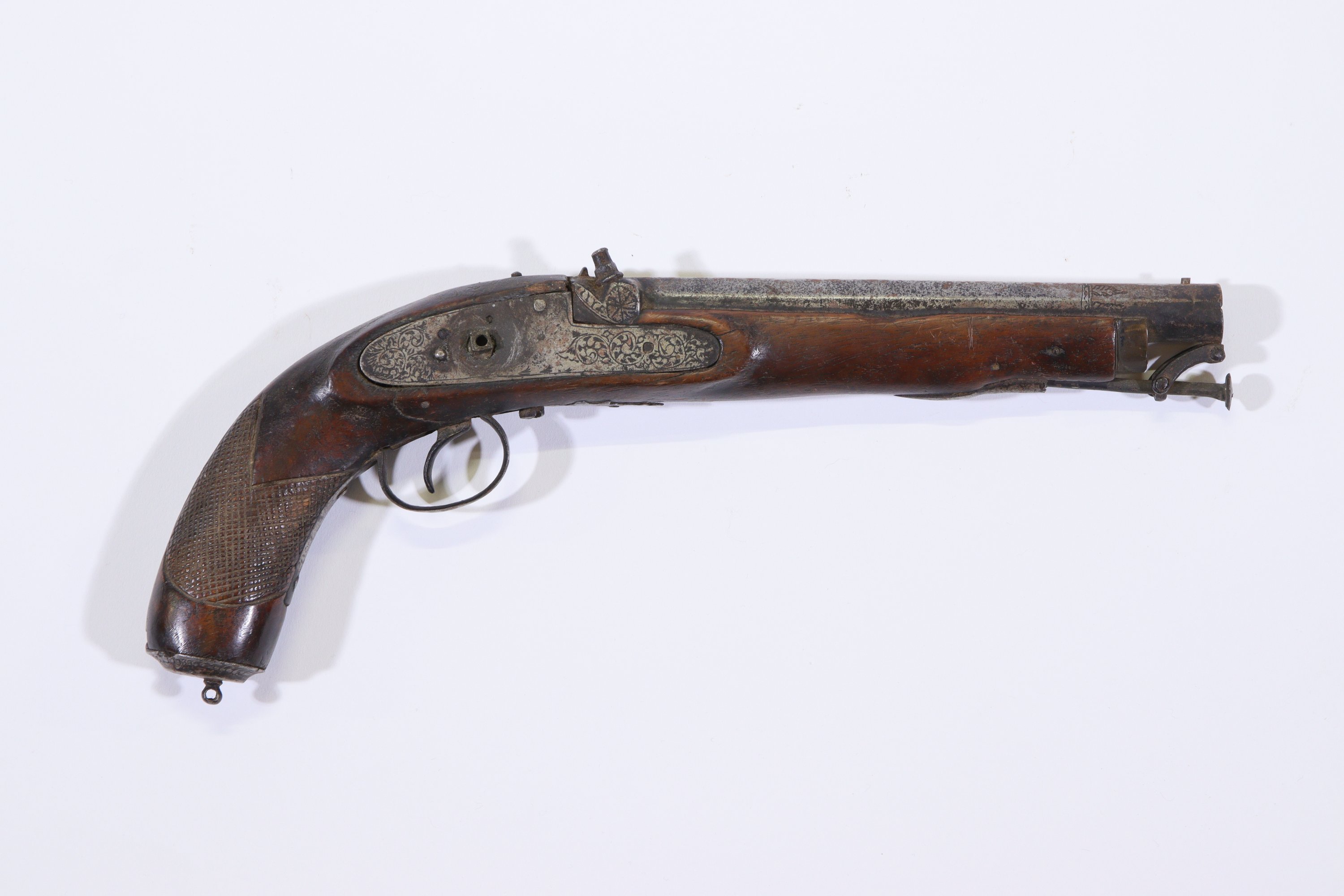 - Un pistolet à coffre à percussion. Canon à pans, détente sous pontet. Crosse en noyer.