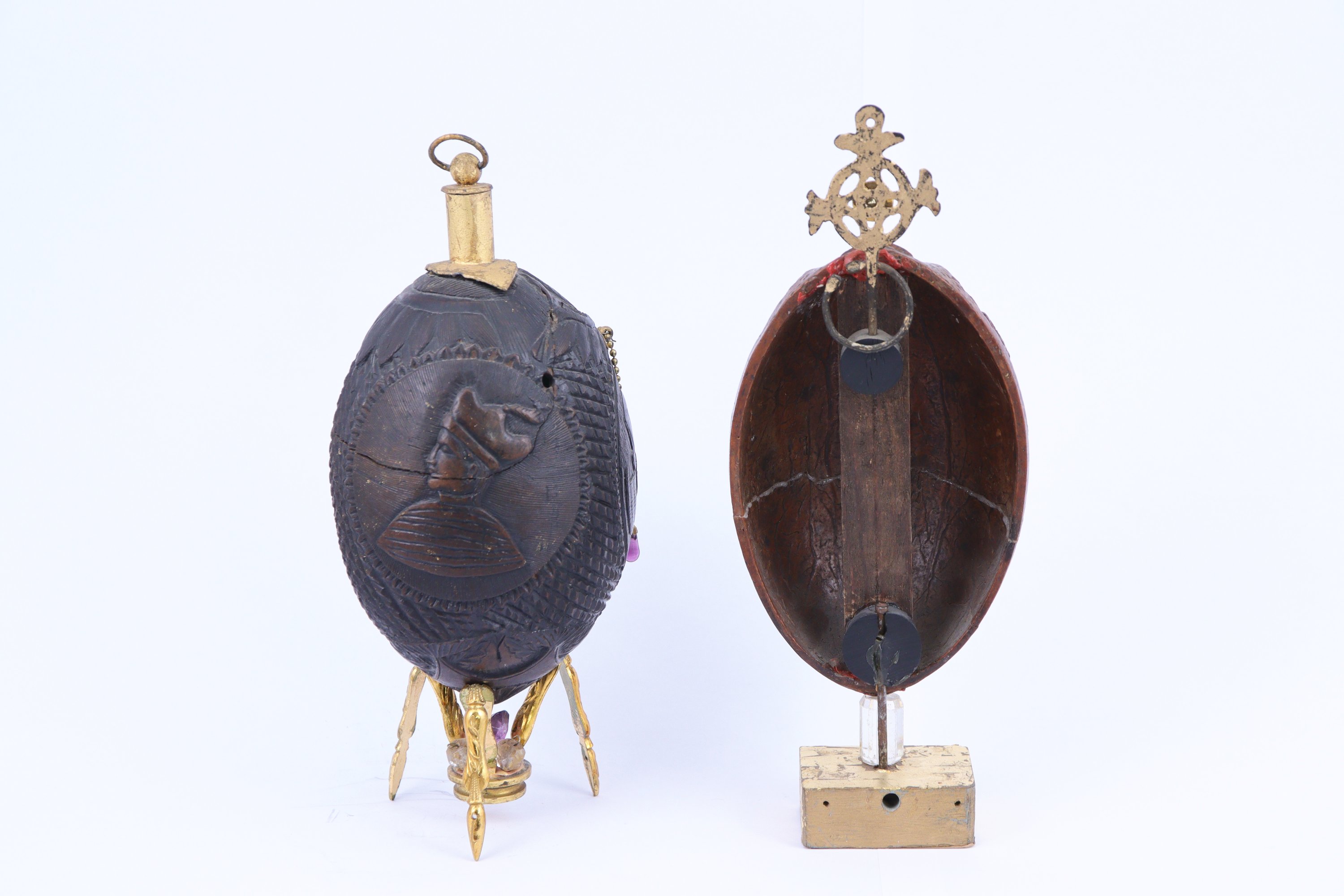 Jointe: demi-noix de coco sculptée à décor d'un homme dans un médaillon surmonté d'une croix. Sur un socle de section carrée. Travail composite. Haut. 13 cm. Haut. totale 21 cm.