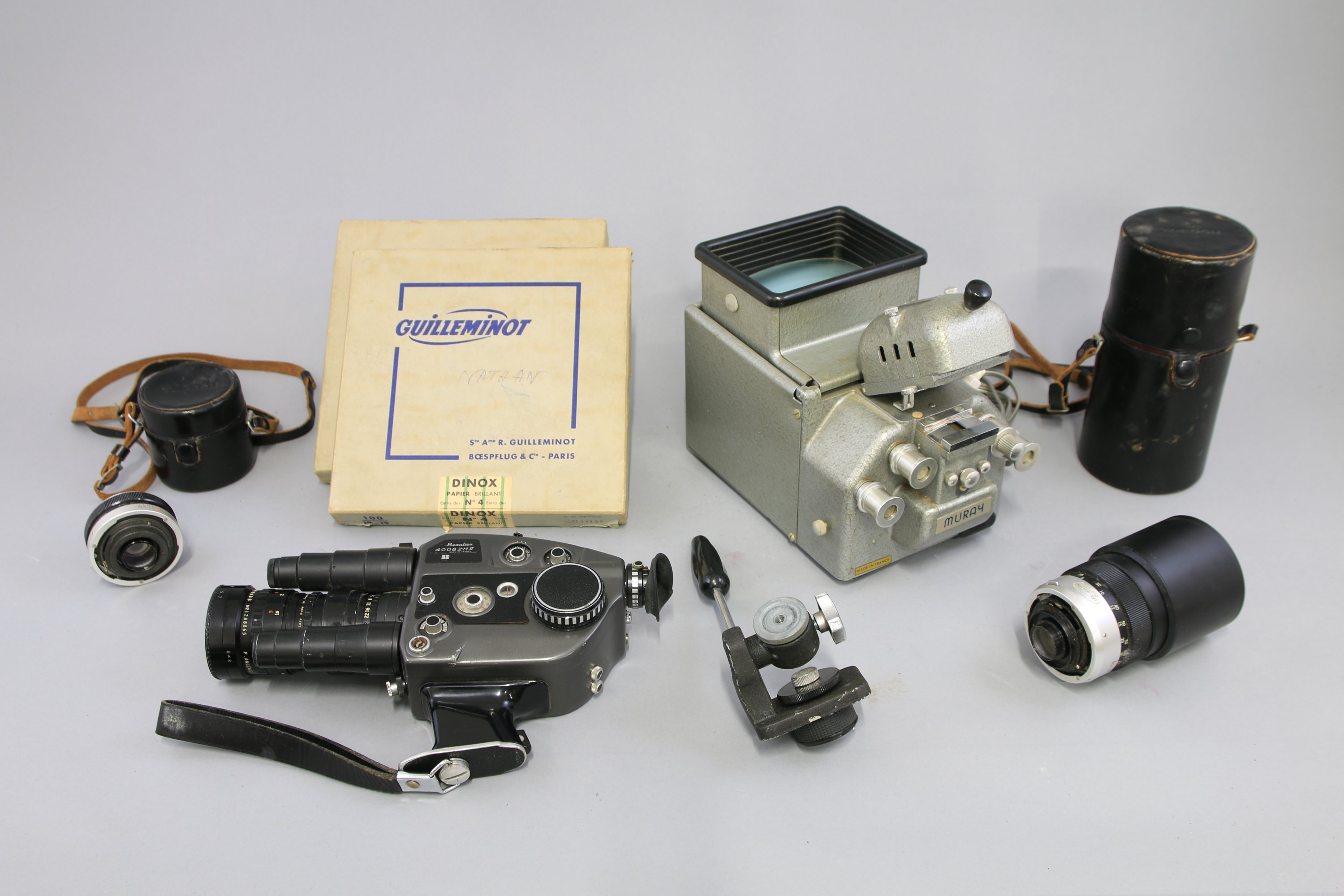 - Equipement divers pour photos dont oeilleton, objectifs, micro, visionneuses, bobines de film en 16 mm, enrouleur, dérouleur de film, etc.
