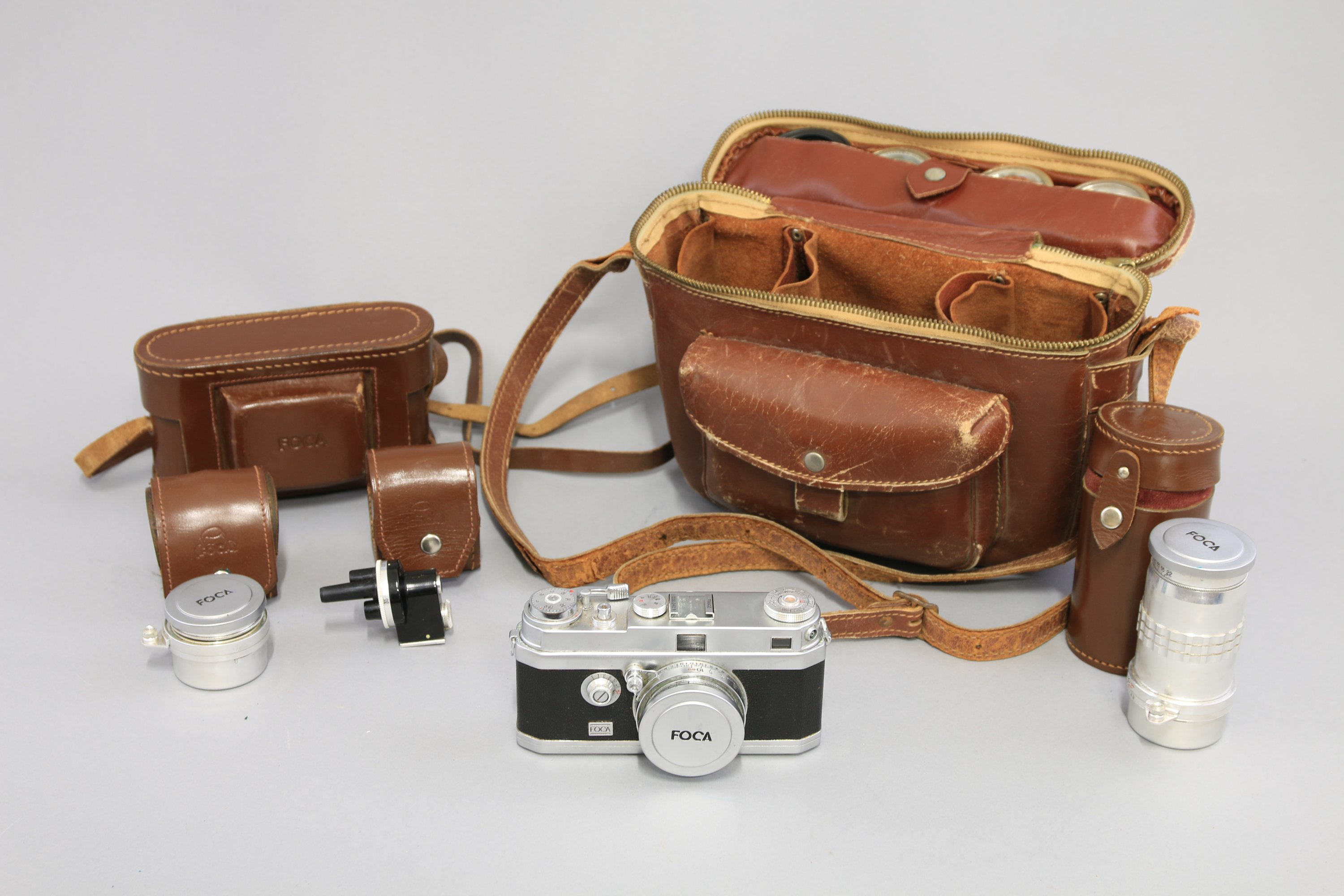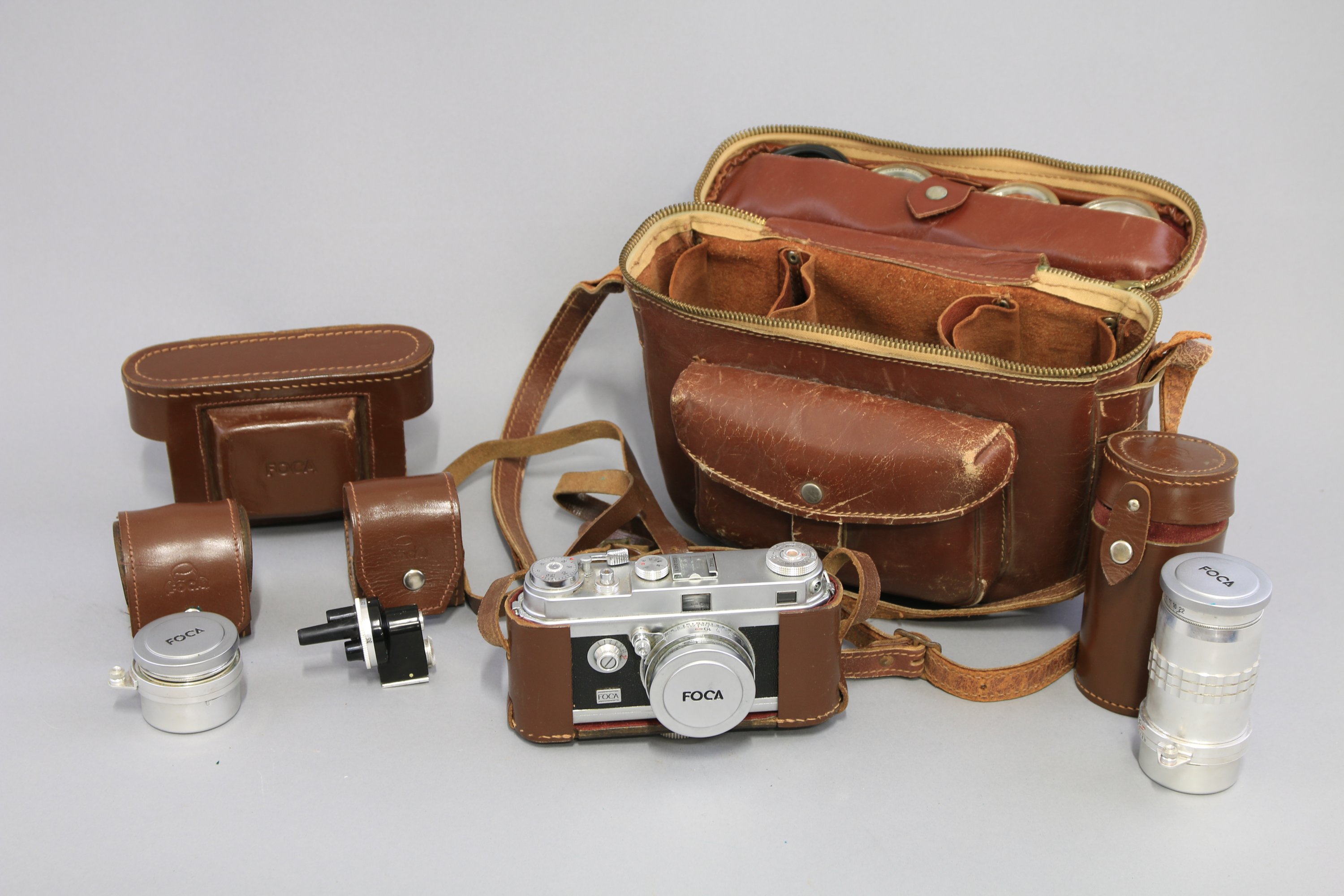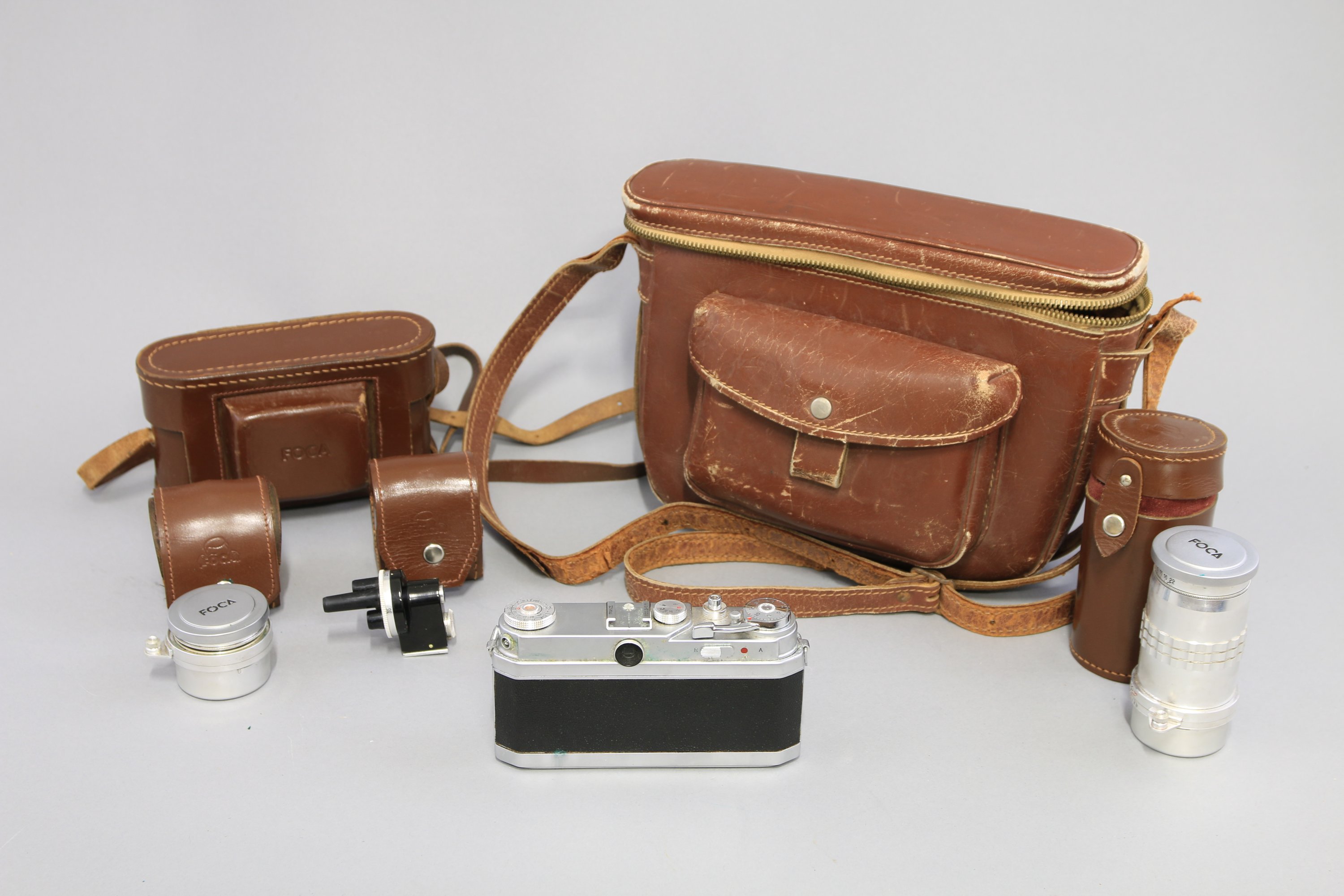 - Foca. Appareil photographique avec trois objectifs: Oplar 1:2,8. N°"87636" ; Oplar 1:3,5. N°"12701" ; Oplar 1:4,5. N°"10999". Avec filtres, cellule et viseur. Dans une pochette ;