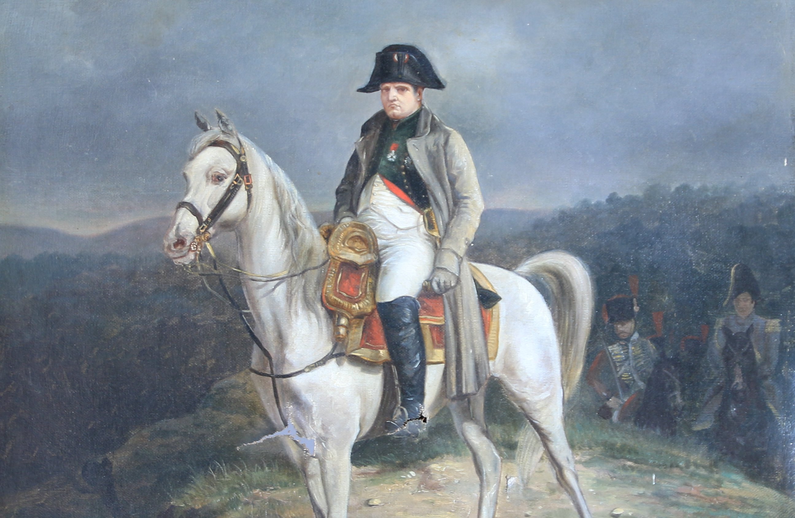 Napoléon Ier sur son cheval blanc Vizir est campé ici pendant la bataille de France, qui coûtera son trône à l'Empereur. Cette image saisissante est réalisée d'après le panneau conservé au Walters Art Museum de Baltimore (n° 21652).