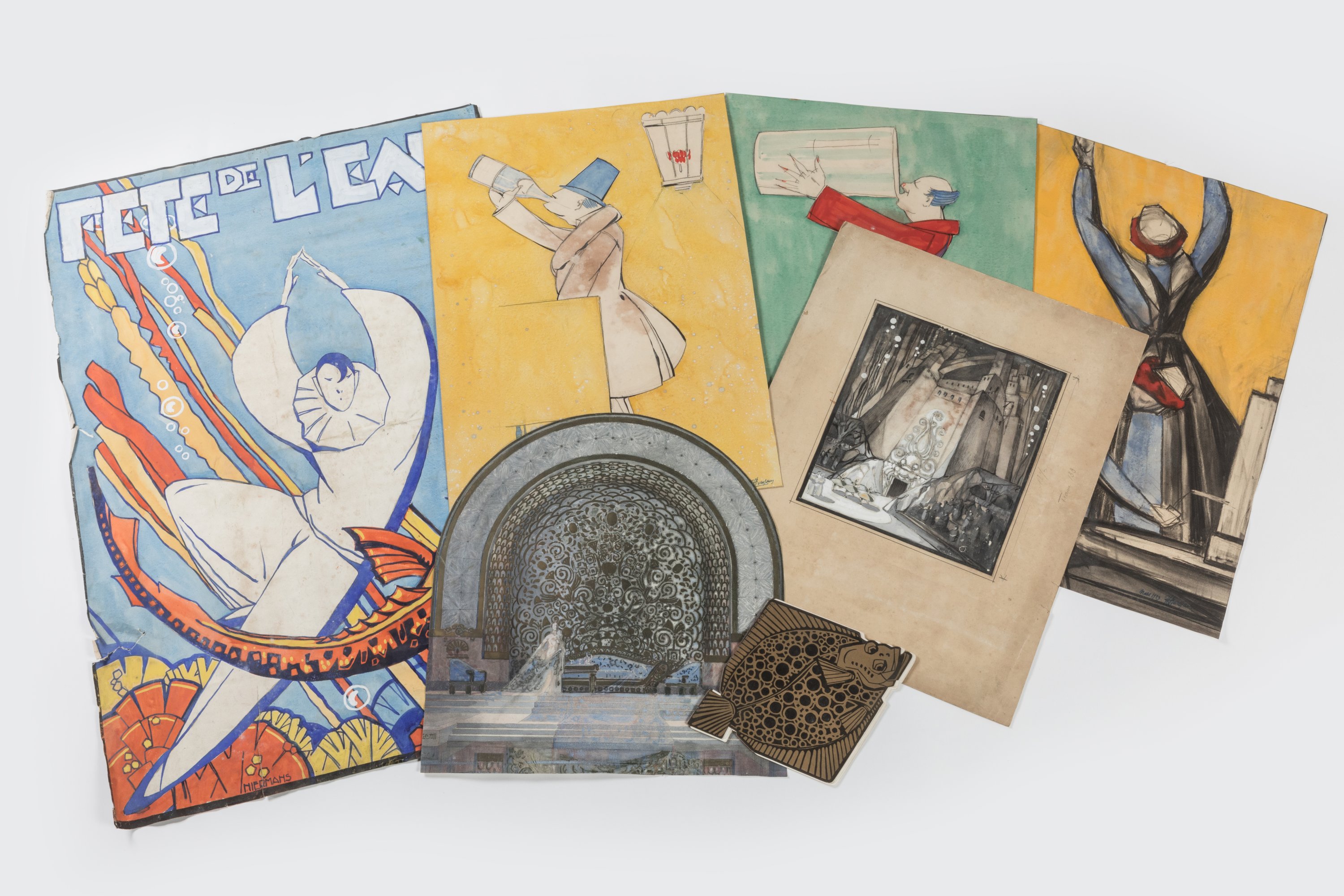 - Maquette pour la Fête de l'Eau. Fusain, encre et gouache sur papier. Signé en bas à droite. Indications manuscrites "Trame 133" et "18f" sur papier fort. Haut. 33,5 Larg. 29 cm (trous, déchirures, tache, contrecollé sur papier). Sans cadre. Bibliographie: Maison des Journalistes, Livret de la Fête de l'Eau du 7 juillet 1923, p. 11 ;
