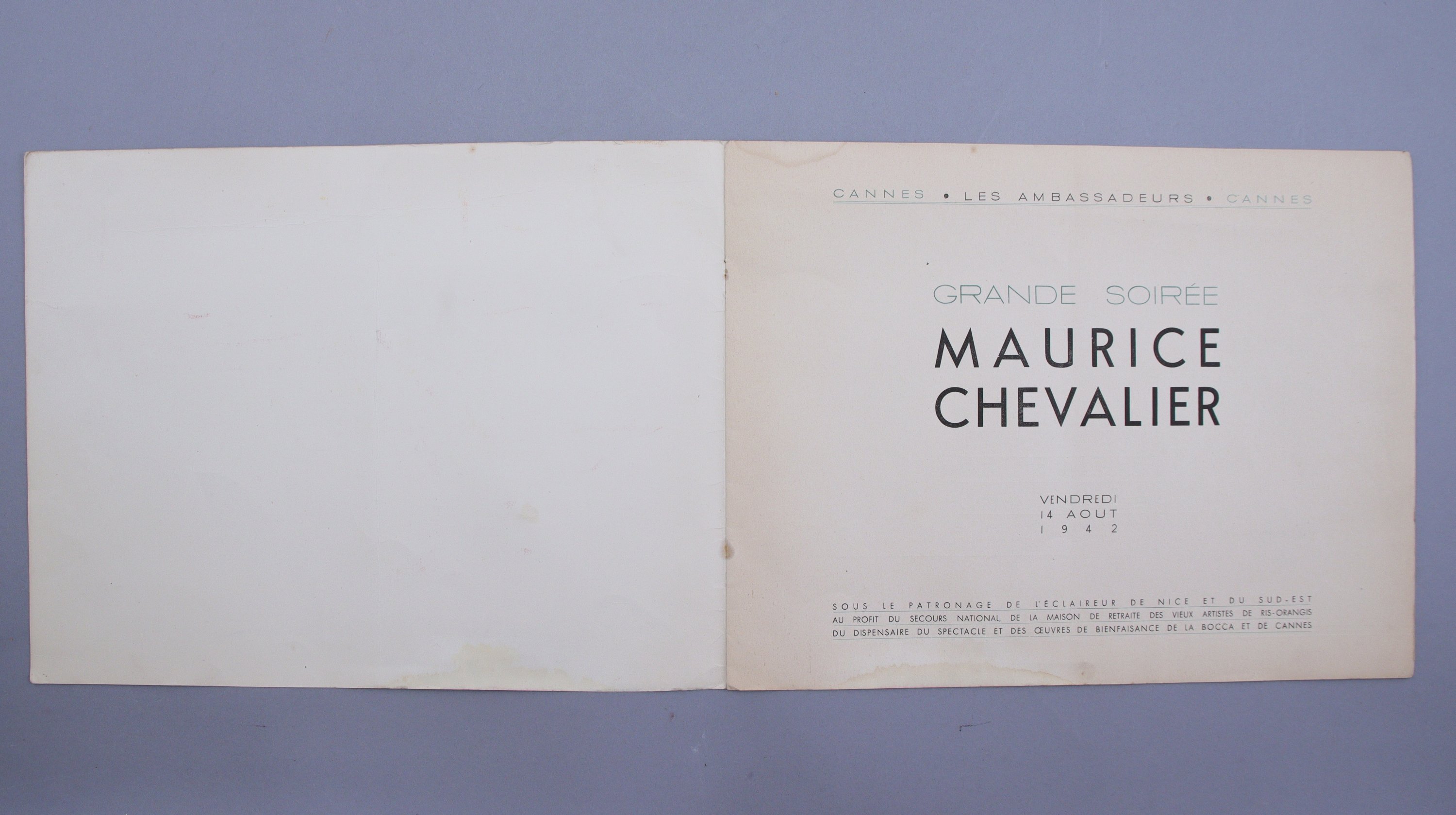 Lithographie en couleurs signée dans la planche, en couverture du programme de la grande soirée Maurice Chevalier le vendredi 14 août 1942 à Cannes.