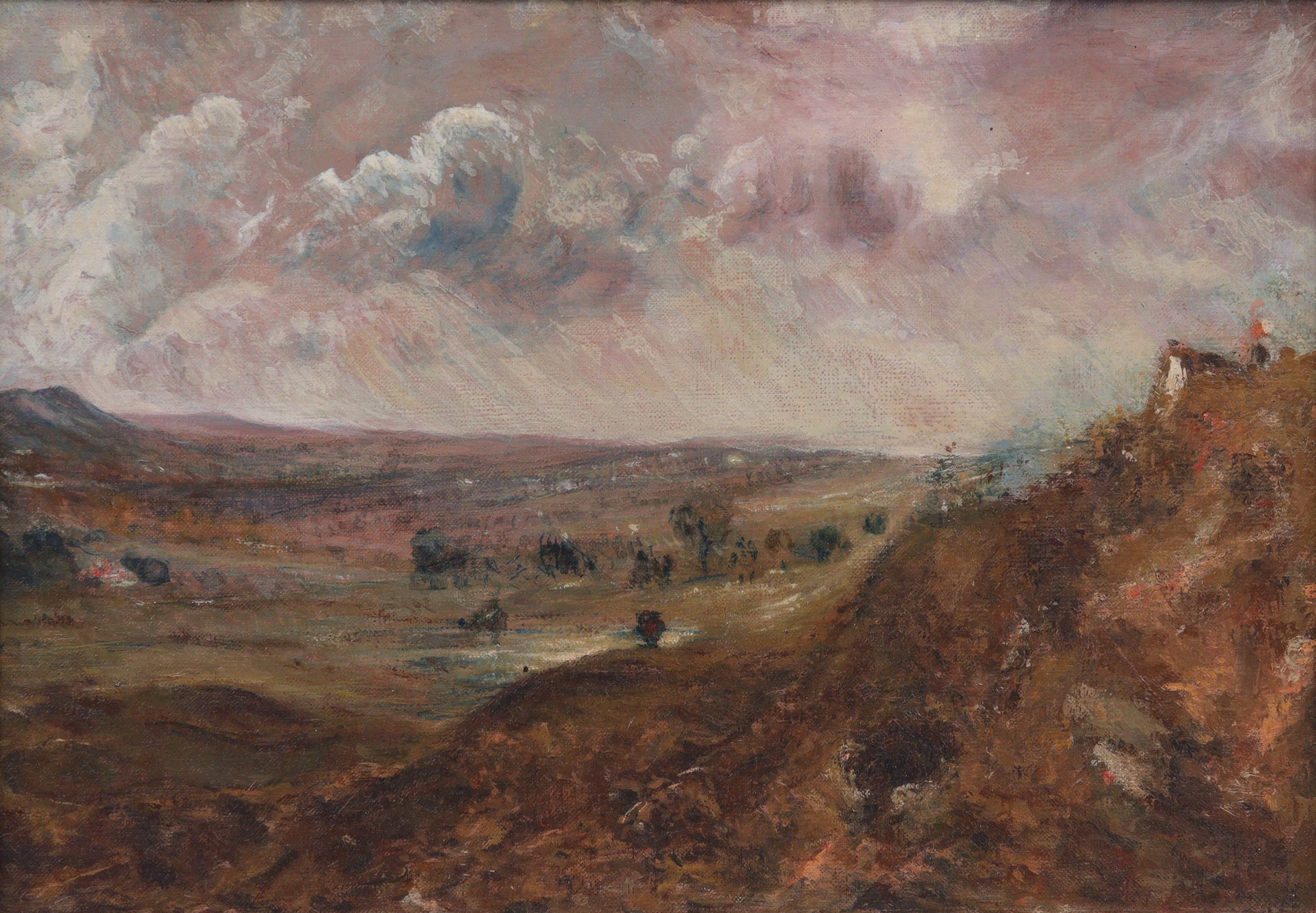 - Attribué à Amélie Sauger (Française, -1951), Paysage. Toile. Marquée à l'encre au dos "A.Sauger / n°212". Haut. 23,2 Larg. 33 cm. Cadre en bois doré à décor de godrons (Haut. 35 Larg. 45 cm).