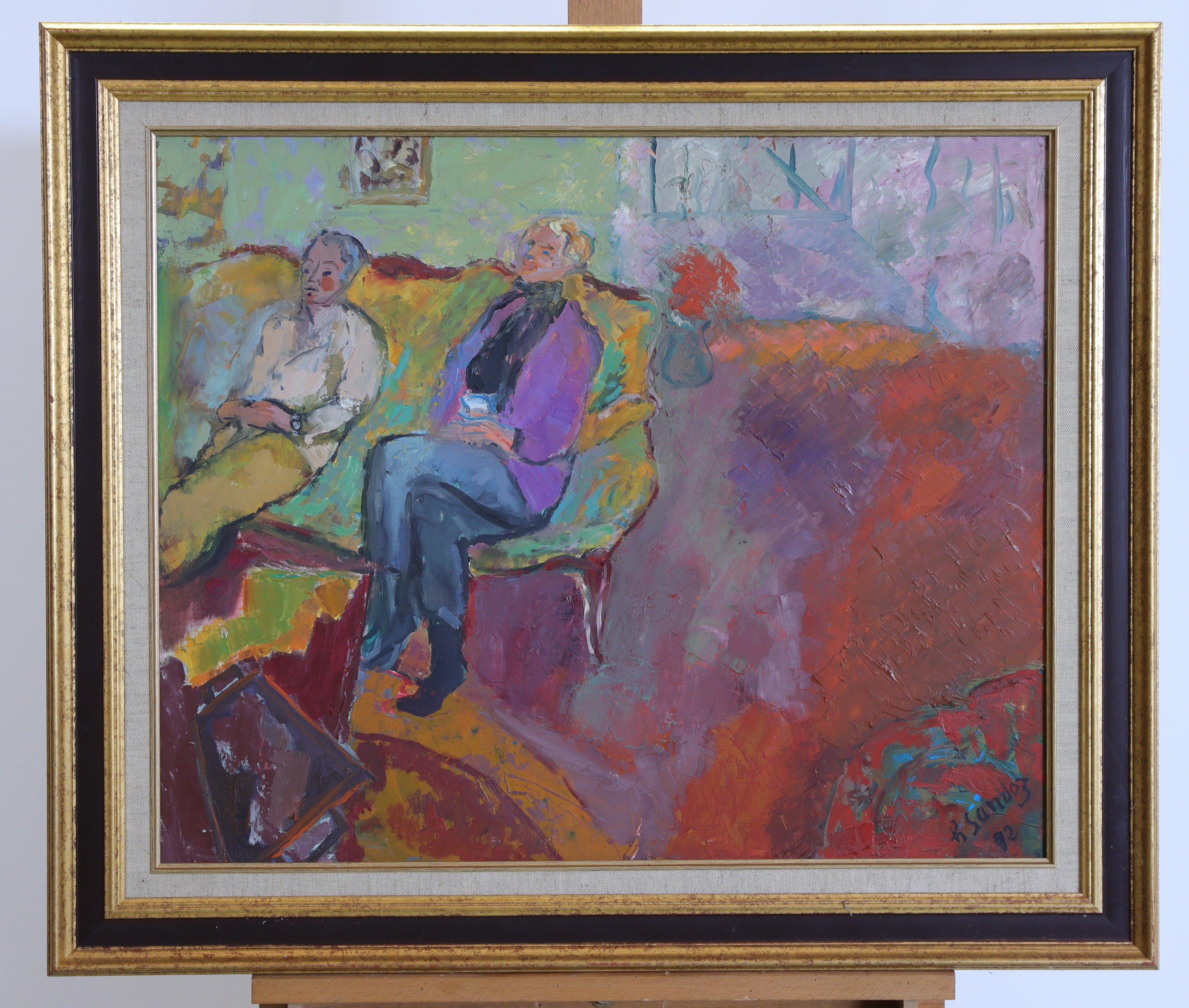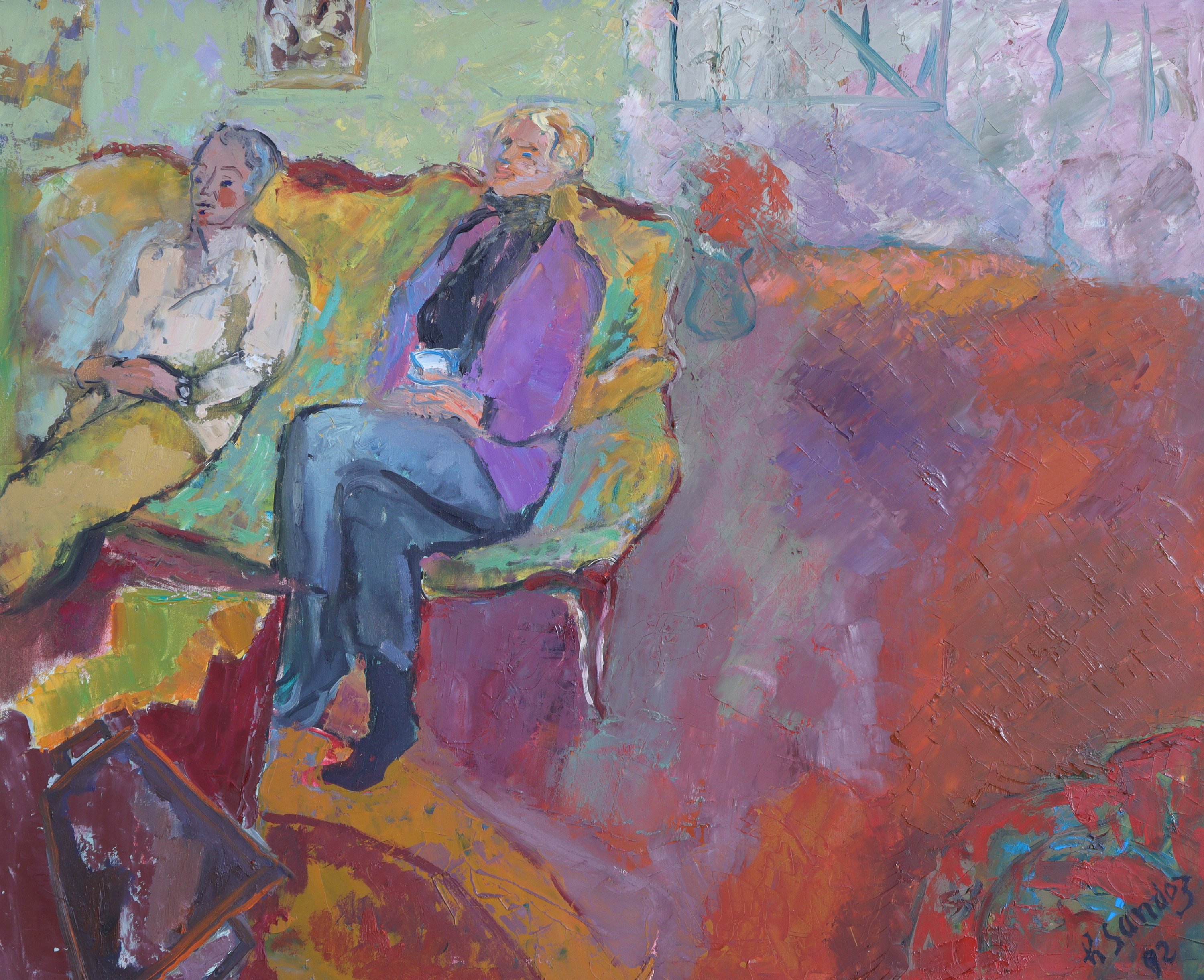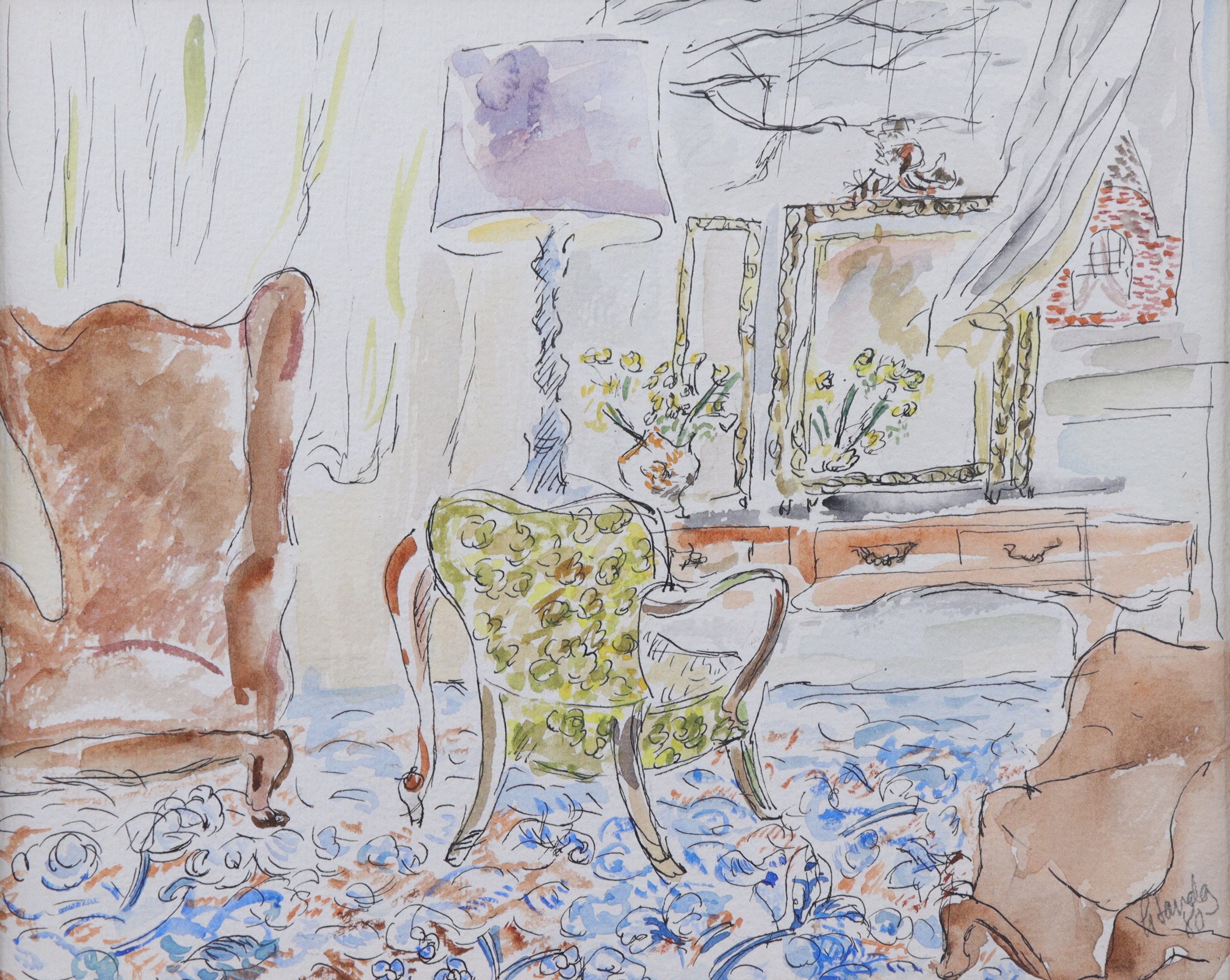 - Hélène Sandoz (XXe-XXIe), Le salon, 1980. Aquarelle. Signée et datée en bas à droite. Haut. 19 Larg. 23 cm.