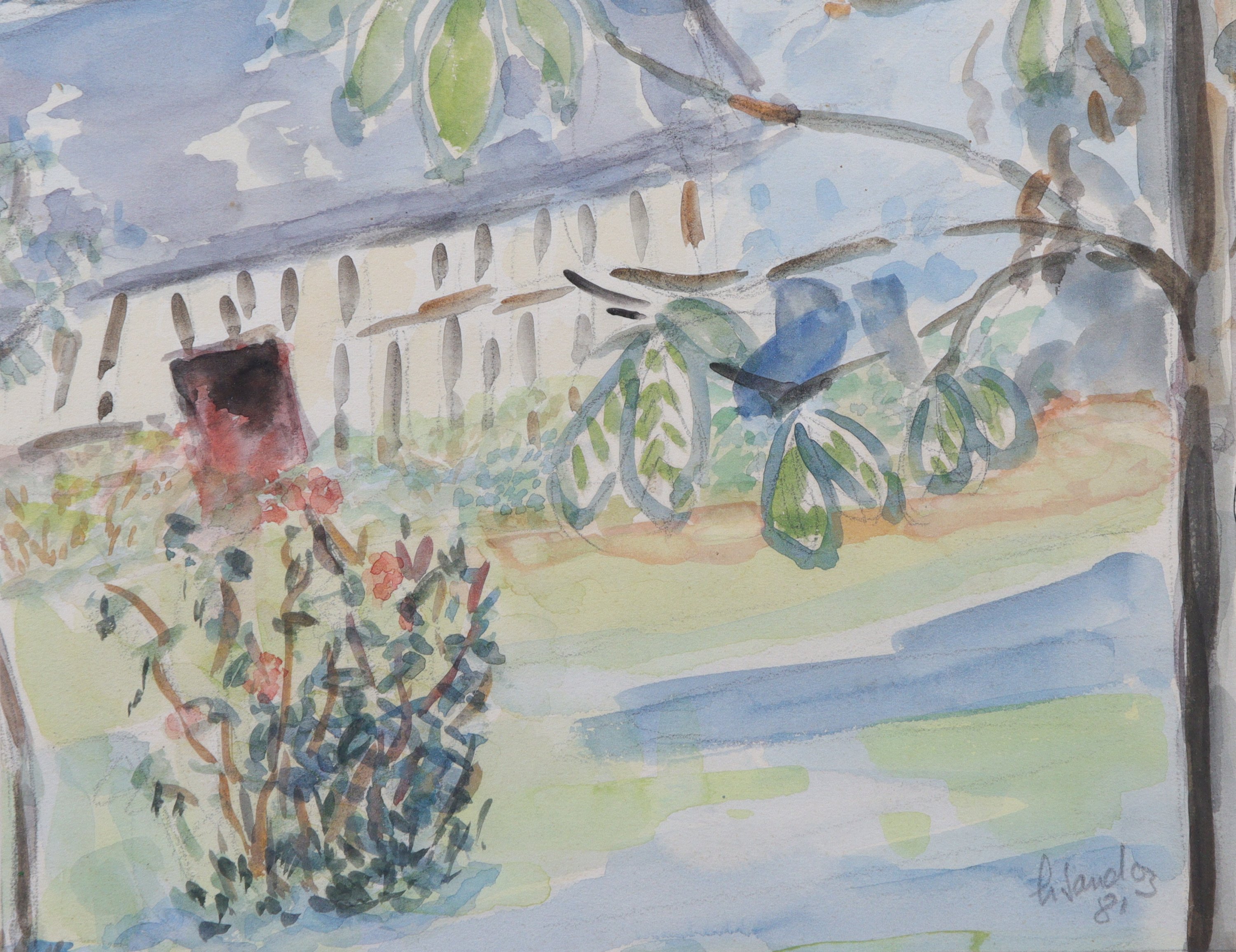 - Hélène Sandoz (XXe-XXIe), Vue depuis la chambre, 1980. Aquarelle. Signée et datée en bas à droite. Haut. 23,5 Larg. 19 cm.