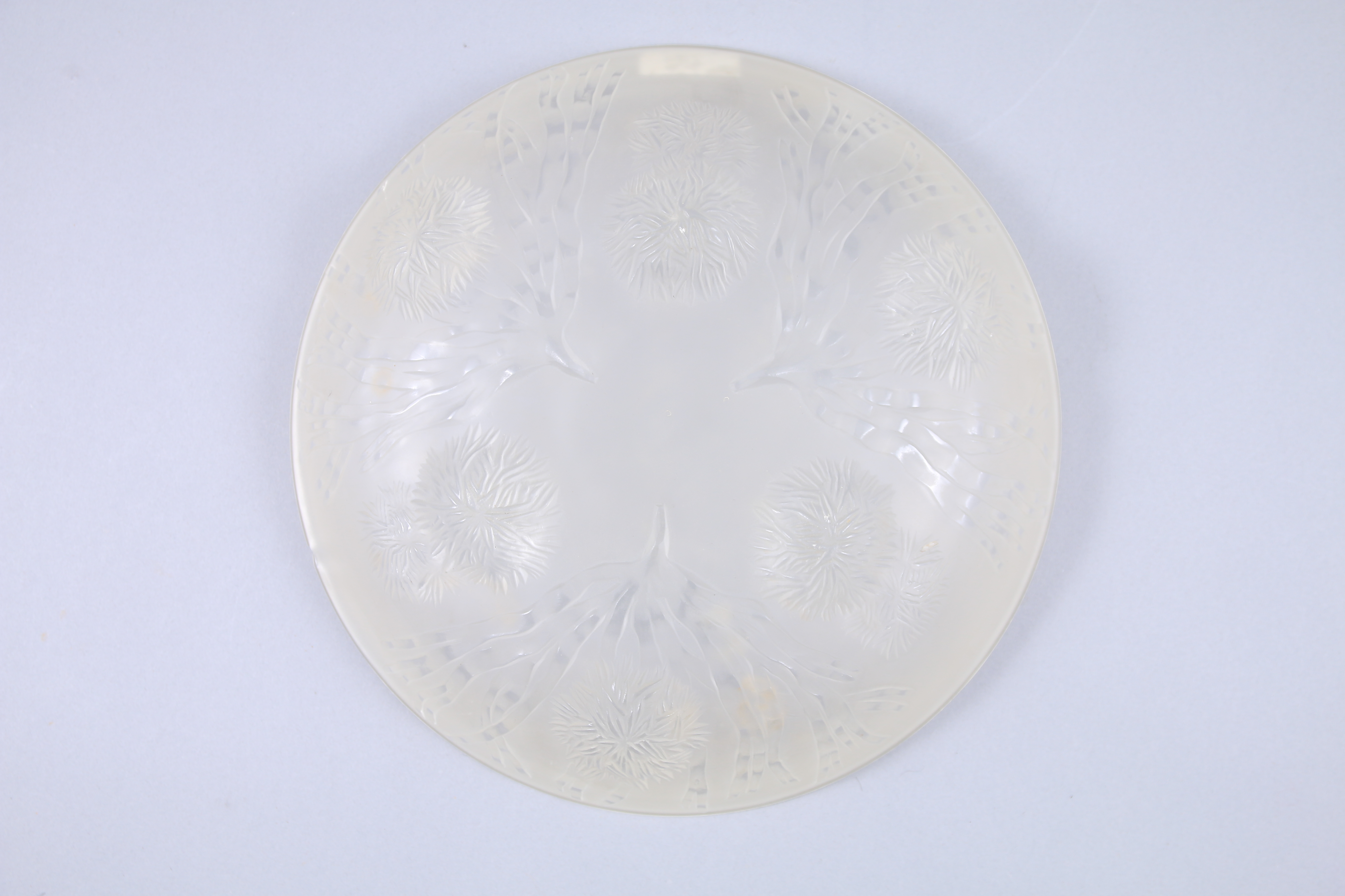 - Sabino, grande coupe aux boules de gui. En verre moulé pressé avec cachet de la manufacture "Sabino France". Haut. 7,5 Diam. 30,5 cm. (éclats)