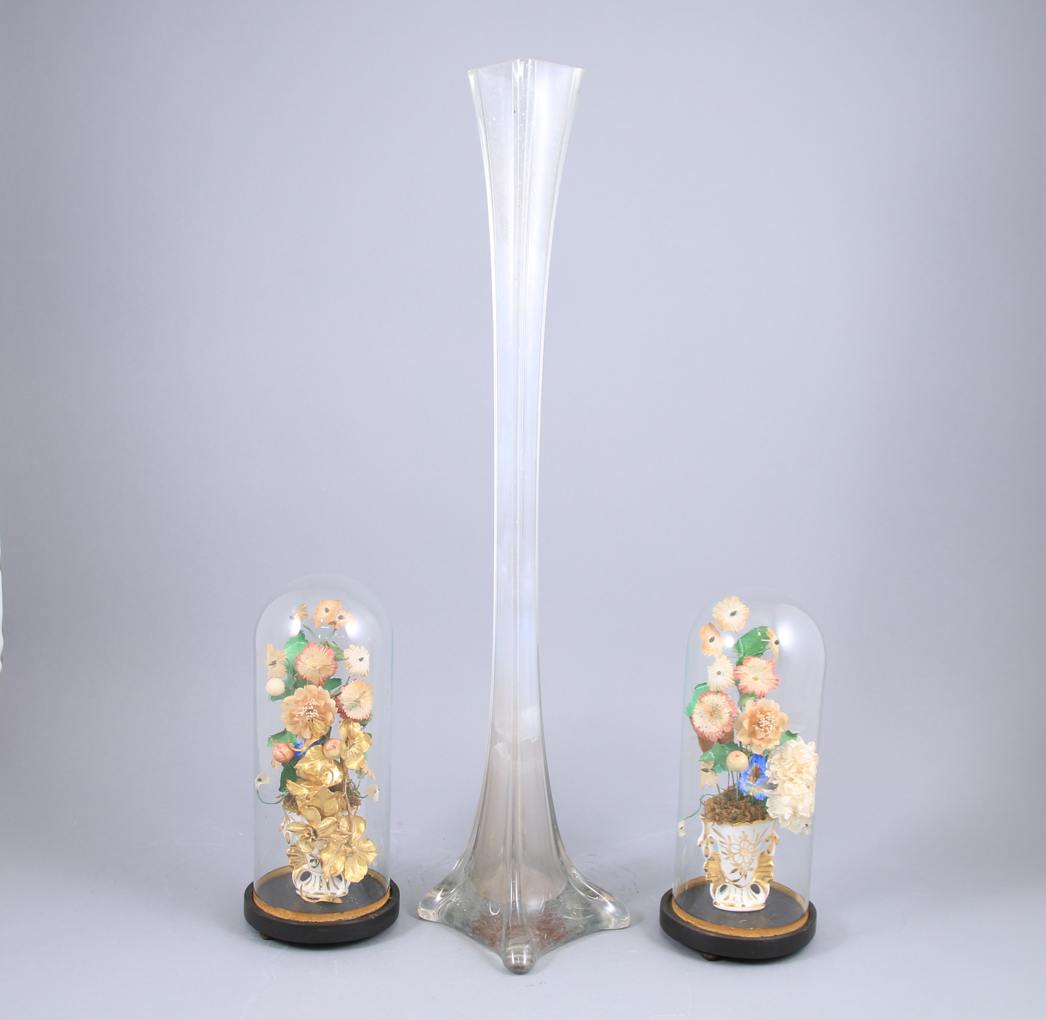 - Deux globes de mariés en porcelaine blanche et dorée et fleurs en papier. Haut. 31 cm.