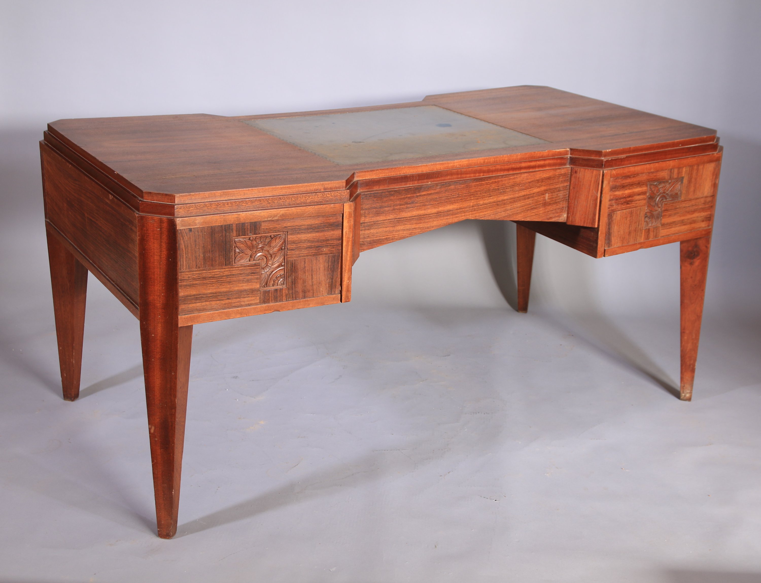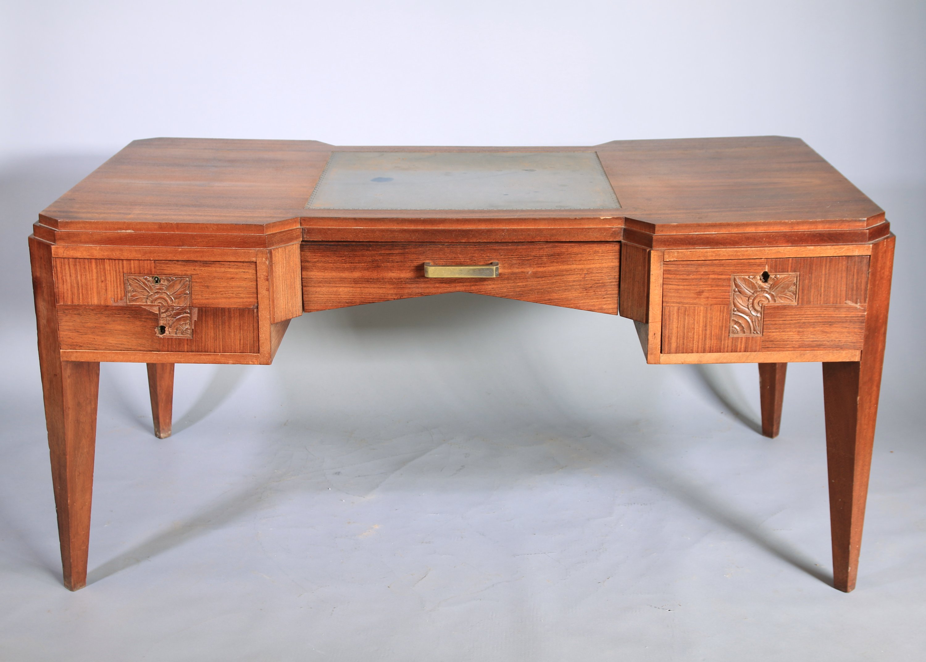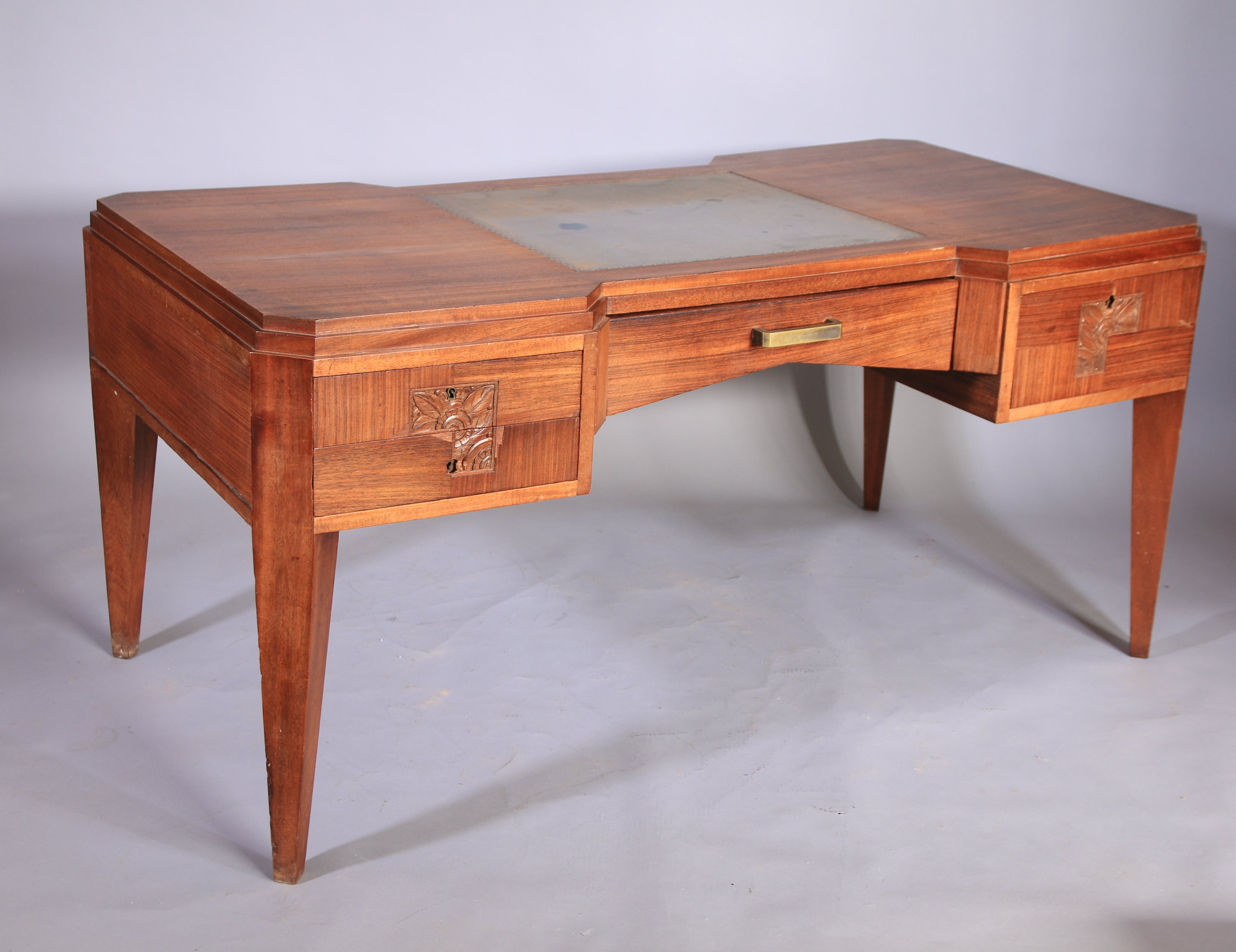 en acajou et placage d'acajou. Le plateau à pans coupés foncé d'un cuir turquoise marqué au petit fer de formes géométriques sur la bordure. Il ouvre par un tiroir en ceinture et deux caissons à décor de fleurs stylisées, l'un à deux tiroirs et le second à un tiroir dévoilant un tiroir à secret. Il repose sur quatre pieds en gaine. Poignée de tirage et entrée de serrure en laiton.