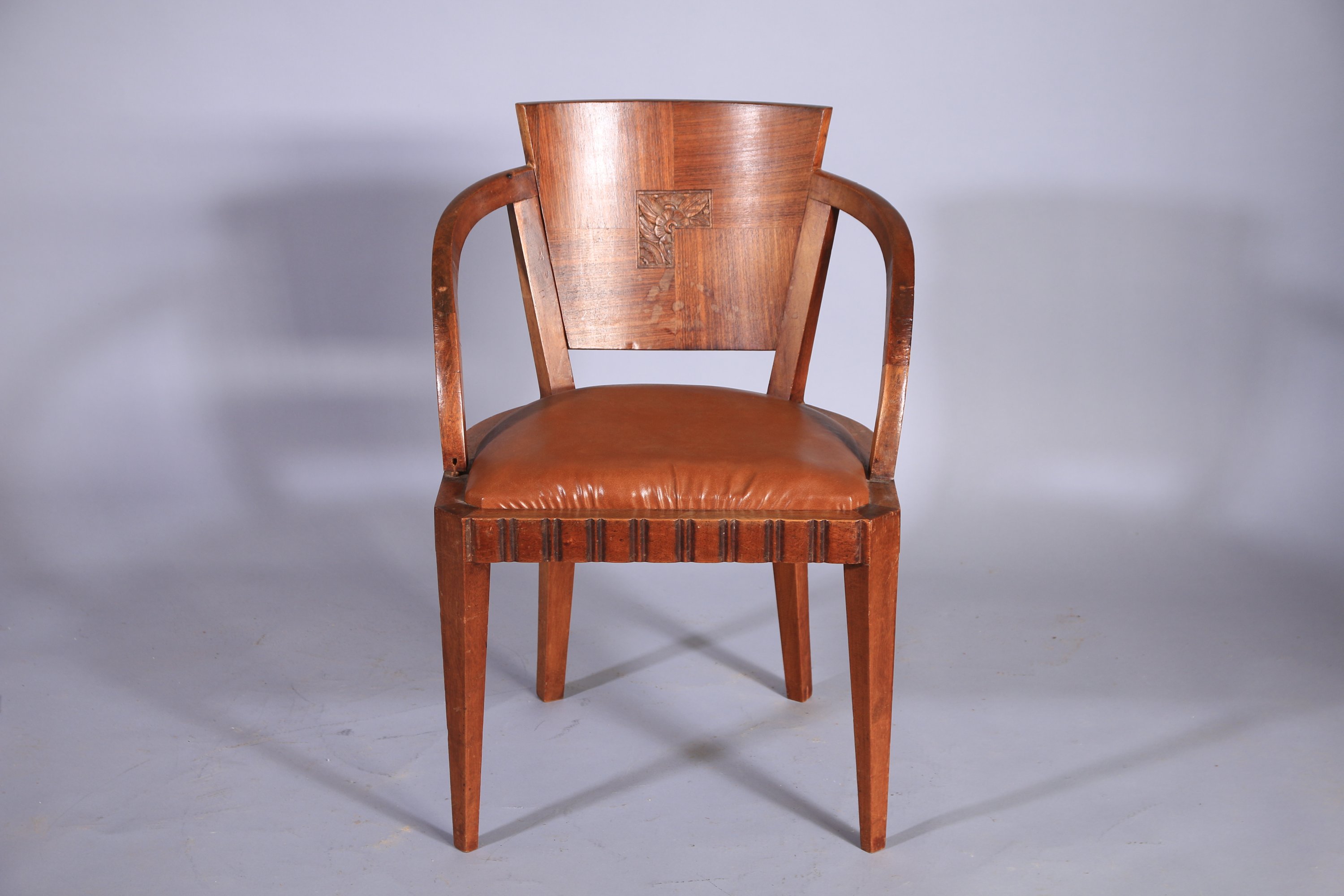 Joint: Fauteuil de bureau à dossier cabriolet et ceinture à décor de cannelures . Il repose sur quatre pieds en gaine. Assise formée par une galette de cuir havane. Haut. 81 Larg. 58 Prof. 56,5 cm. (en l'état)