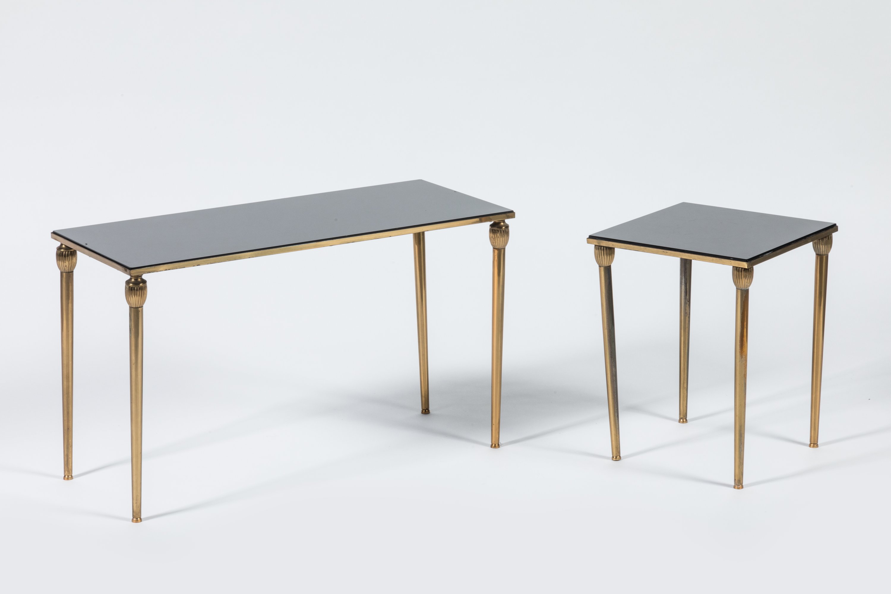en laiton, l'un de forme rectangulaire, l'autre carré. Ils reposent chacun sur des pieds fuselés coiffés de godrons.
