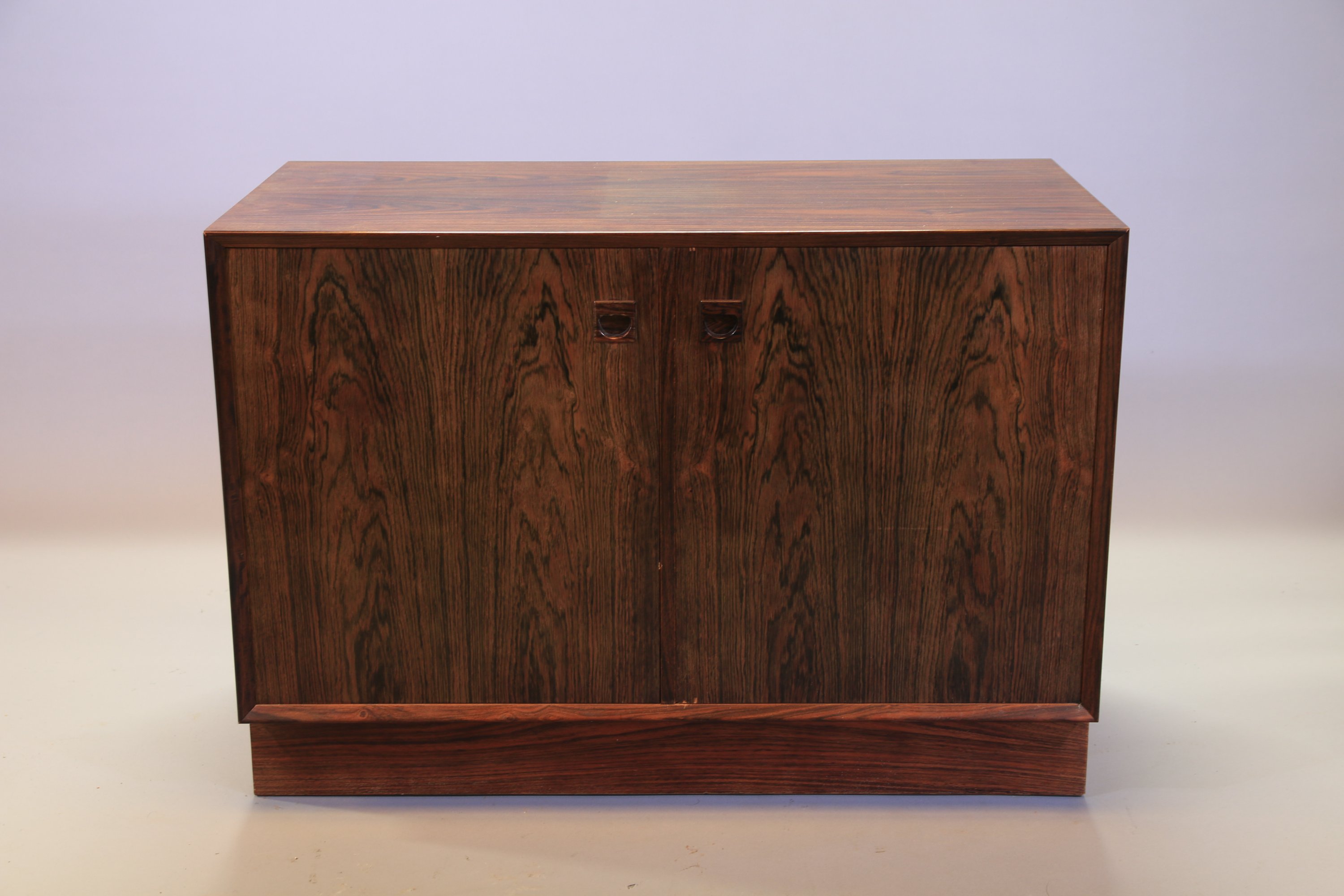 en placage de palissandre. Il ouvre en façade par deux vantaux découvrant quatre niches réglables. Il repose sur une plinthe en retrait.