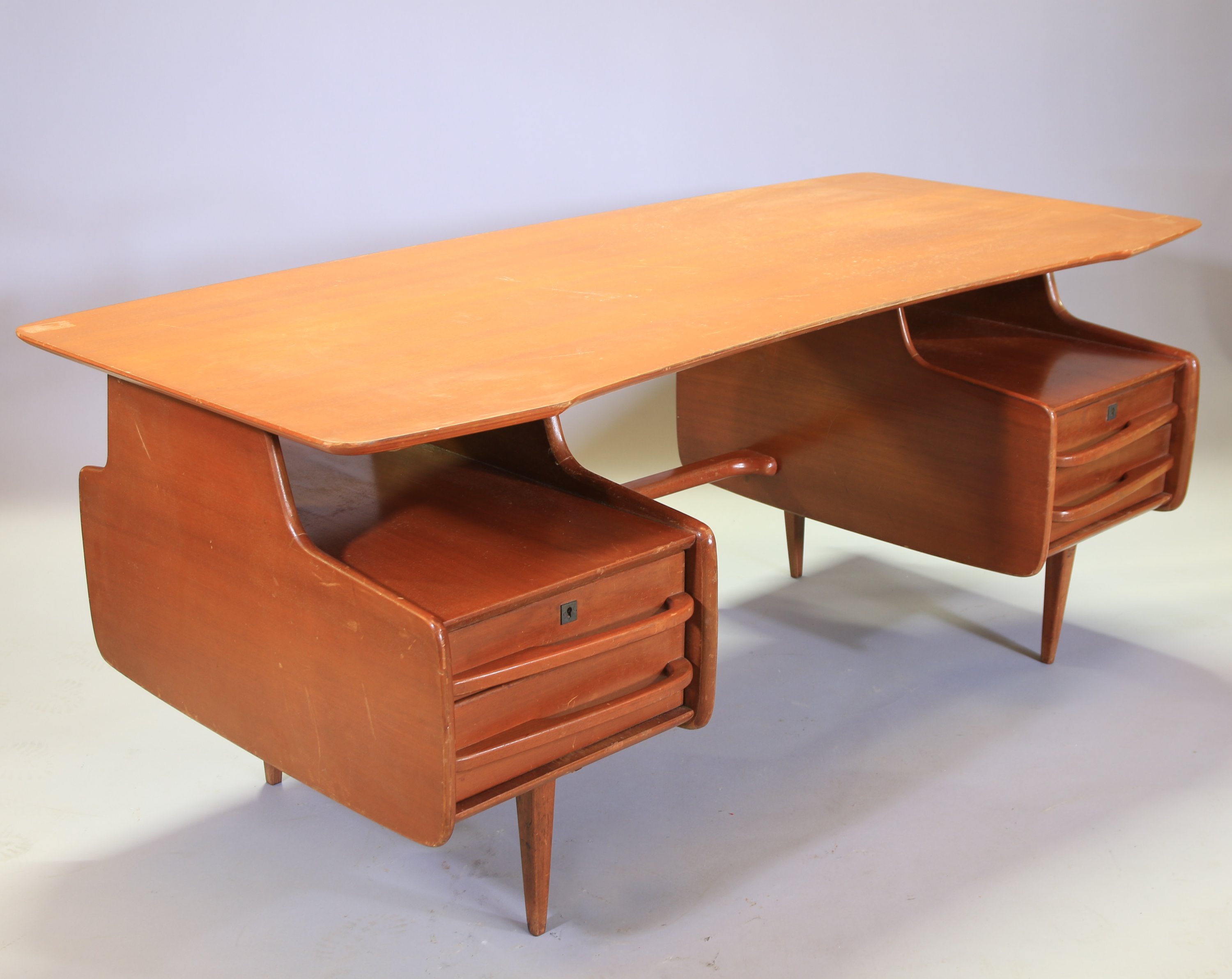 en teck. Il ouvre par deux caissons à deux tiroirs en ceinture et repose sur quatres pieds fuselés.