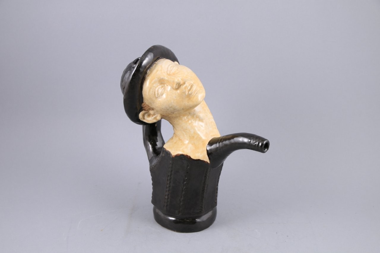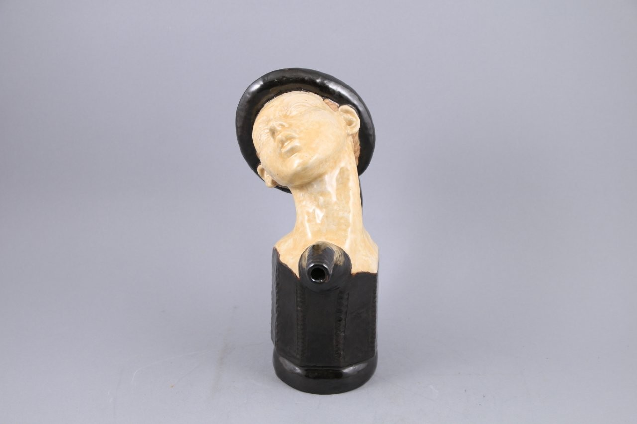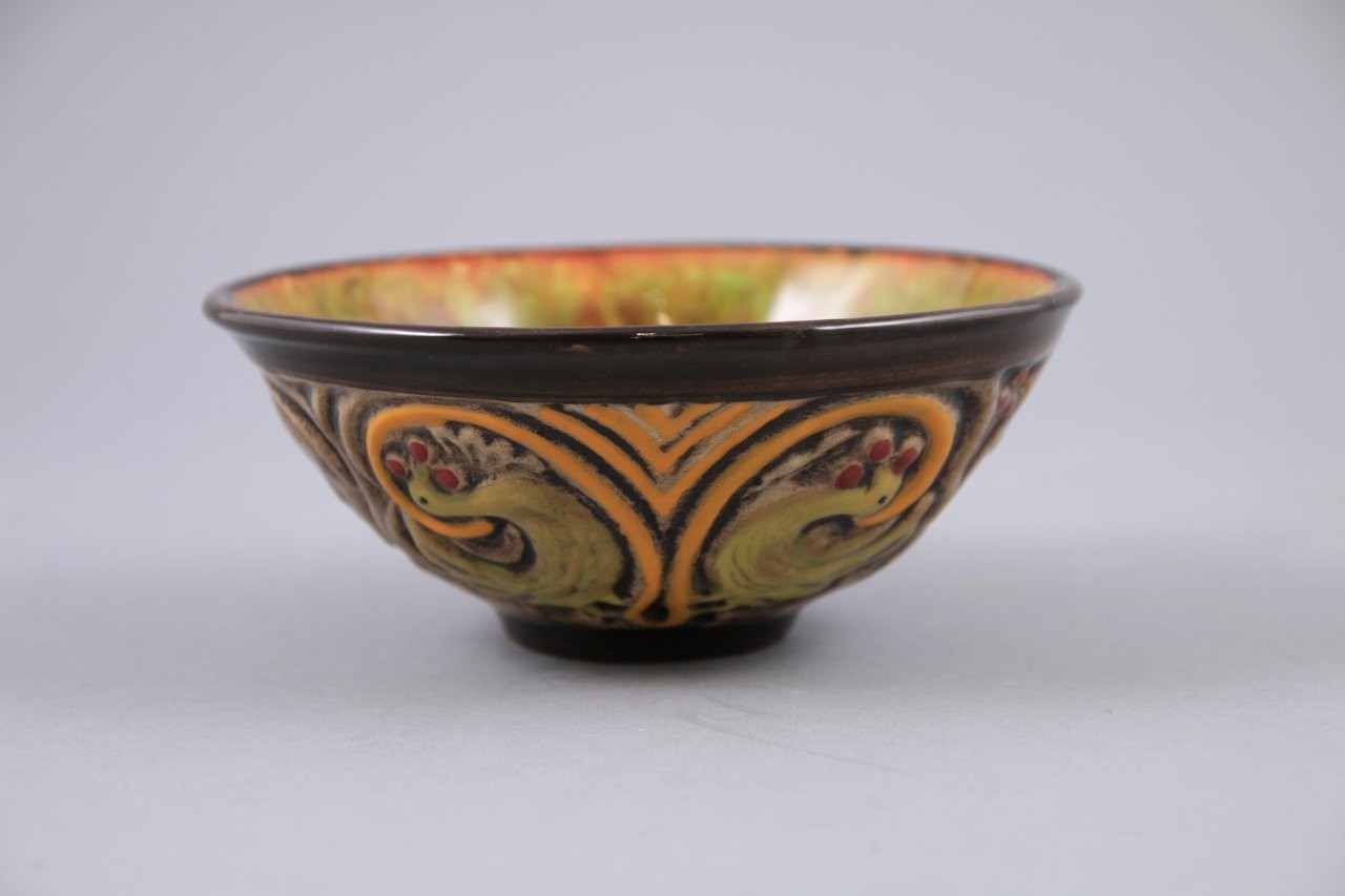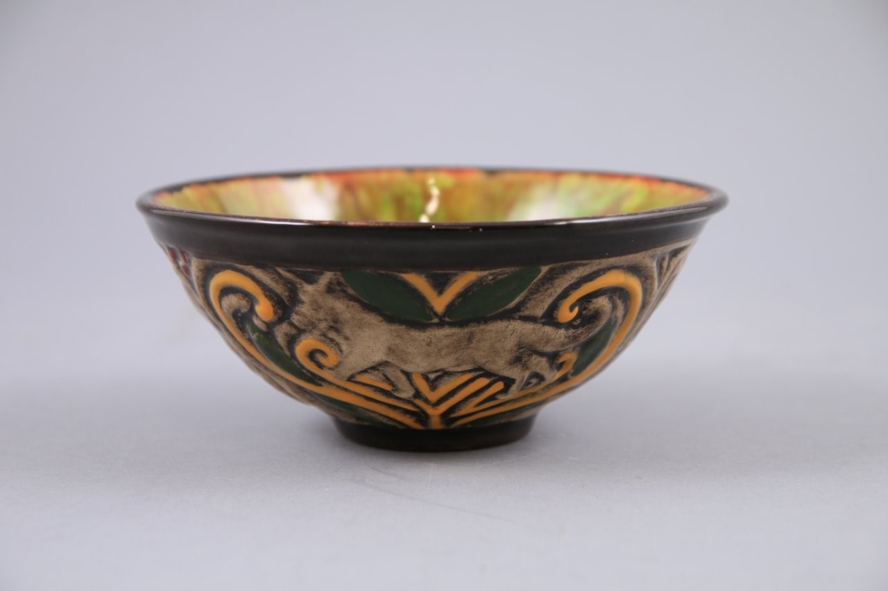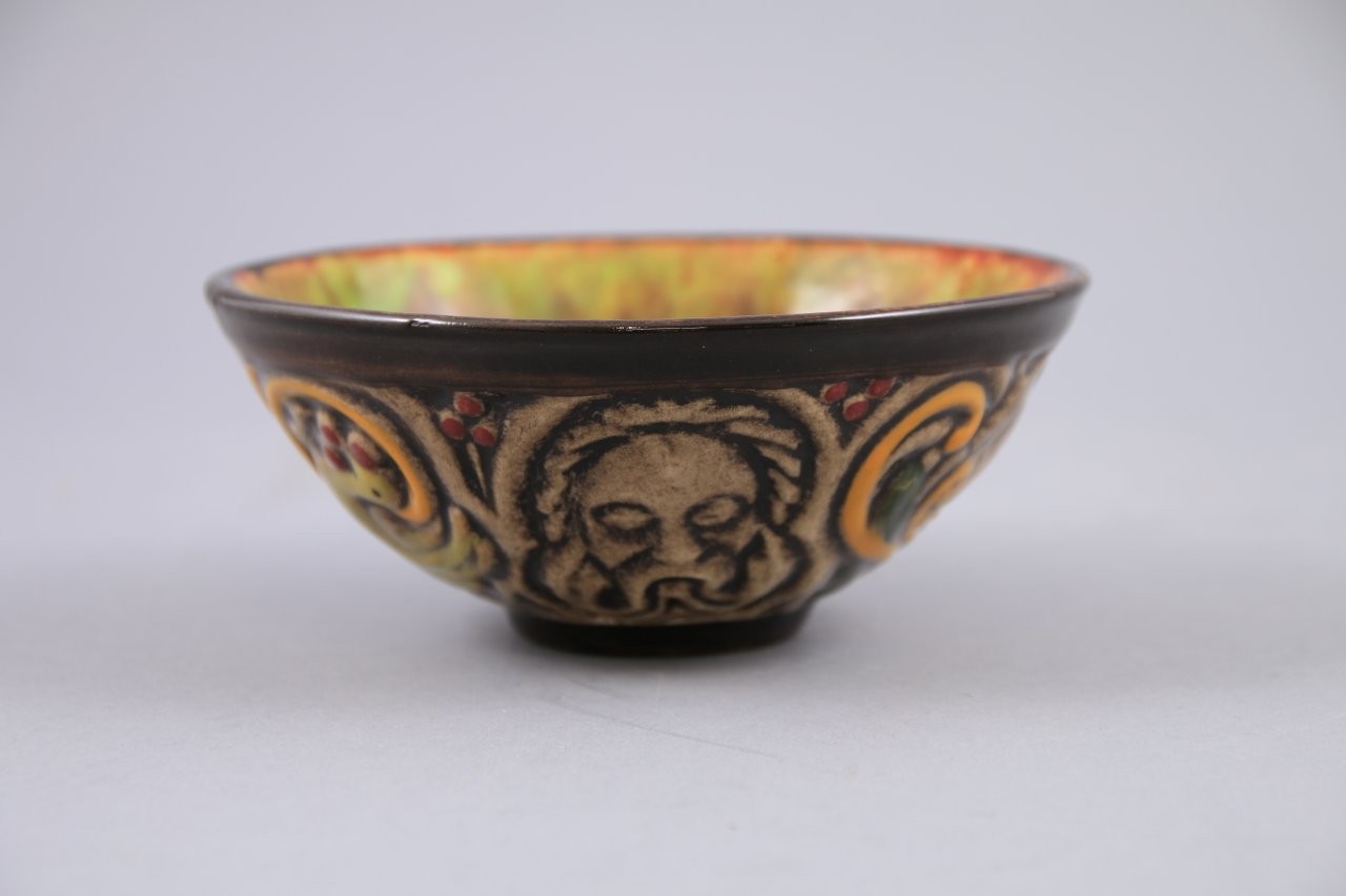 Joint: René Quillivic (Français, 1879-1969) chez Henriot à Quimper. Bol en faïence à décor en bas-relief sur la panse de tête d'homme, de femme, coqs et loup. L'intérieur flammé. Haut. 6 Diam. 15 cm.