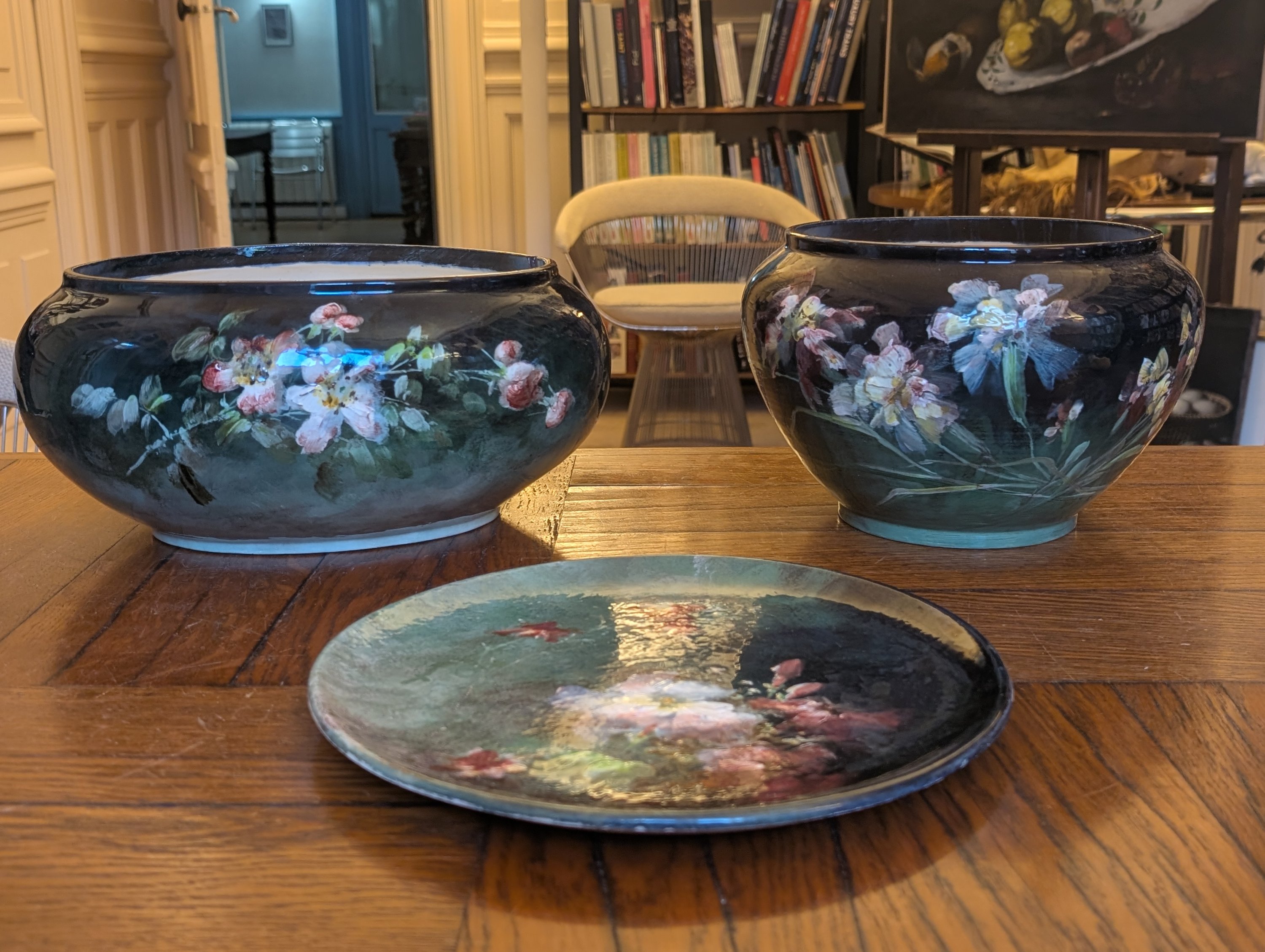 en barbotine impressionniste à décor de jetée de fleurs sur un fond dégradé vert.