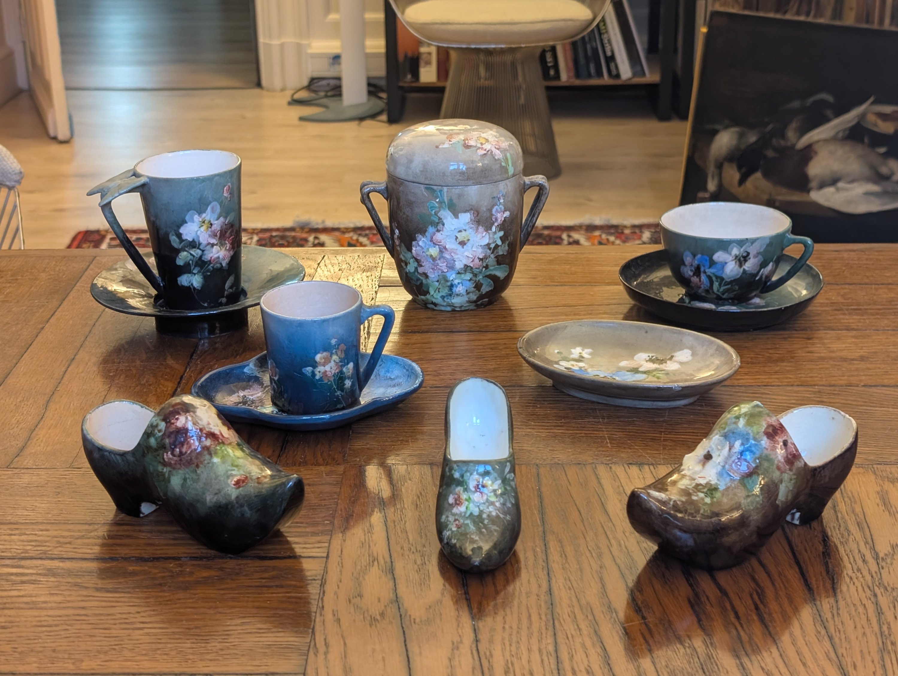 Trois tasses et leurs sous-tasses, trois sabots, un pot couvert et une coupelle