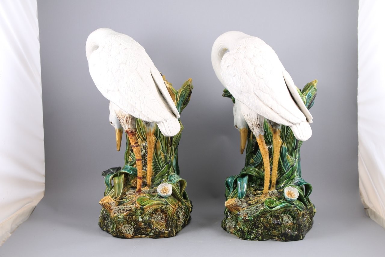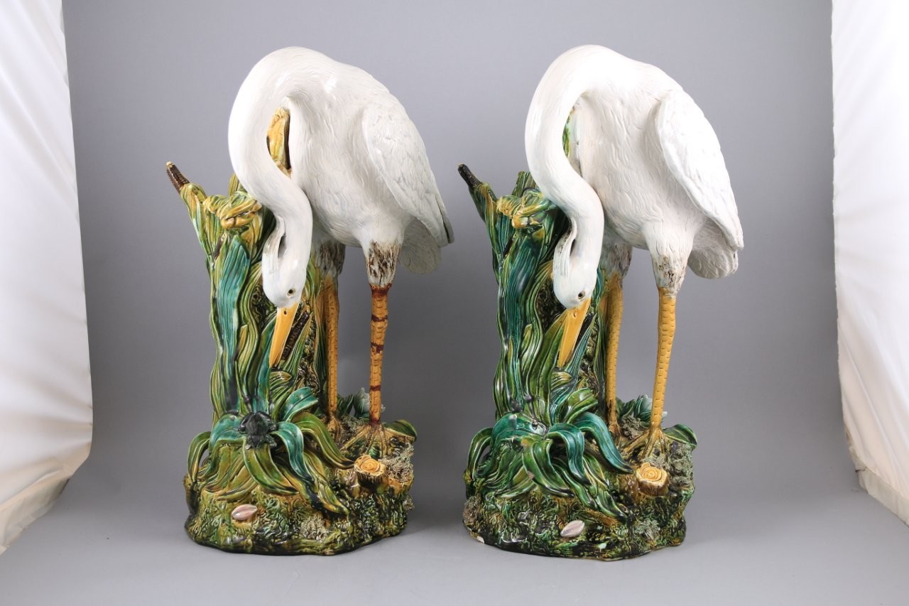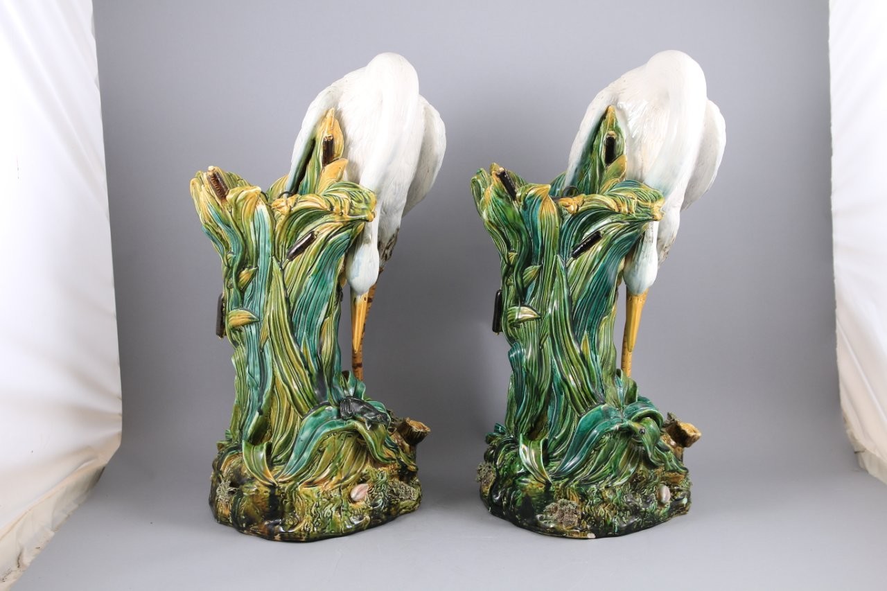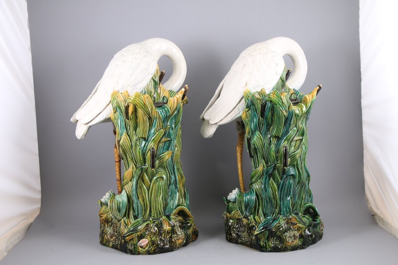 Notre paire de porte-parapluie s'inscrit parmi la production de la seconde moitié du XIXe siècle, parmi lesquelles se retrouvent les réalisations de Delphin Massier à Vallauris ou Paul Colomera à Choisy-le-Roi. L'un comme l'autre proposent des compositions où se mêlent des hérons dans un environnement de végétation aquatique. Ce thème dépasse les frontières pour se retrouver également en Angleterre, à la manufacture de Minton.