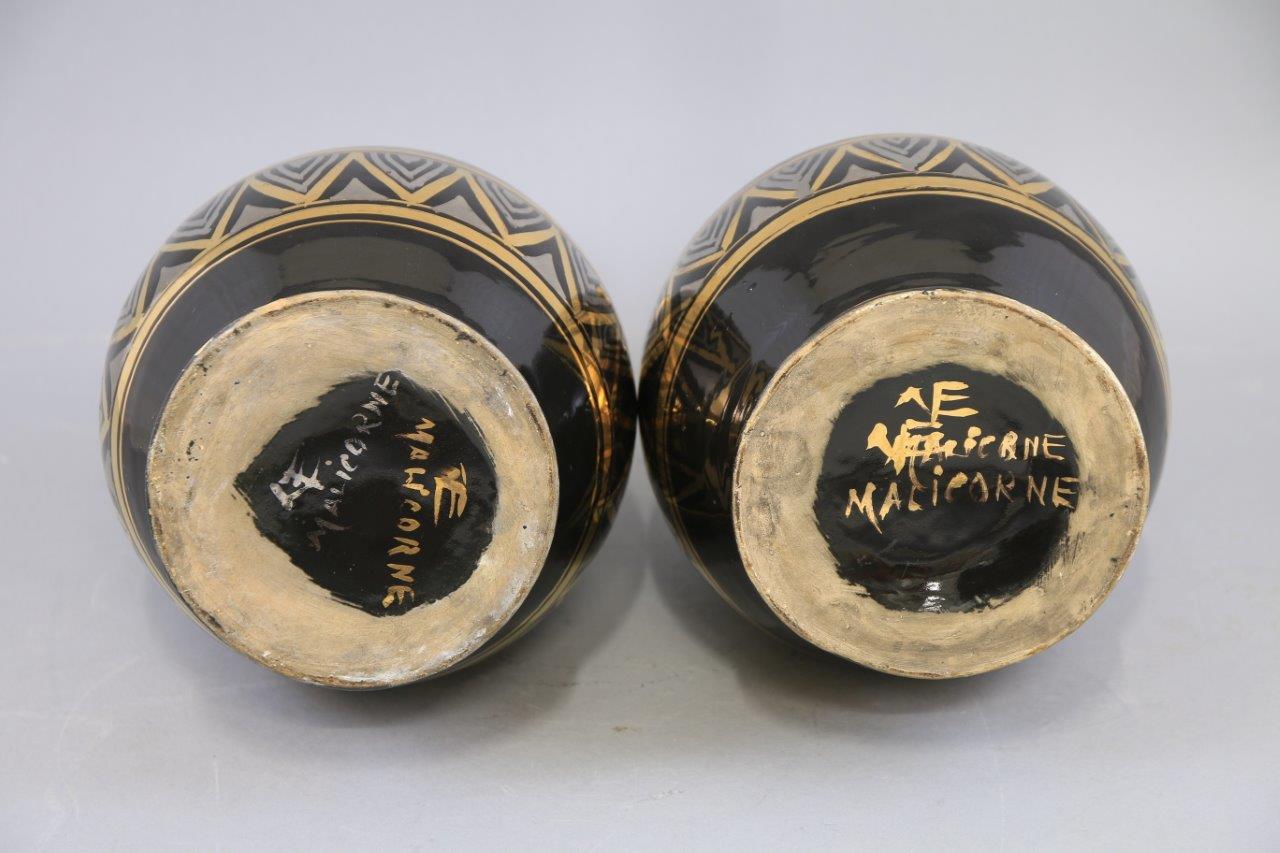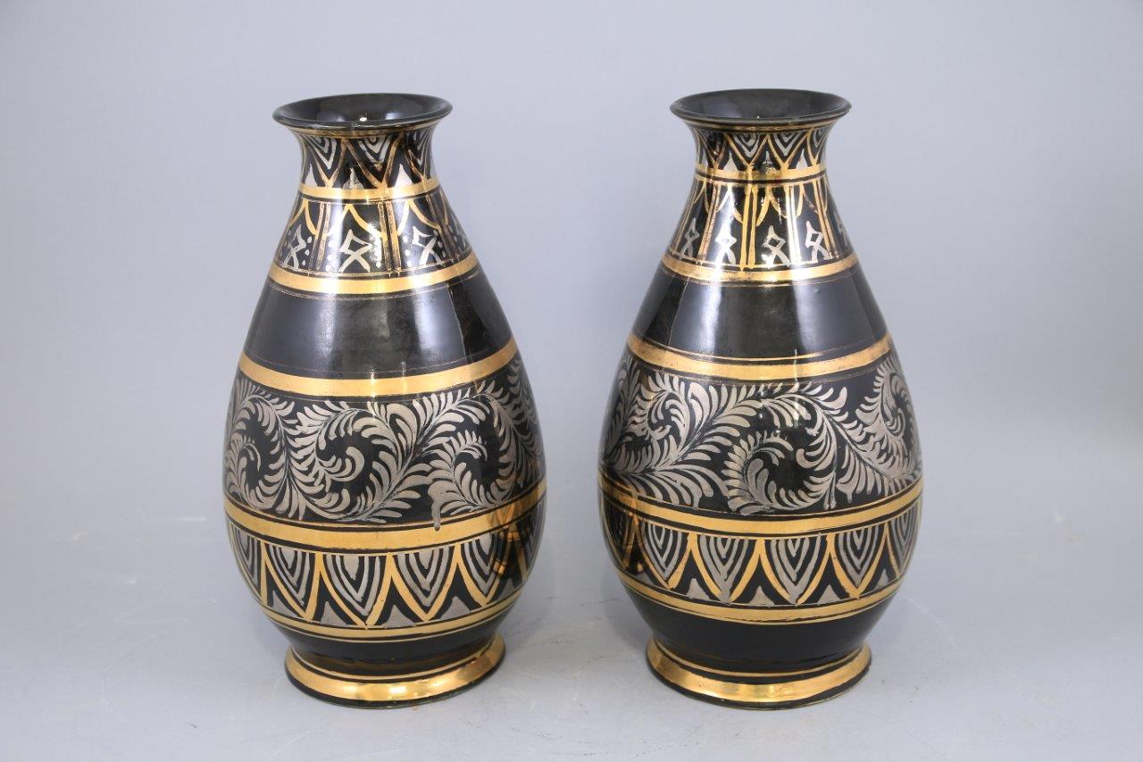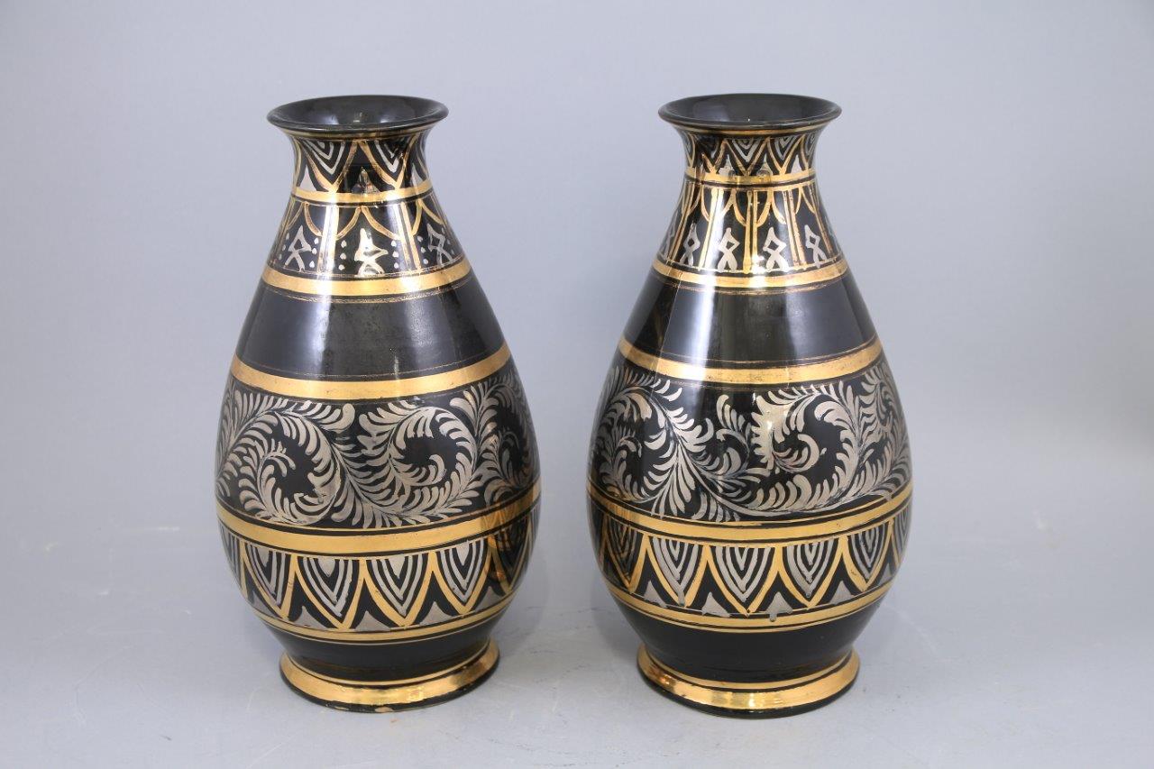 en faïence noire à décor d'enroulements végétalisés, chevrons, figures géométriques et feuilles d'eau argentés et dorés. La lèvre et le pied évasés et rehaussés d'un filet doré.