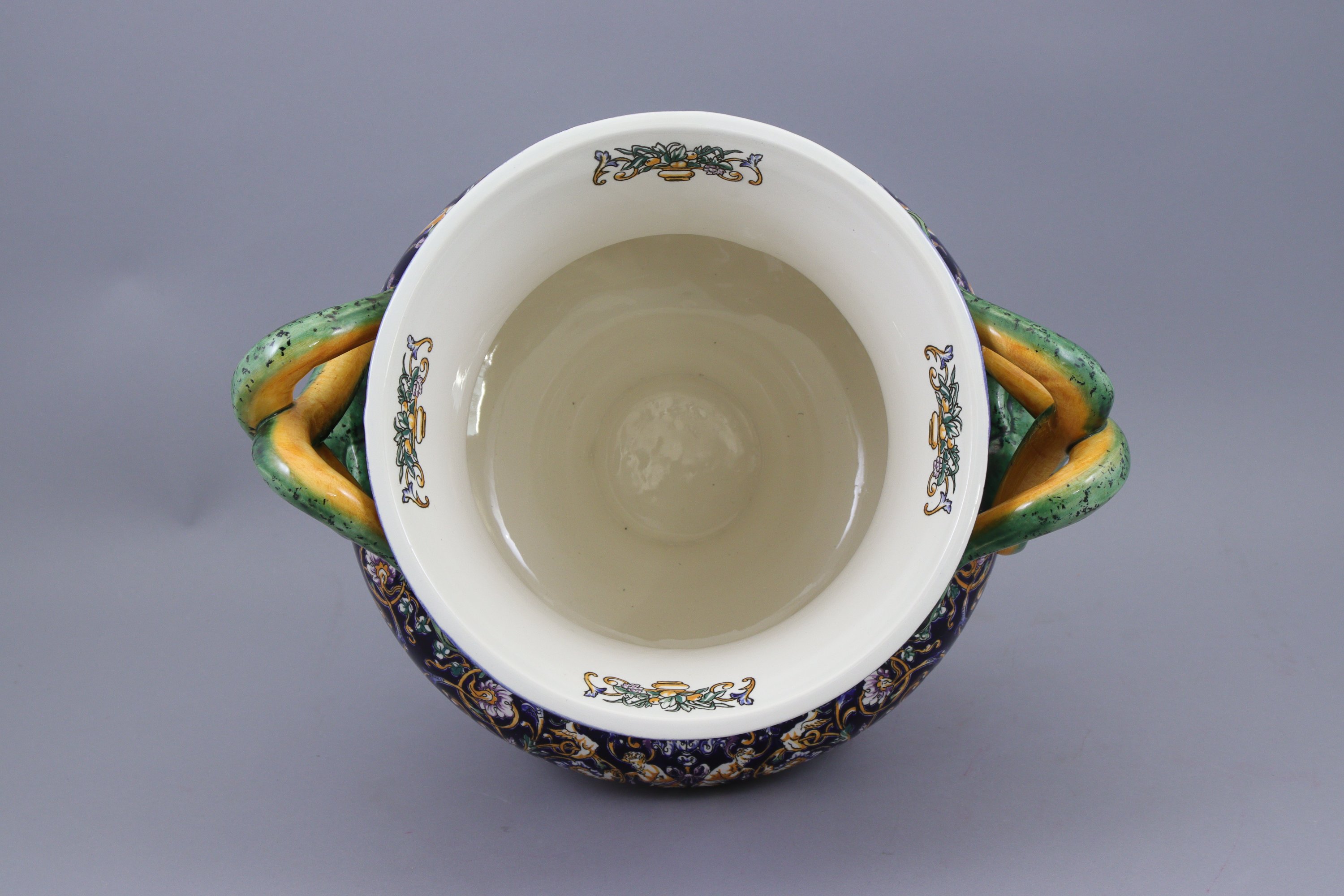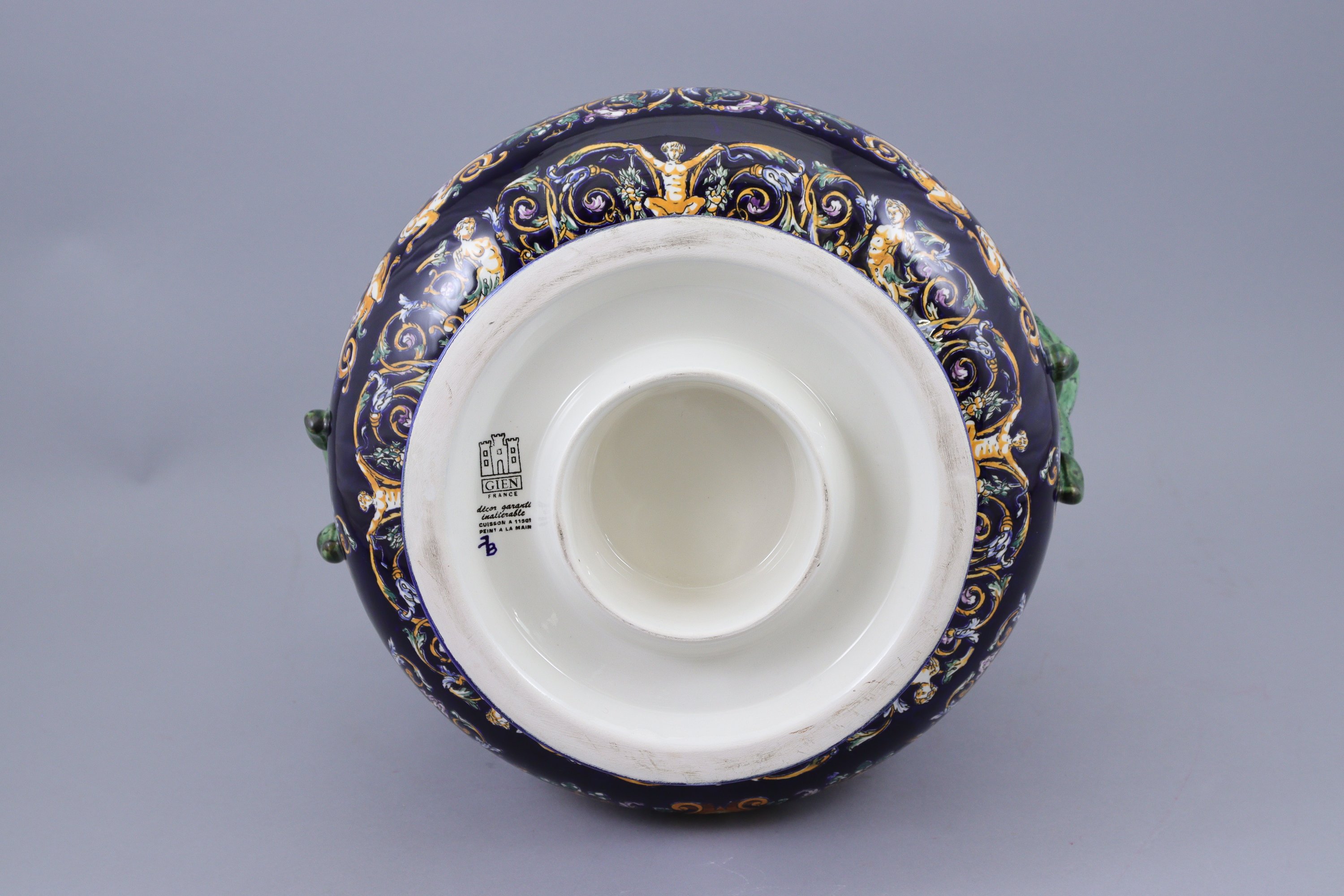 en faïence, à décor Renaissance sur fond bleu. L'intérieur est orné de paniers fleuris, le col de rinceaux et chimères. La panse est ornée d'un cuir au putto entouré de sphinges et rinceaux. Les deux anses en forme de serpents.