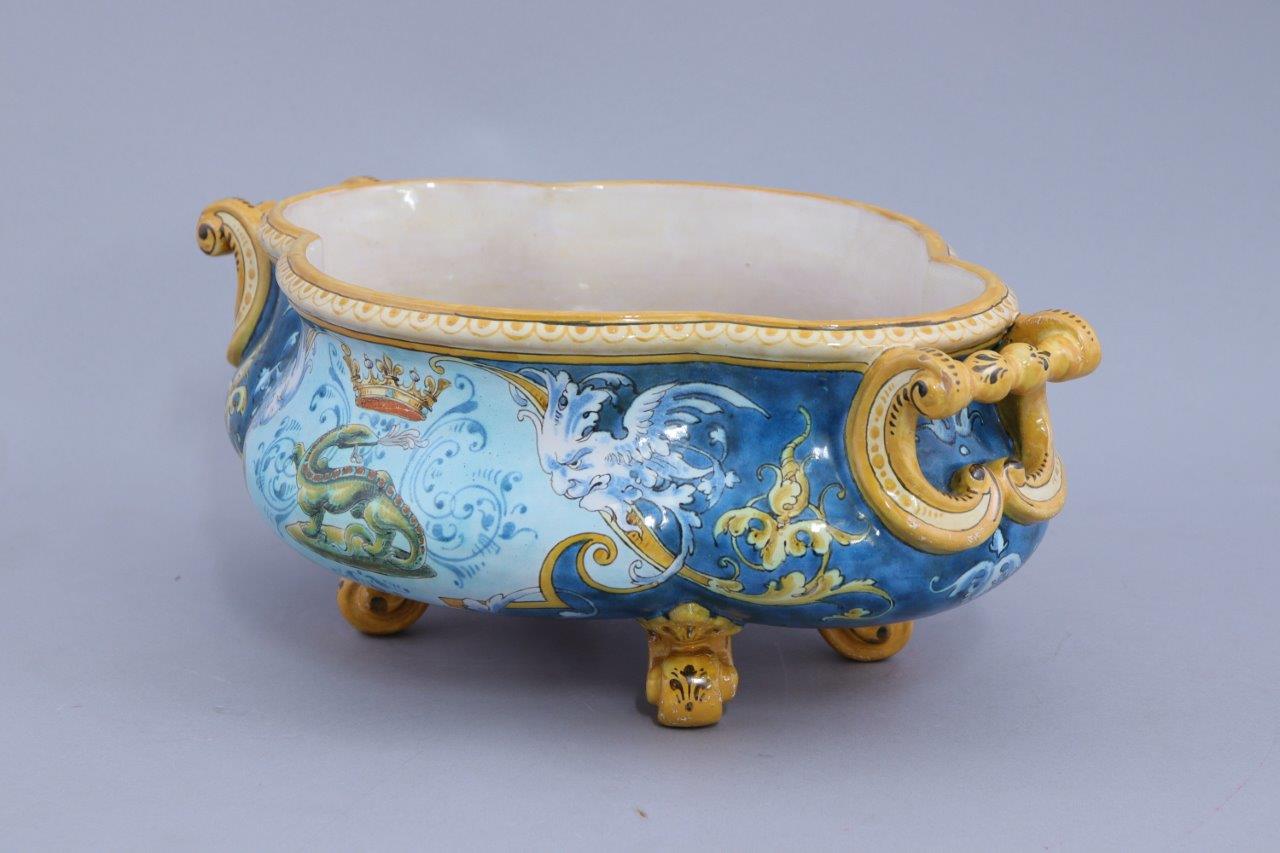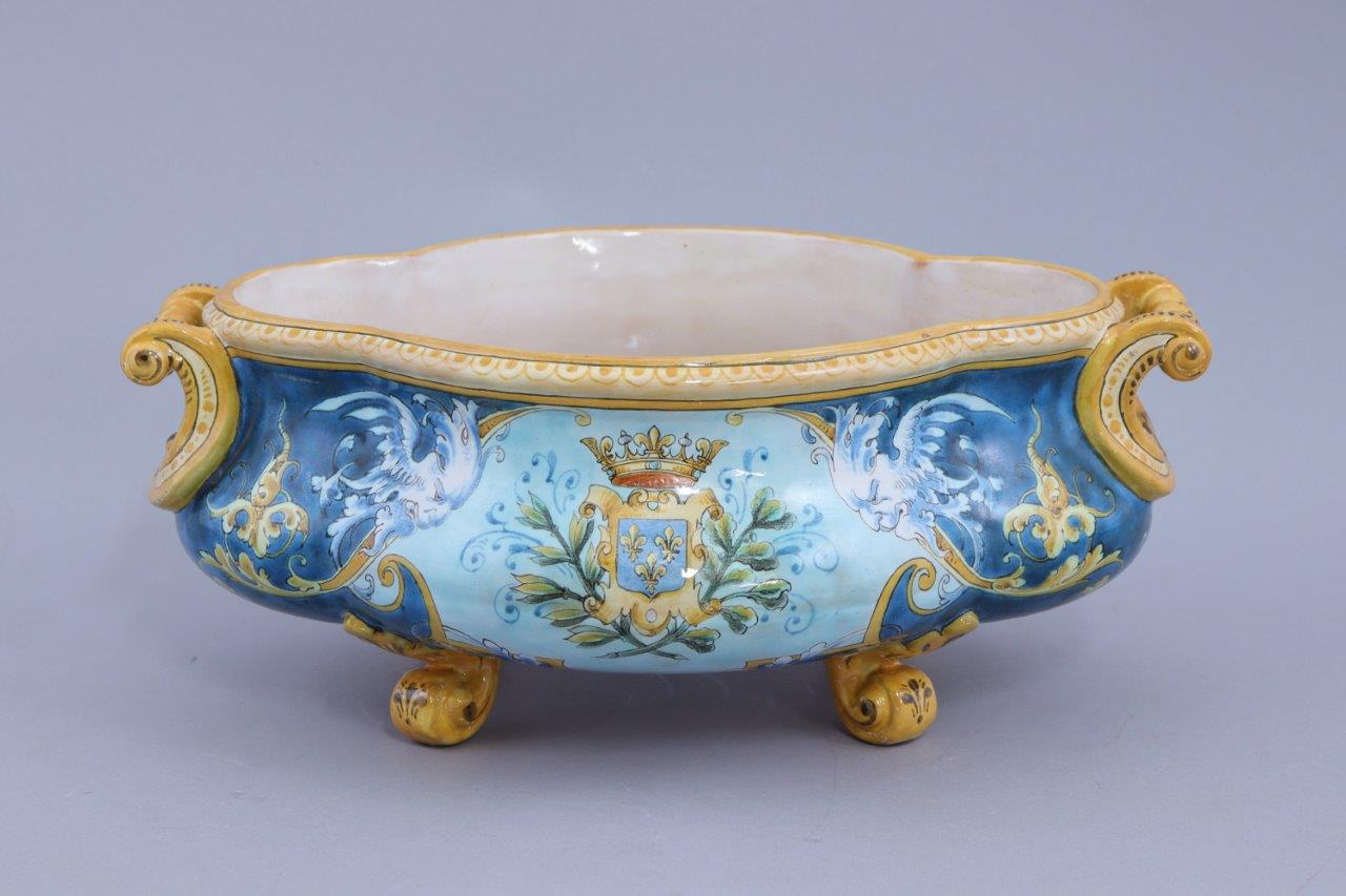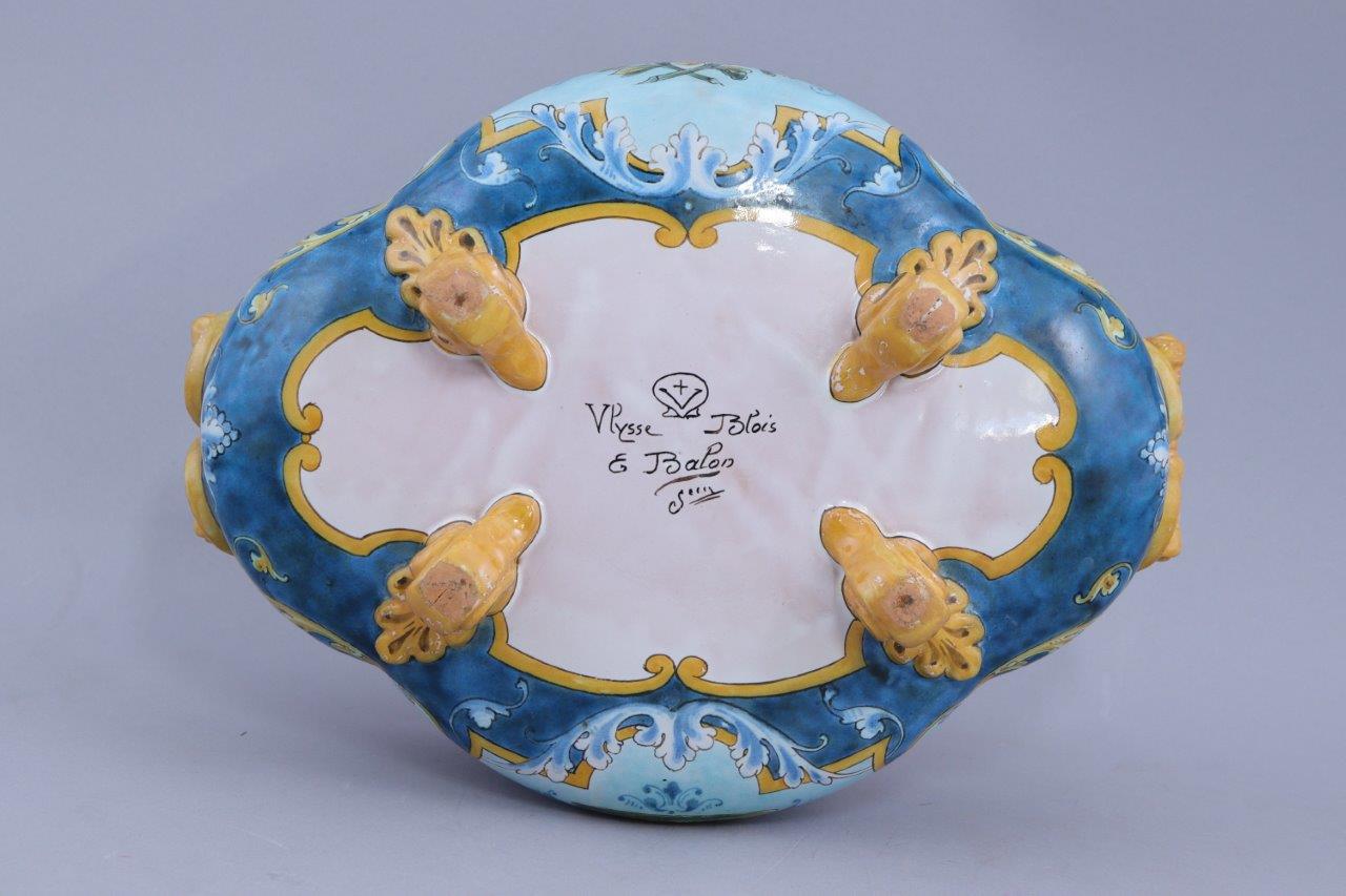 en faïence polychrome de forme quadrilobée à deux anses. La panse à décor sur une face d'un cuir aux armes de France entourée de feuilles de chêne dans un cartouche et sur l'autre d'une salamandre sous une couronne. Elle repose sur quatre pieds en enroulements.