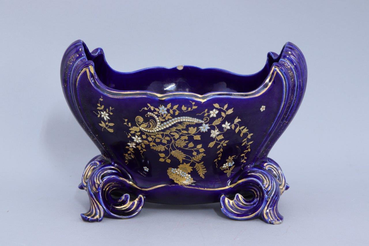 Joint: Jardinière en faience bleue de forme oblogue à la lèvre contournée, la panse décorée d'une branche fleurie réhaussée de pastilles blanches et turquoises. Quatre pieds rocailles. Haut. 20 Long. 29,5 Prof. 18 cm. (égrenures).