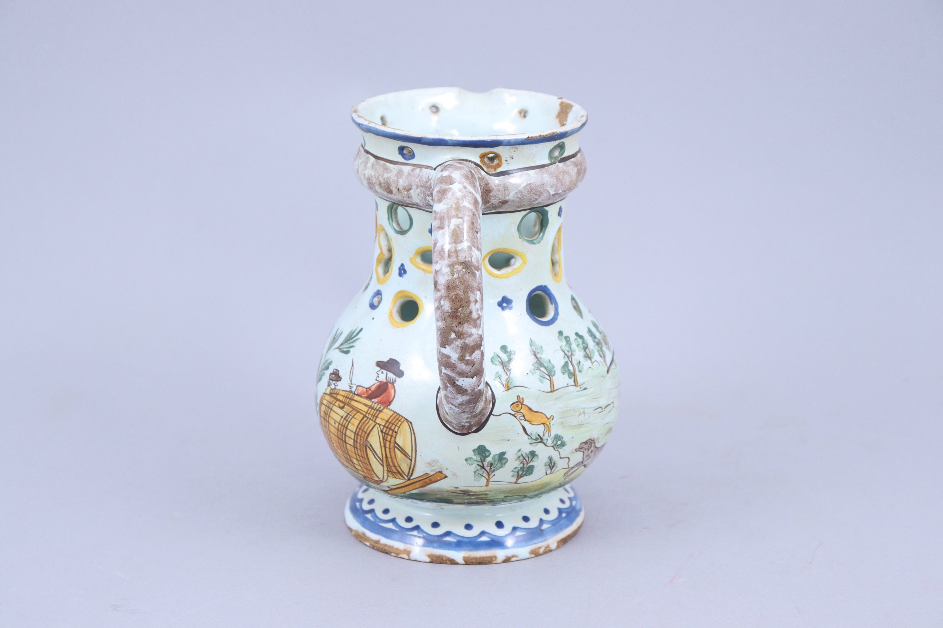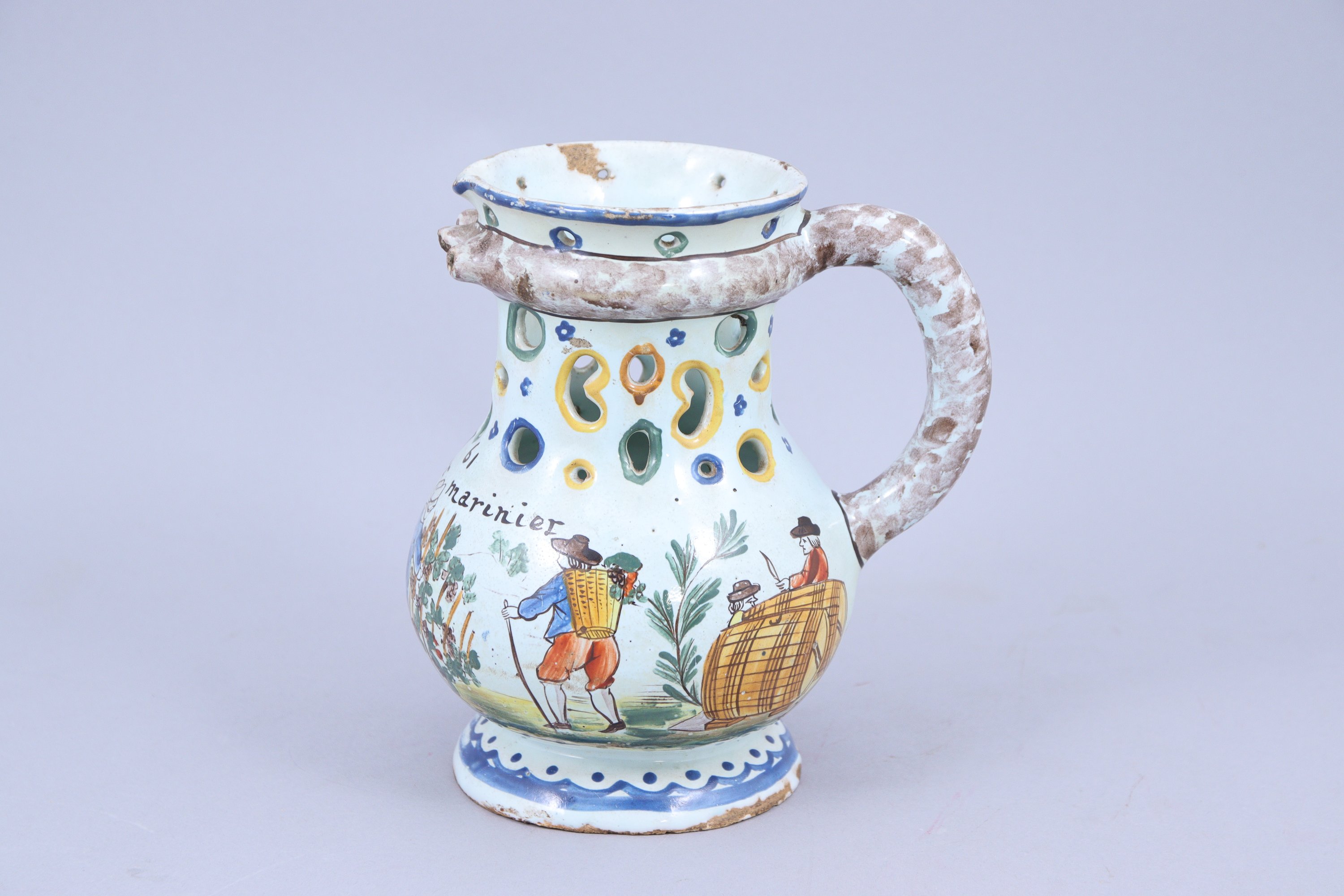 en faïence ajourée et émaillée. A décor polychrome d'une chasse au lapin et d'un groupe de vendangeurs. Porte une mention "Jacque Garnier Marinier 1761".