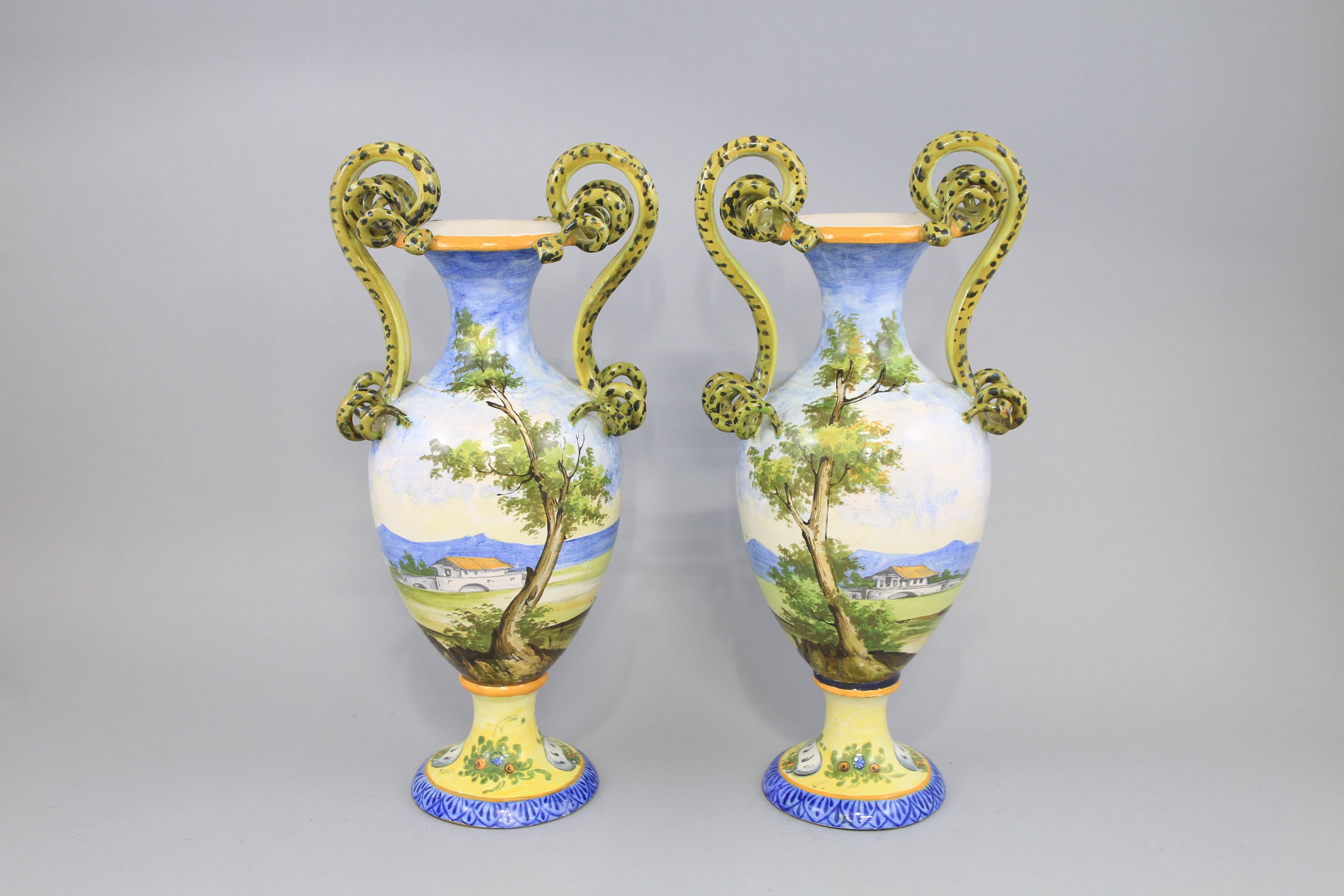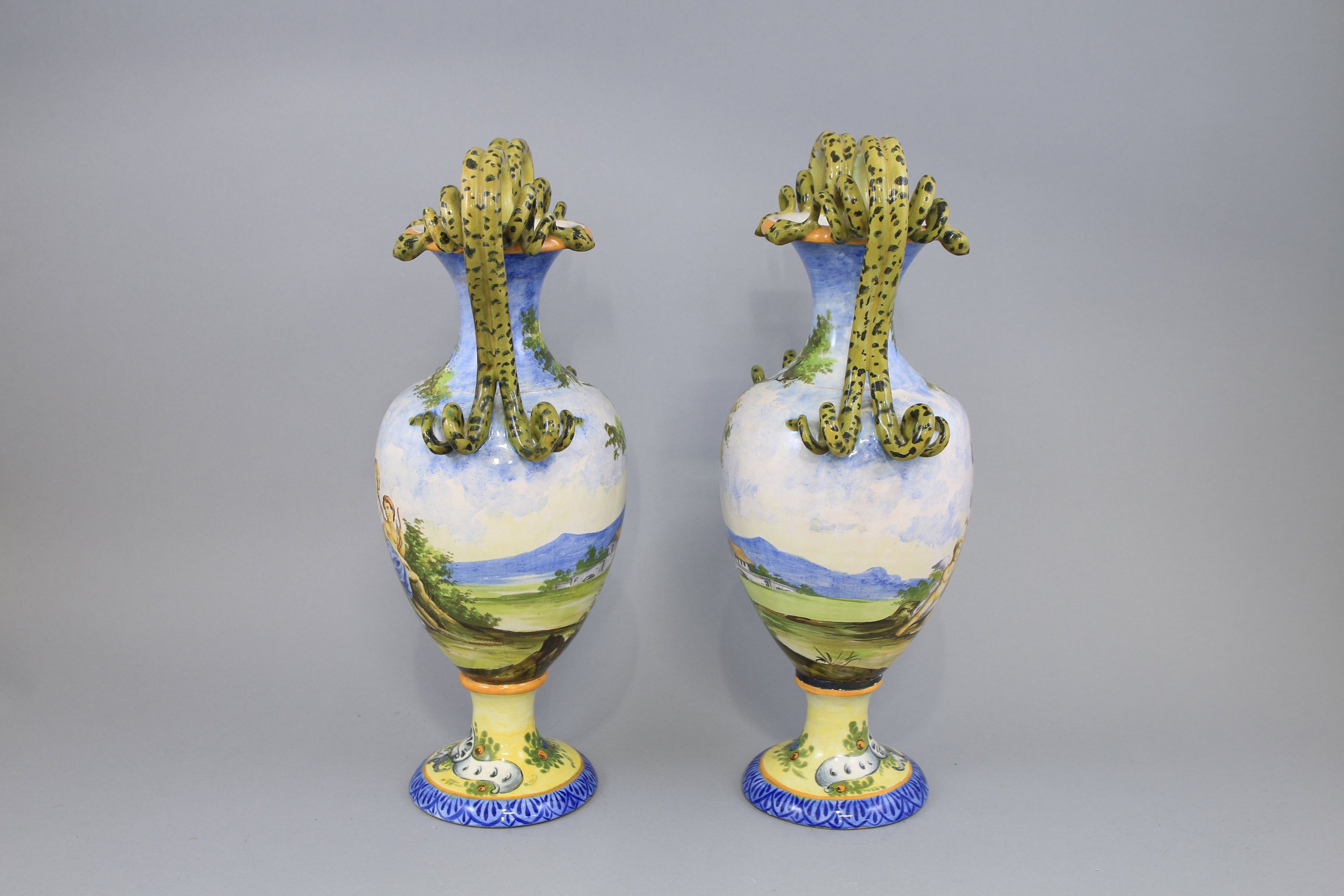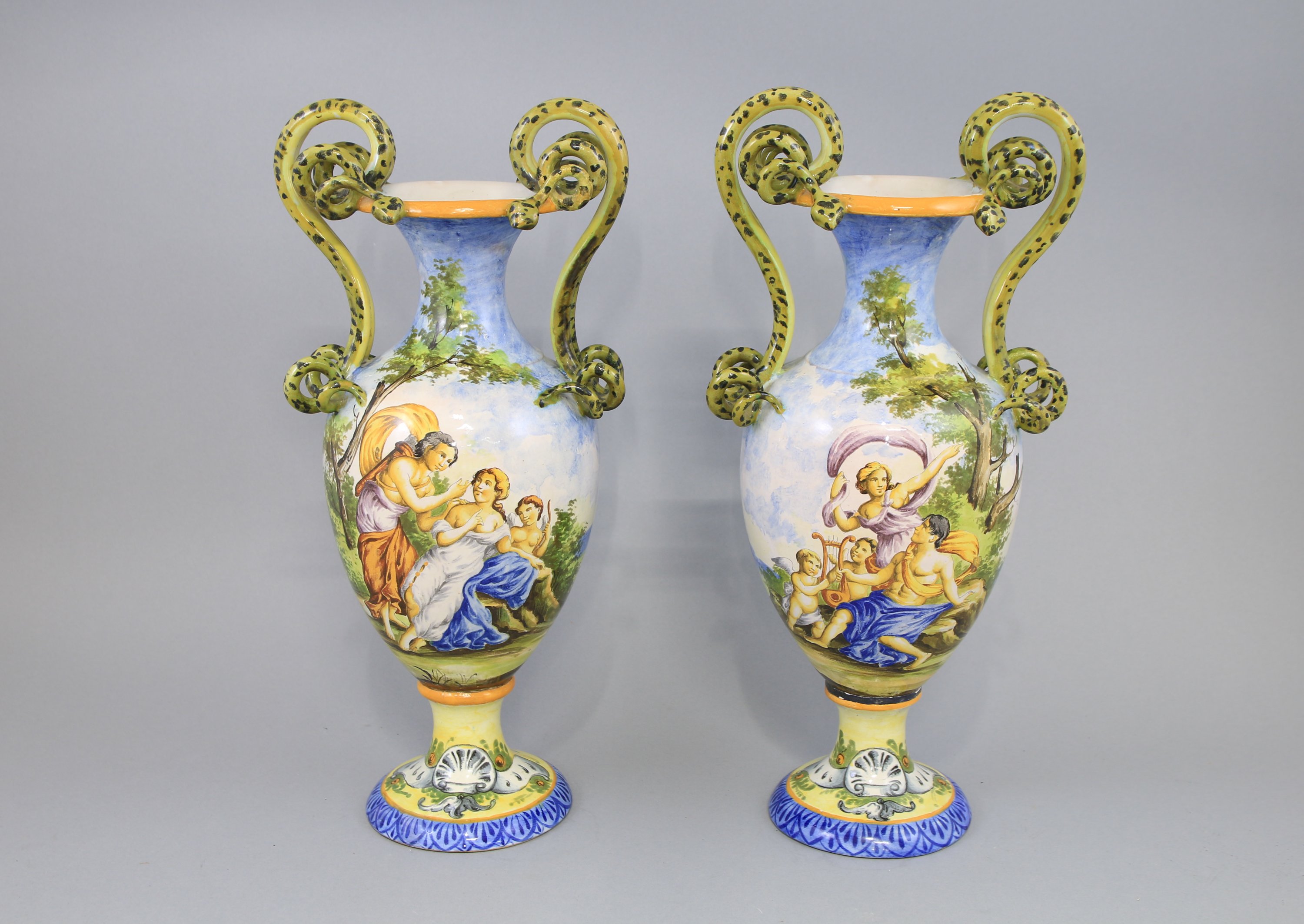 en majolique polychrome, à anses en forme de serpents enroulés. Les cols sont évasés et les panses décorées de scènes mythologiques. Ils sont terminés par des piédouches ornés d'une coquille entourée de phylactères.