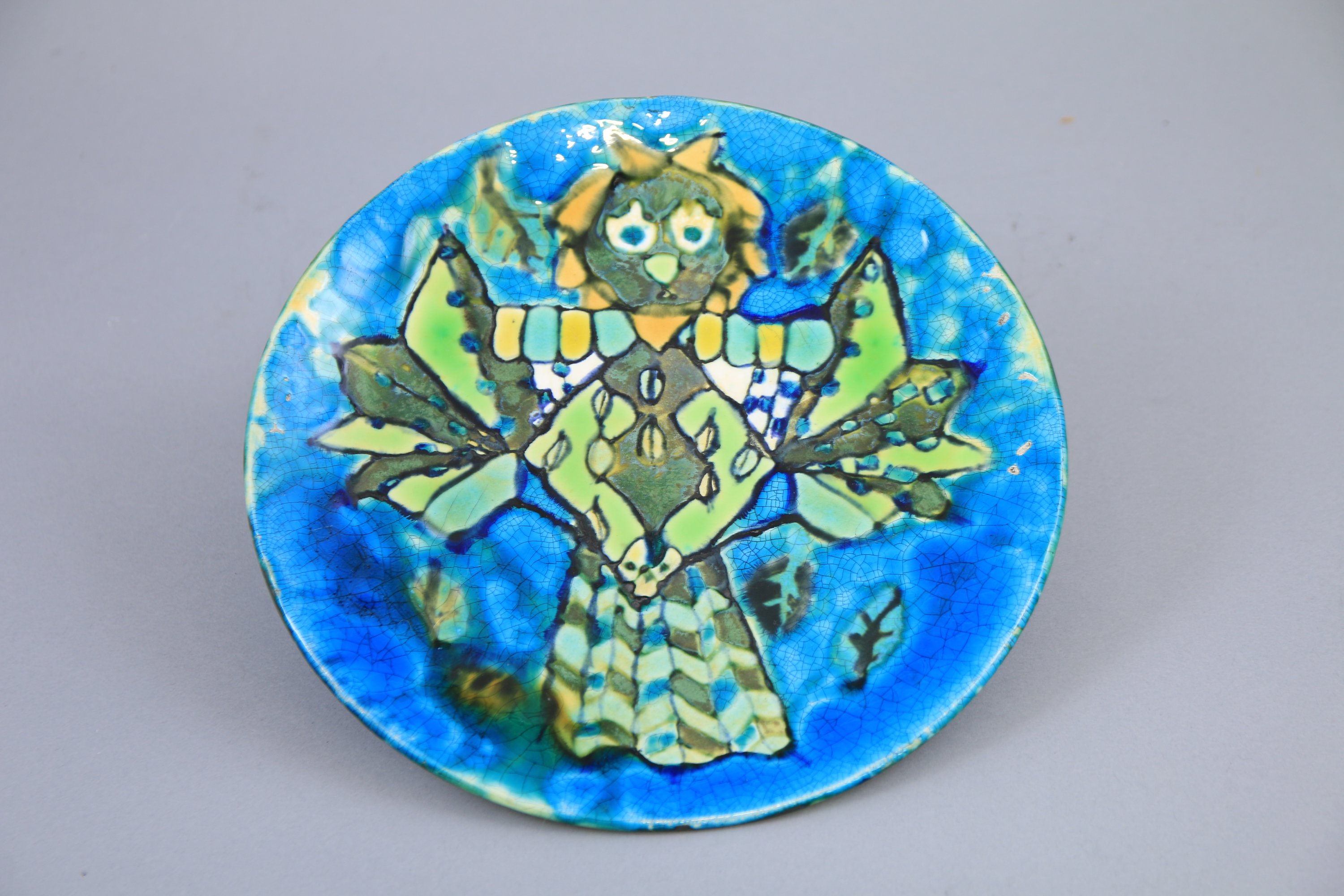 en faïence polychrome à décor d'un oiseau sur fond bleu.