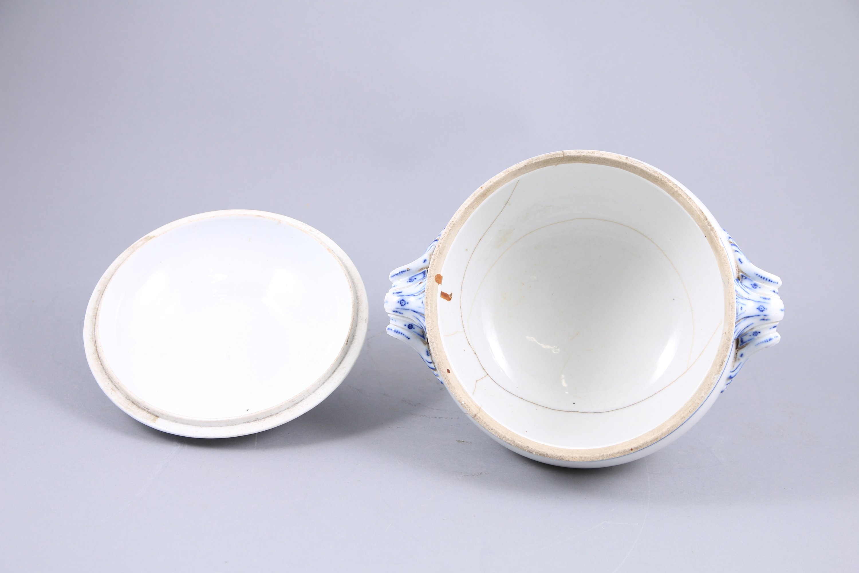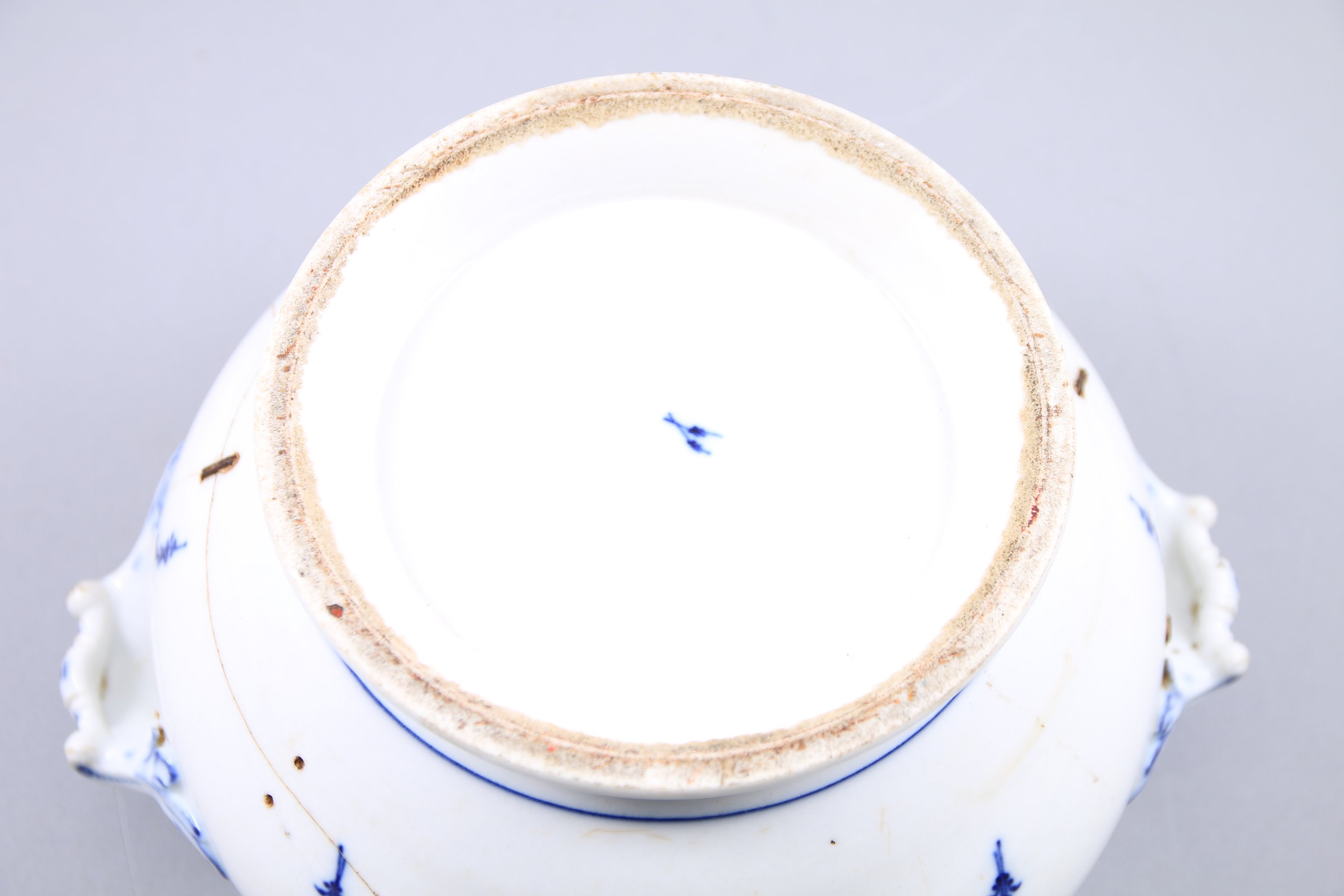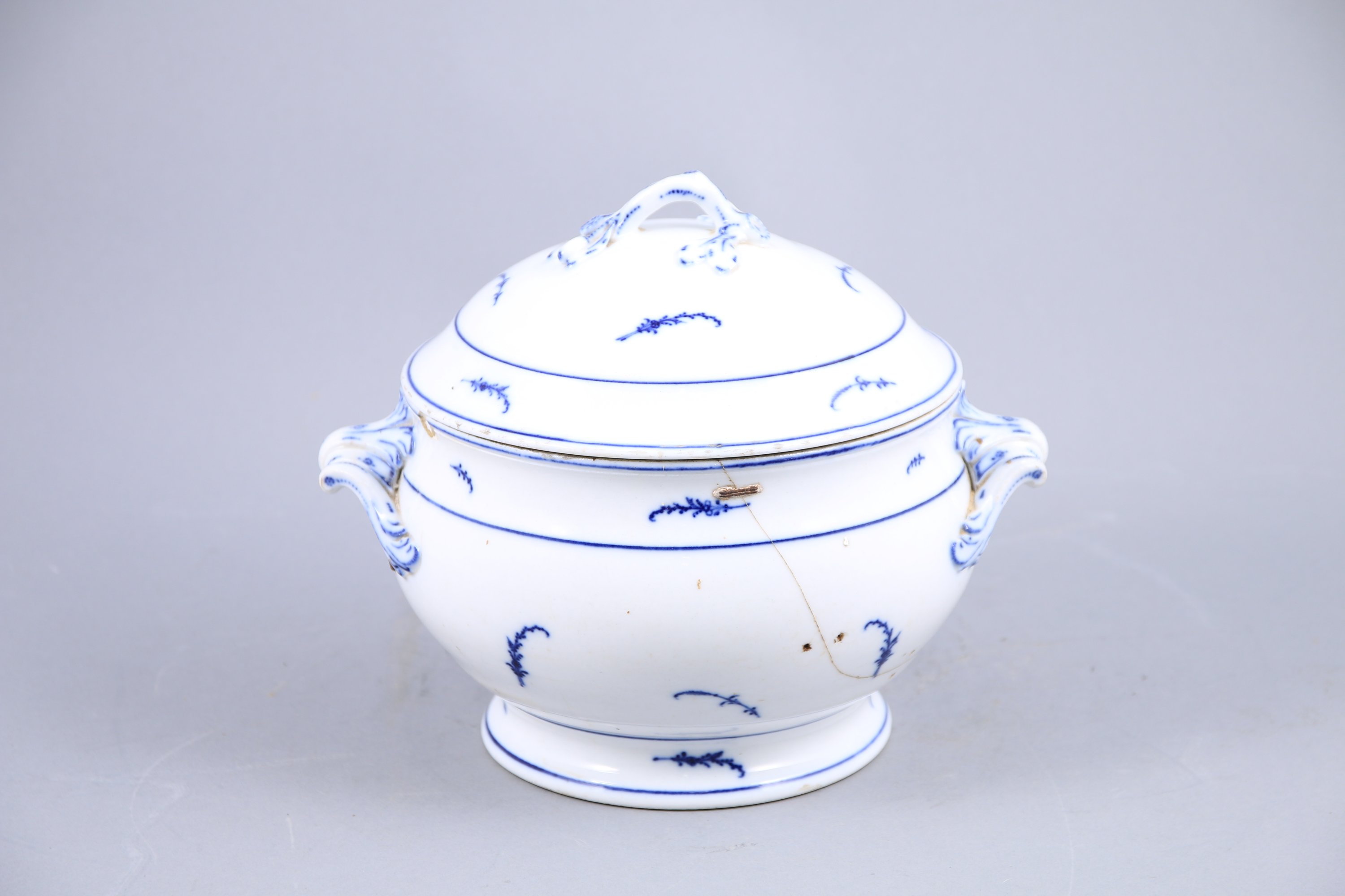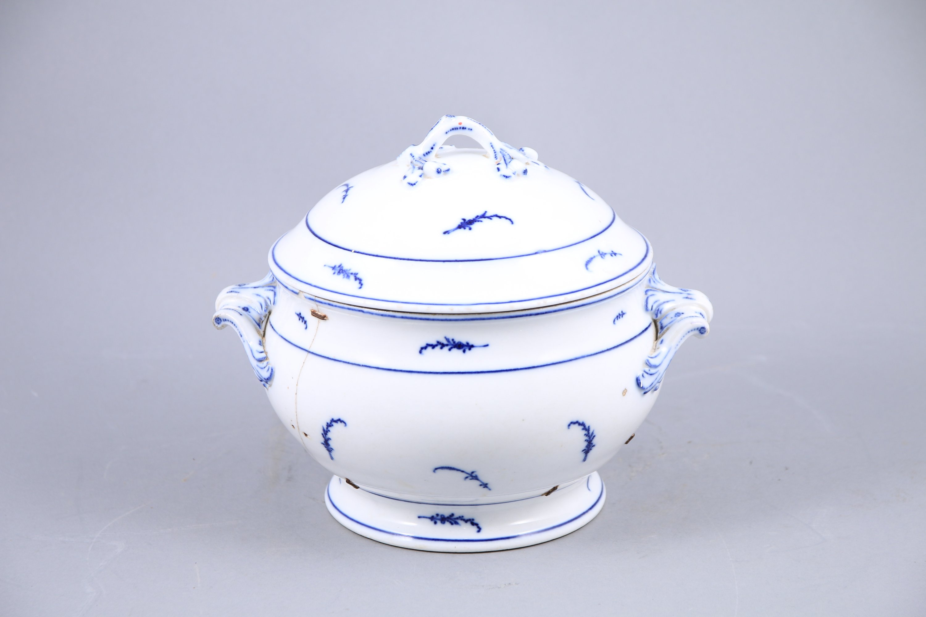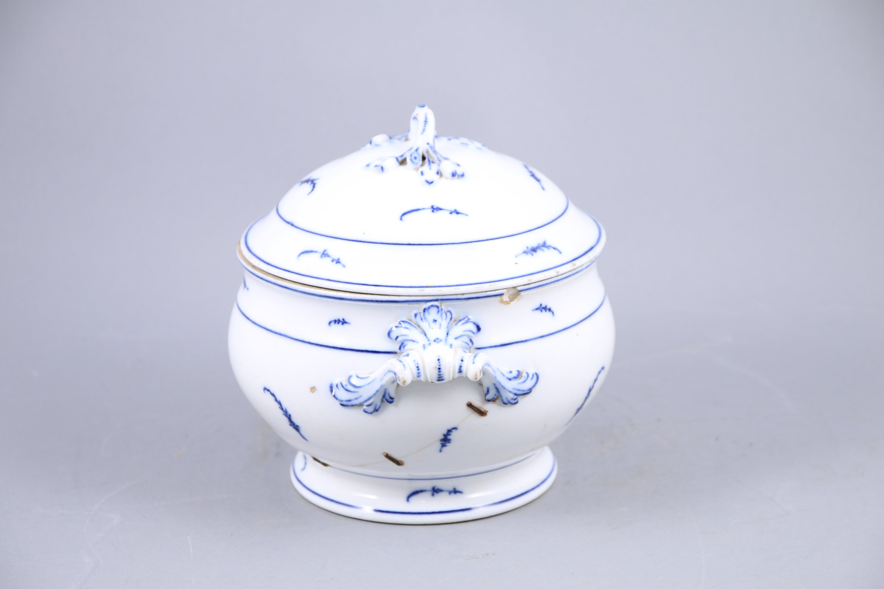 en porcelaine au décor dit "à la brindille". Le couvercle à une prise ornée de feuilles et glands. Deux anses ornées de feuilles d'acanthe et enroulements.