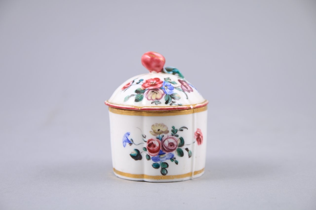 en porcelaine blanche et polychrome de forme polylobée à décor de bouquets de fleurs. Le couvercle au fretel en forme de fruit.