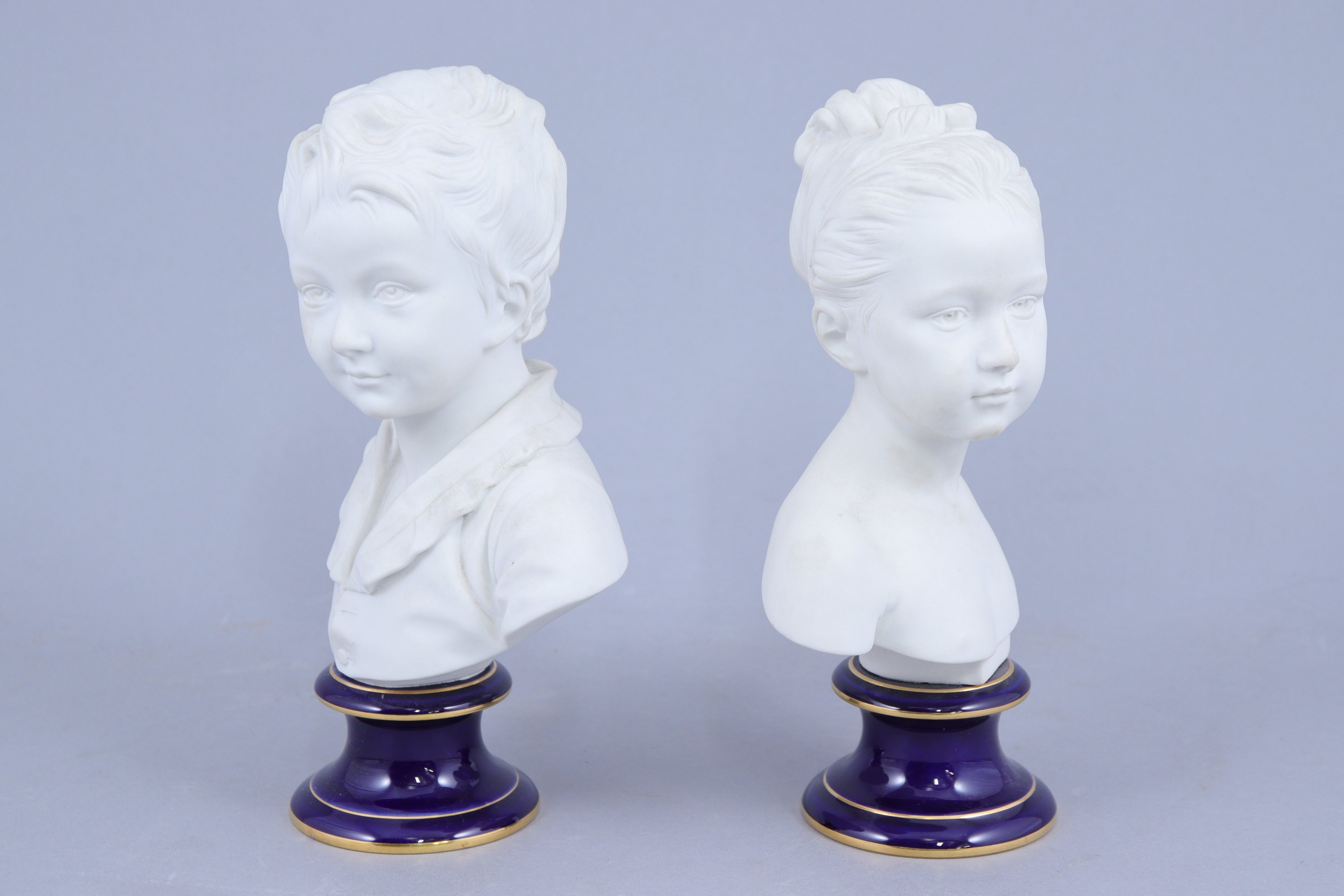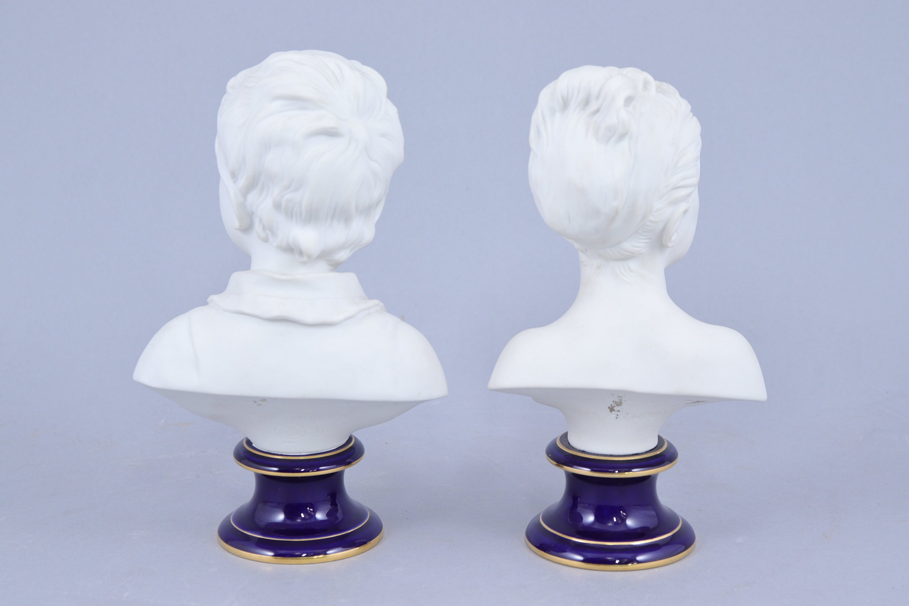 Deux bustes en biscuit reposant sur des piédouches en porcelaine bleue de Sèvres et filets dorés.