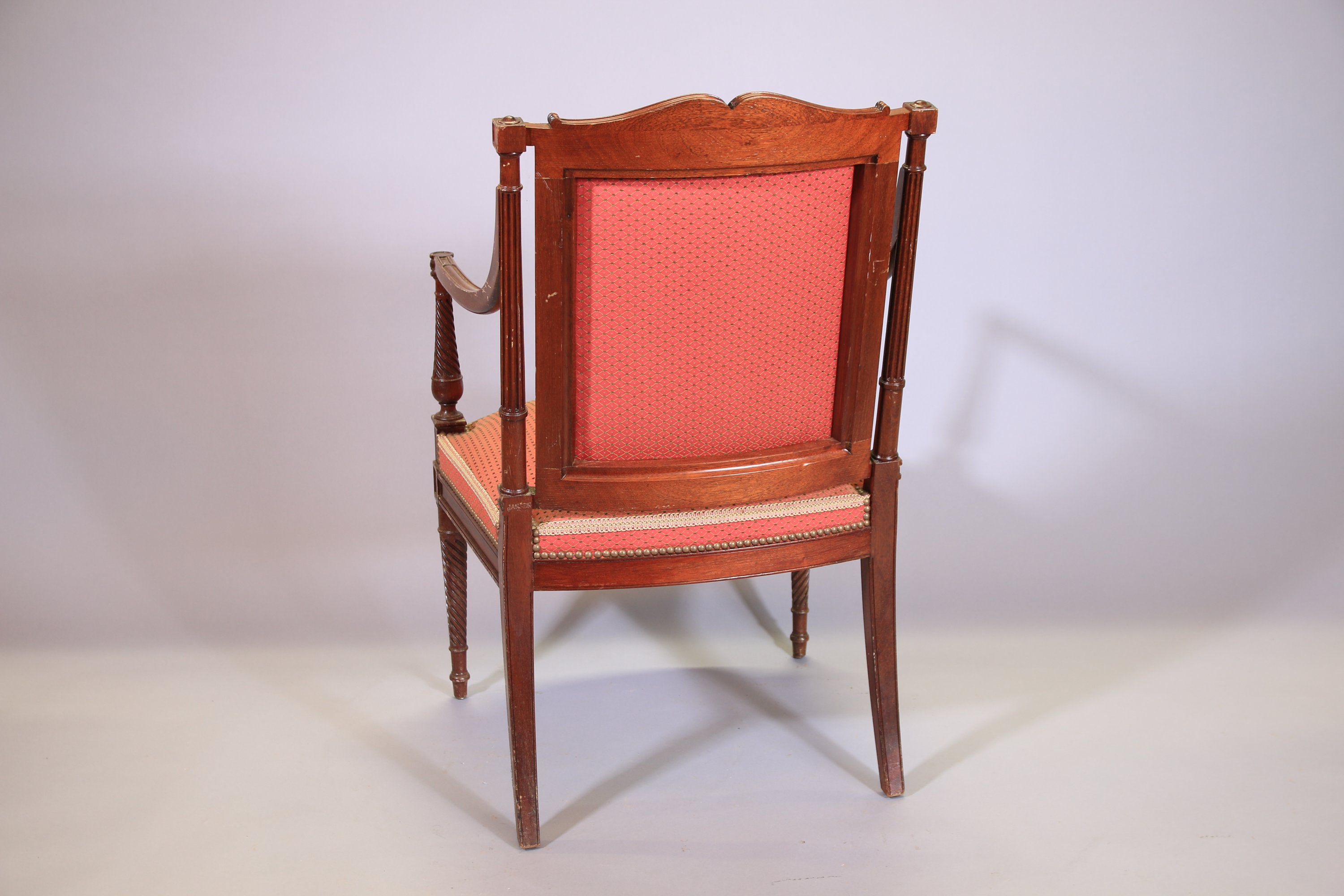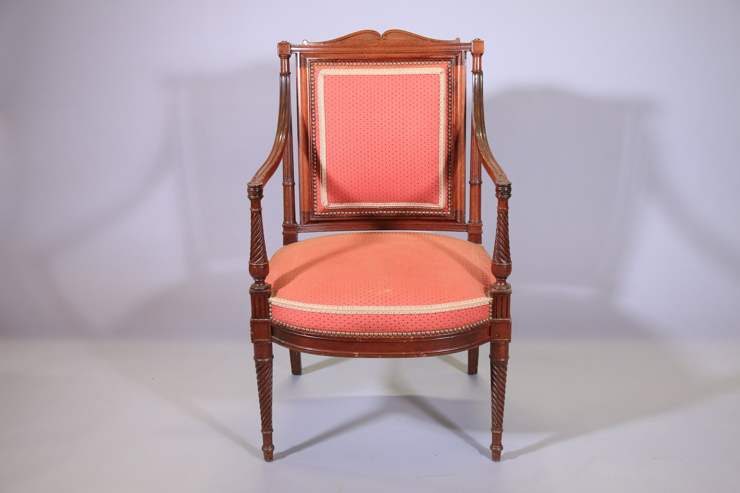 en acajou et placage d'acajou. Dossier ajouré surmonté de volutes, montants cannelés, accotoirs terminés par des colonnes torsadées et ceinture mouvementée. Il repose sur quatre pieds, les antérieurs fuselés et torsadés, les postérieurs en sabre.