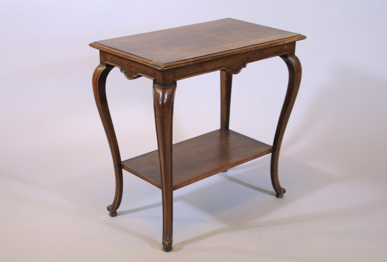 en chêne vernis. Le plateau mouluré et la ceinture mouvementée, elle repose sur quatre pieds galbés terminés par des enroulements et réunis par une tablette d'entrejambe.