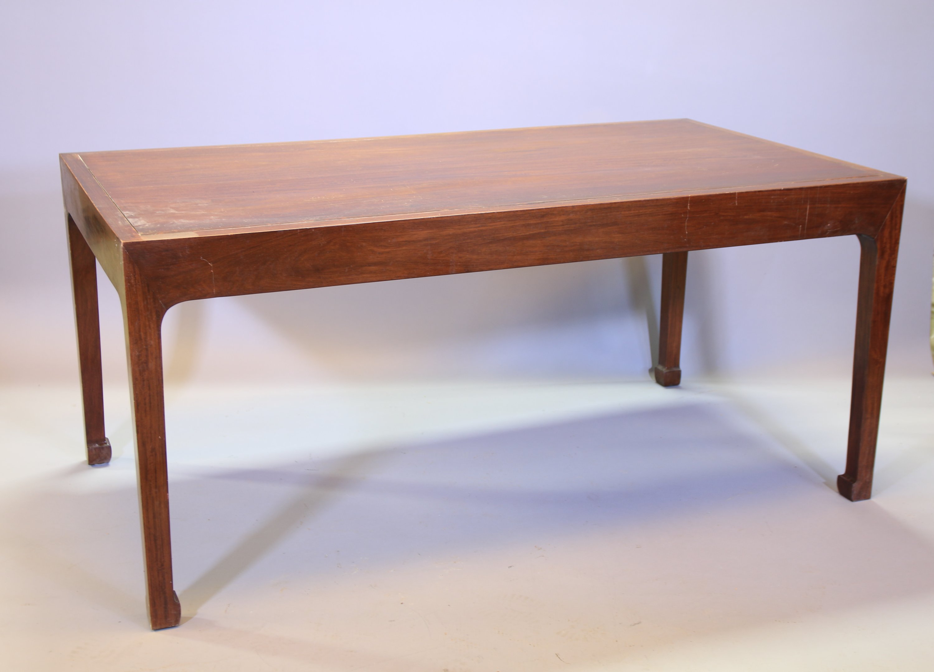 en palissandre et placage de palissandre. Il ouvre par trois tiroirs en ceinture et repose sur quatre pieds en gaine.