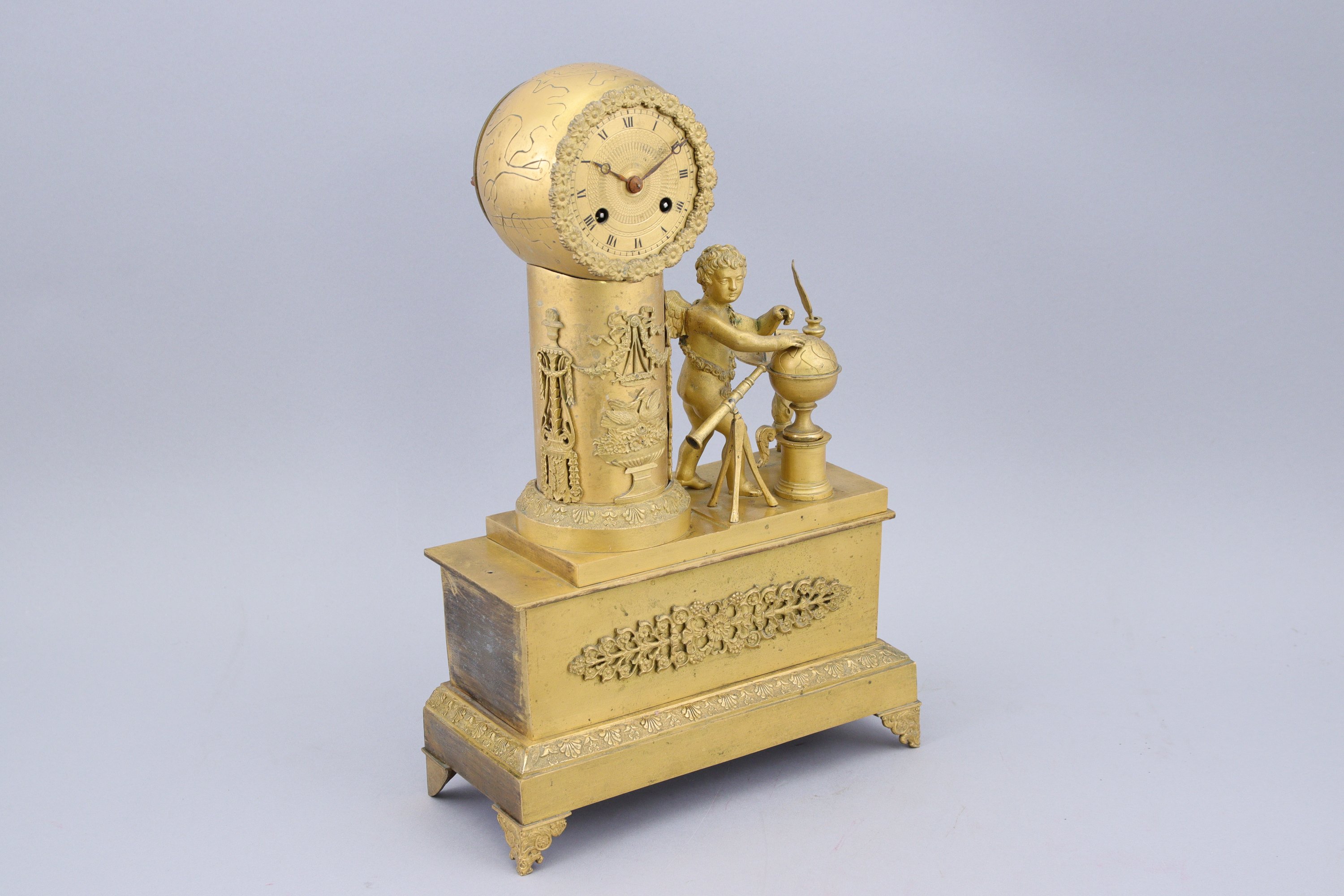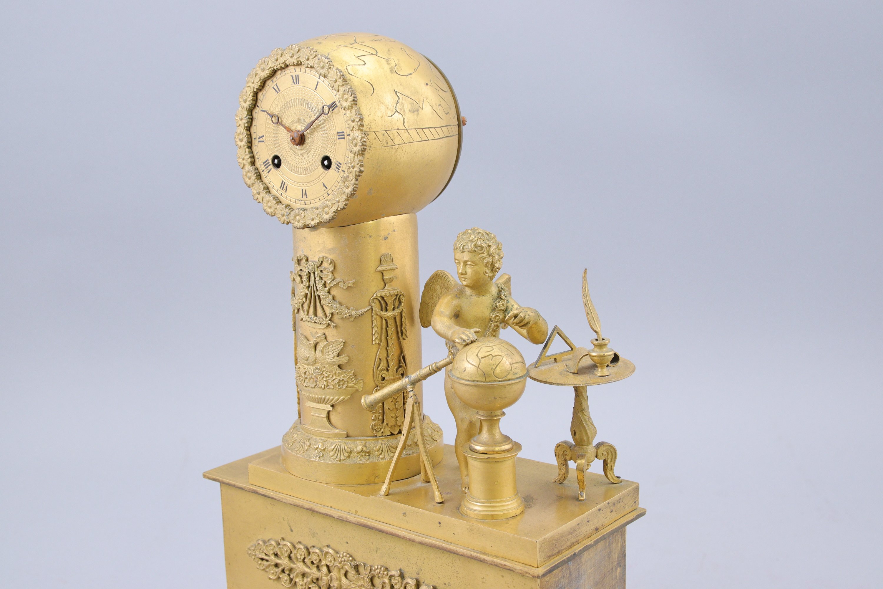 en bronze doré, à cadran en forme de sphère indiquant les heures par des chiffres romains, les minutes par un chemin de fer. Il repose sur une colonne décorée de bas-reliefs aux oiseaux et guirlandes. Un Amour à la géographie dans un entourage d'instruments scientifiques. Elle repose sur une base rectangulaire à motifs feuillagés en bas-relief, soulignée d'une frise de palmettes. Quatre pieds en enroulements.