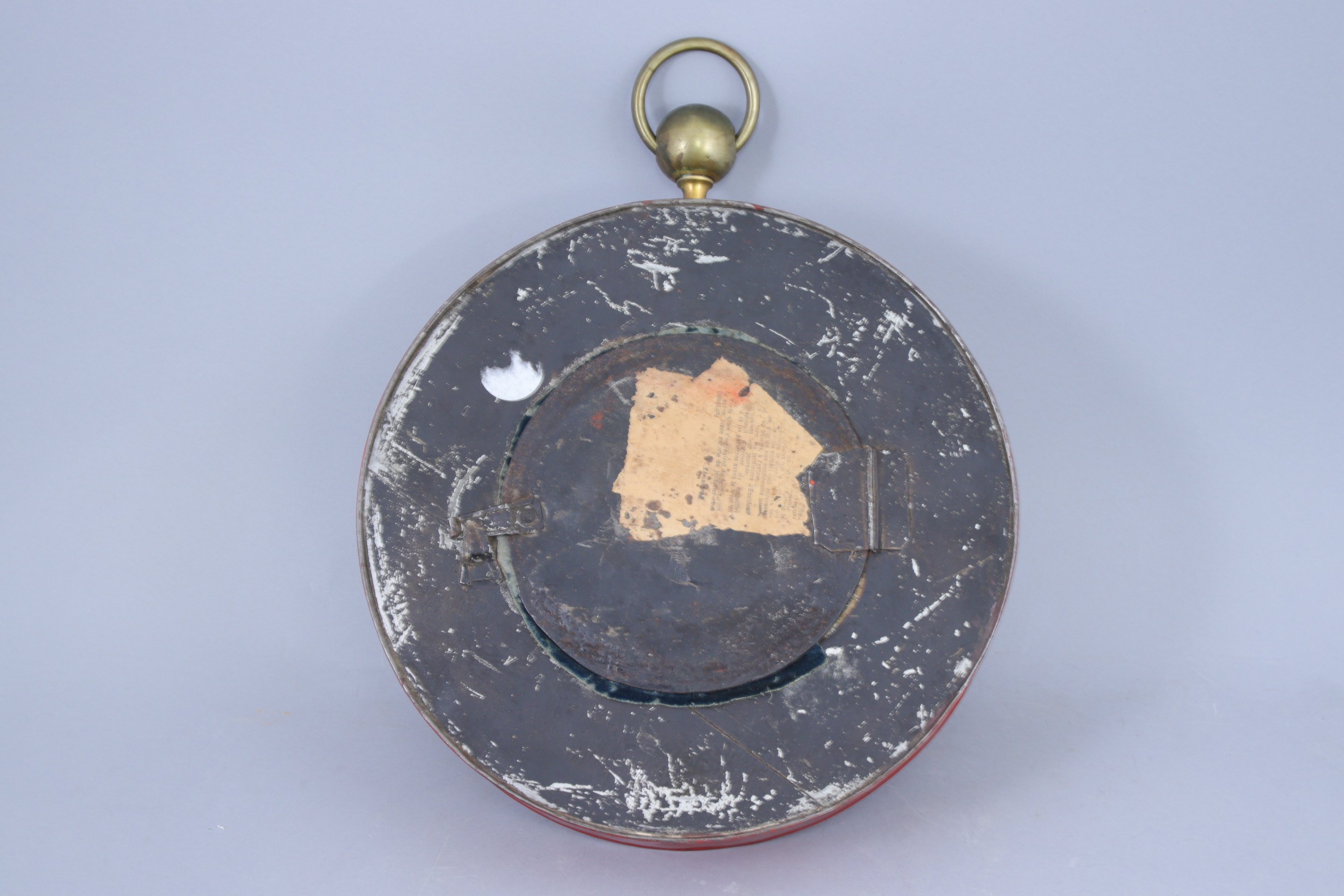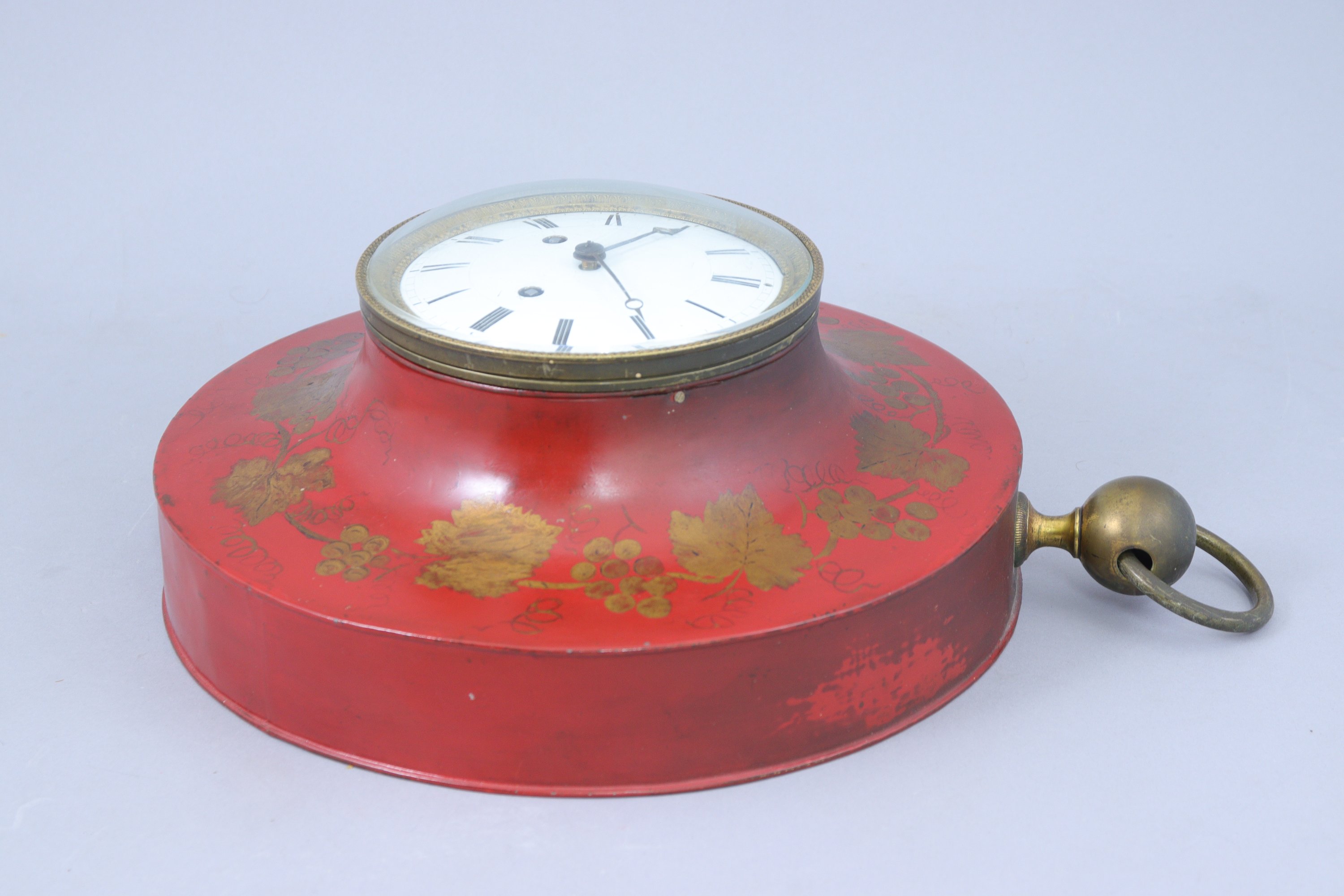 en tole laquée et laiton. Le cadran émaillé blanc indique les heures en chiffres romains, les minutes en chemin de fer. Elle est décorée par des pampres de vignes dorés sur fond rouge. Bélière en laiton en partie supérieure.