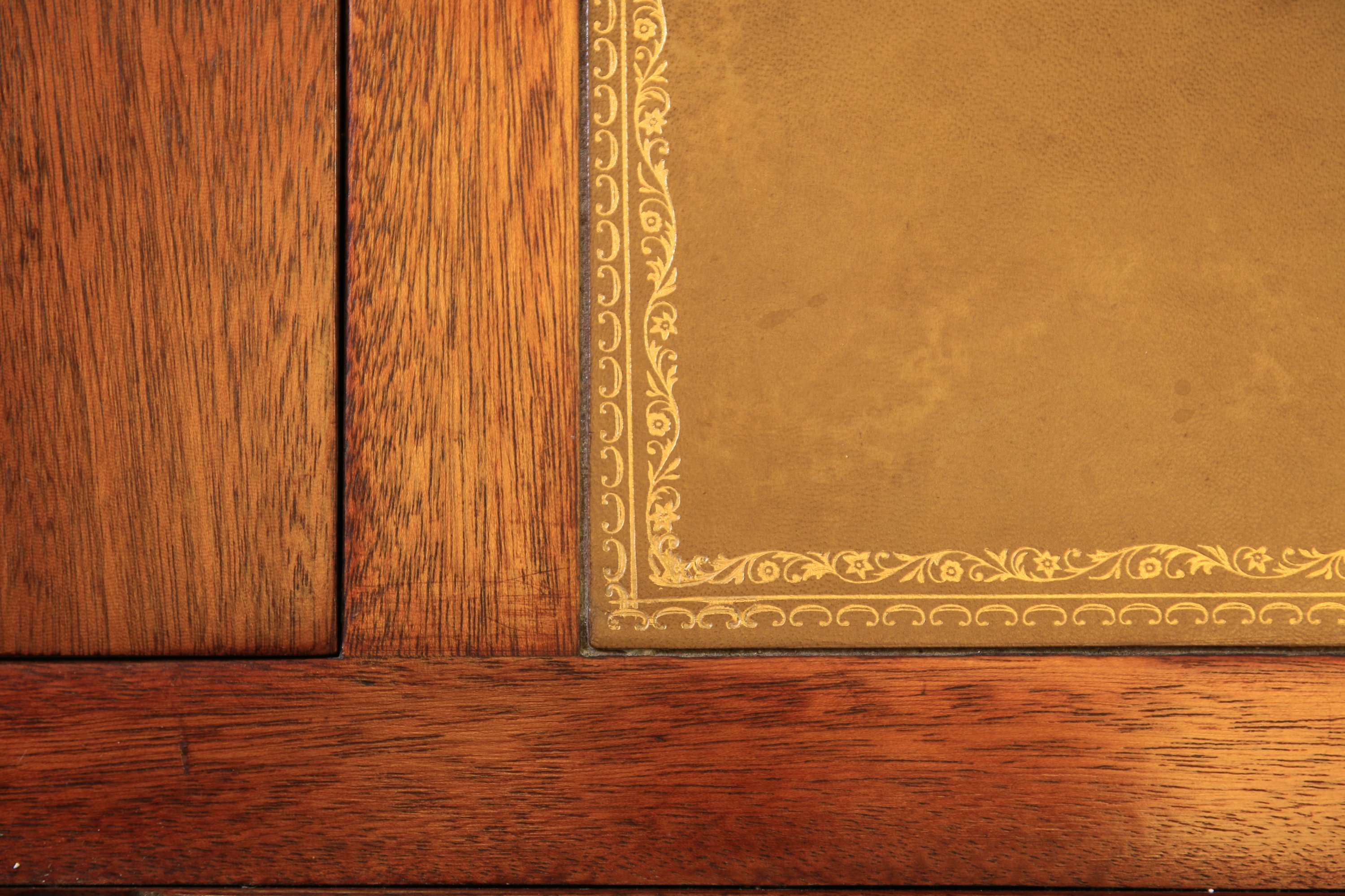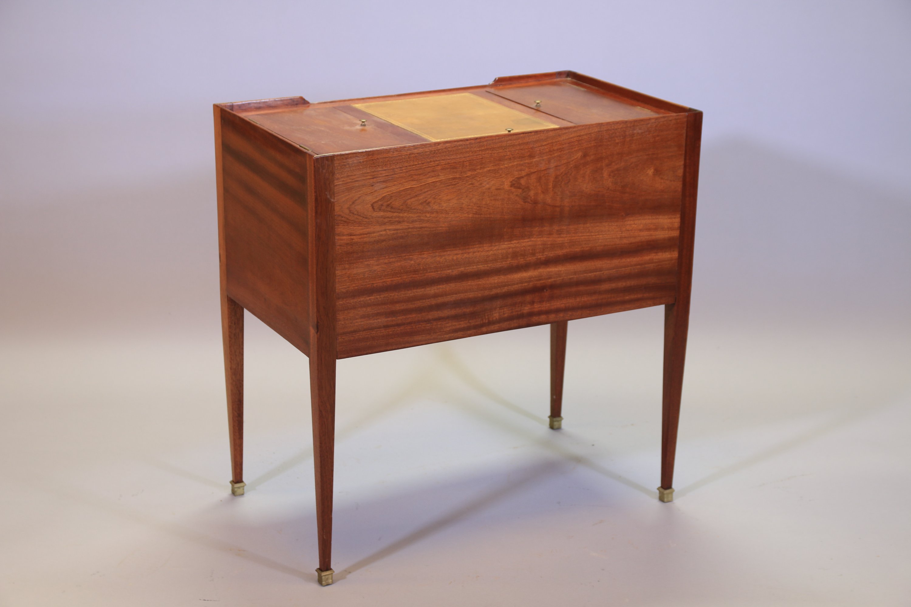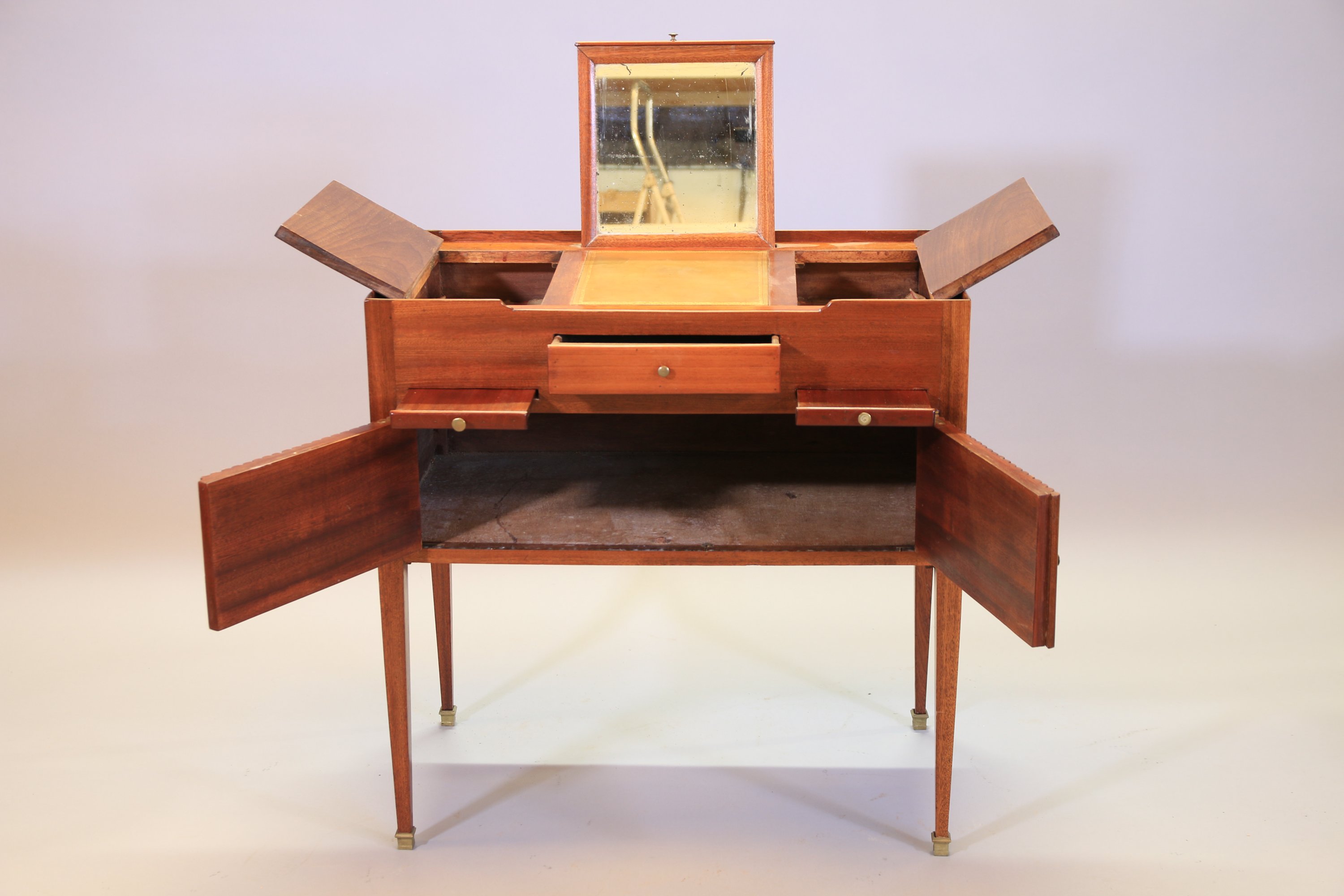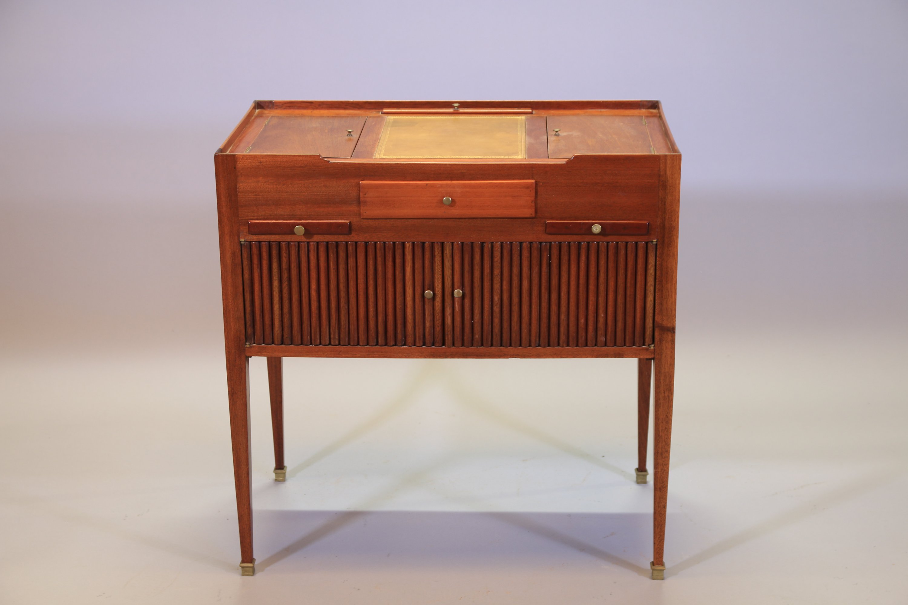 en noyer et placage de noyer. Le plateau cerclé d'une galerie et foncé d'un maroquin beige décoré aux petits fers. Il est coiffé d'un miroir escamotable et ouvre par deux abattants. La façade ouvre par un tiroir central entouré de deux tirettes. La partie inférieure est composée de deux portes à l'imitation d'un rideau. Quatre pieds gaines sabotés de laiton.