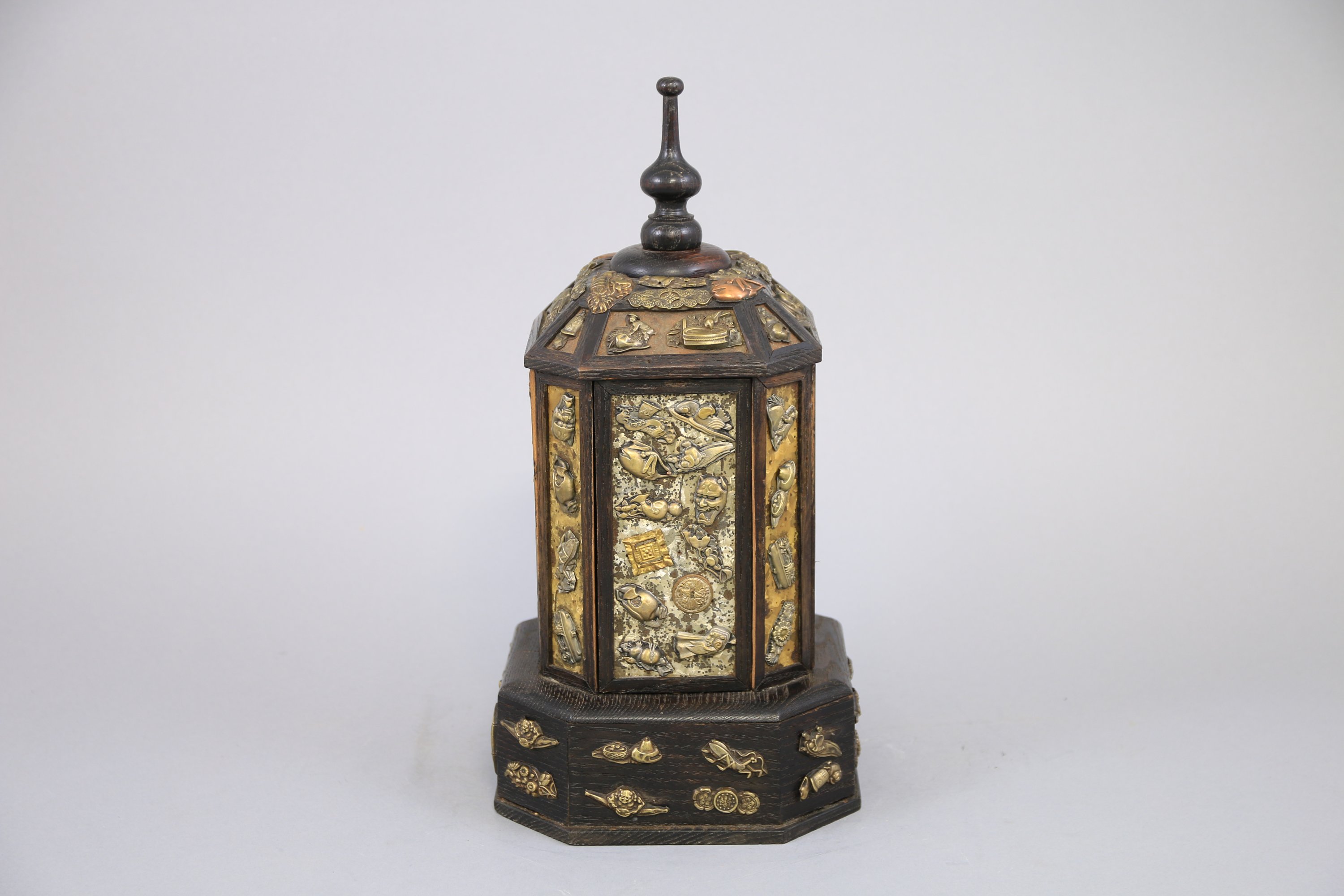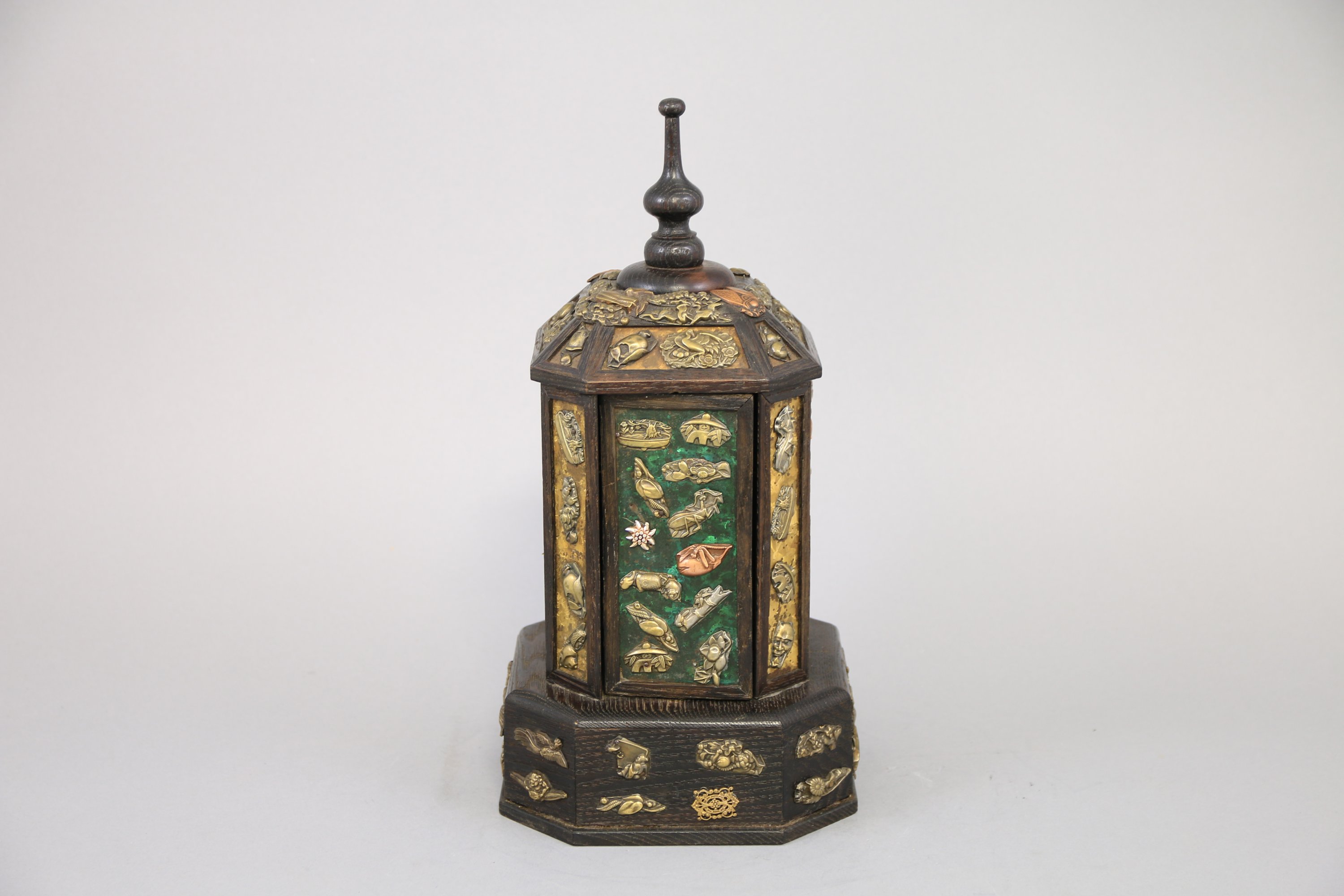 octogonale en bois laqué noire, sommée d'une poignée tournante en forme de toupie actionnant mécaniquement l'ouverture des quatre vantaux composés d'anneaux et tablettes. L'ensemble est décoré d'une centaine de menuki japonais en métal repoussé et autres boutons sur fond de cuivre. La base octogonale à pans coupés ouivre par un petit tiroir.