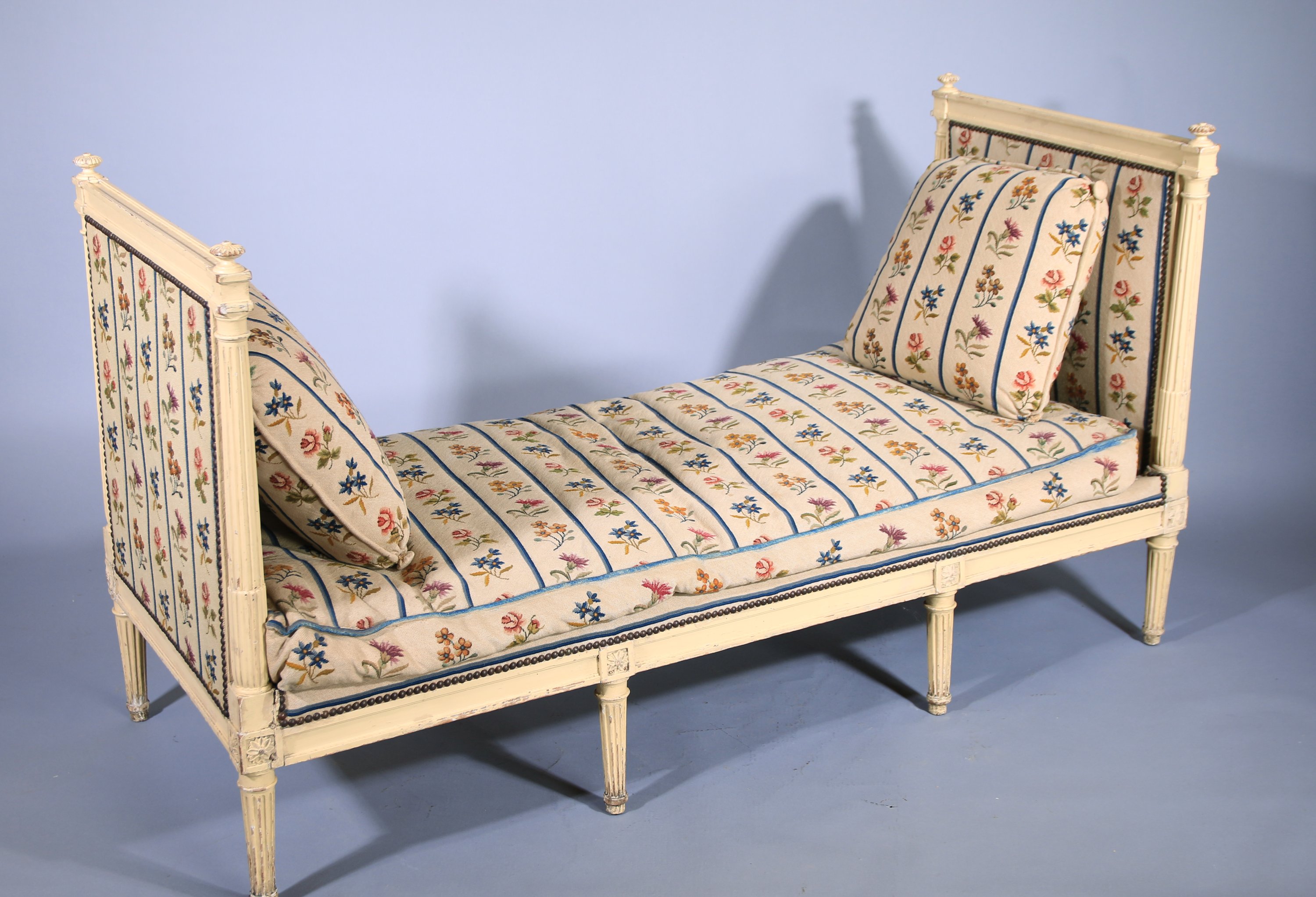 en bois laqué crème, décor de fleurettes en dés de raccordement, montants cannelés a refré surmontés de pots couverts, reposant sur 8 pieds fuselés et cannelés.