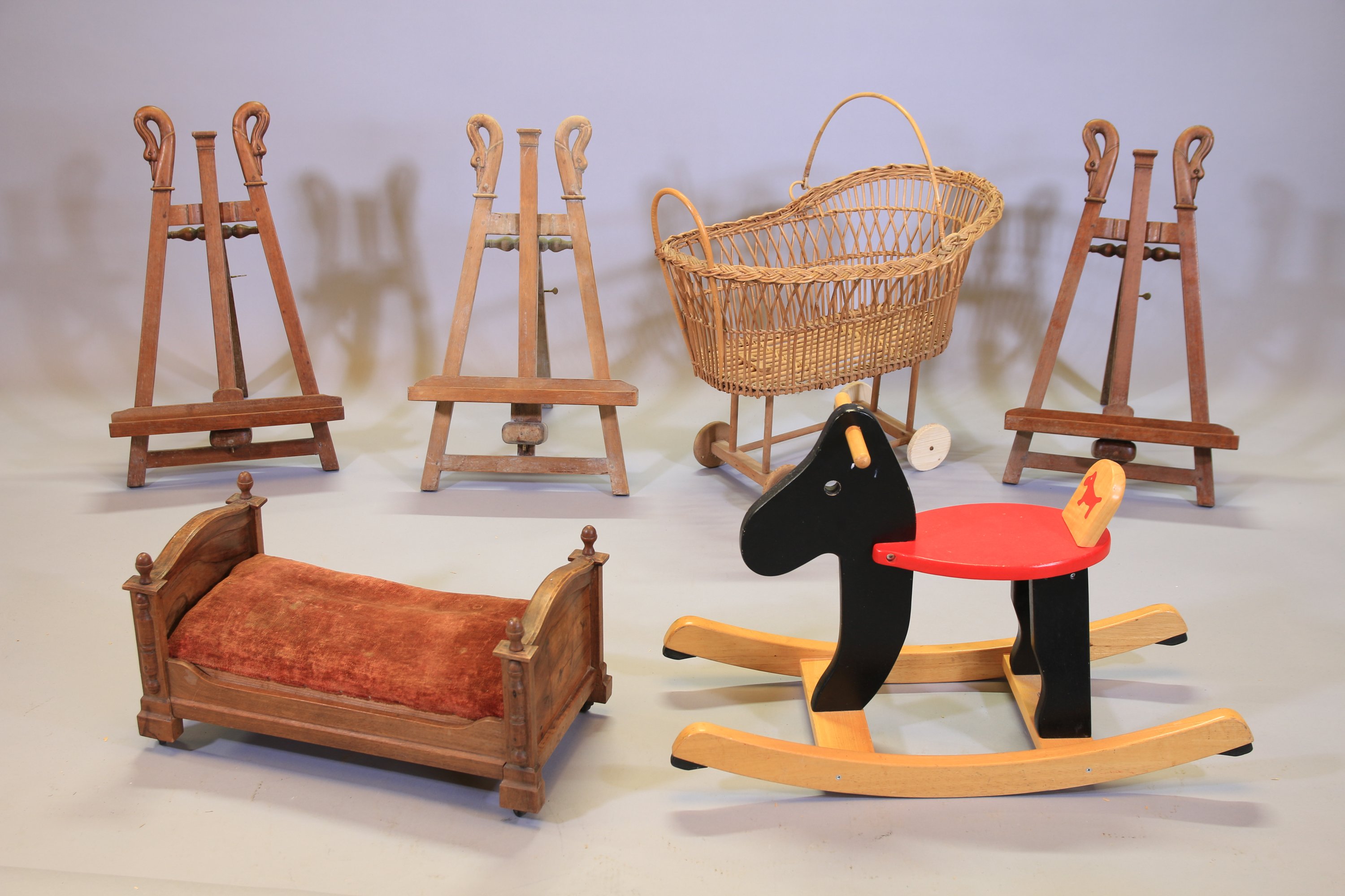 - Trois chevalets miniatures en bois à montants terminés par des cols de cygnes.