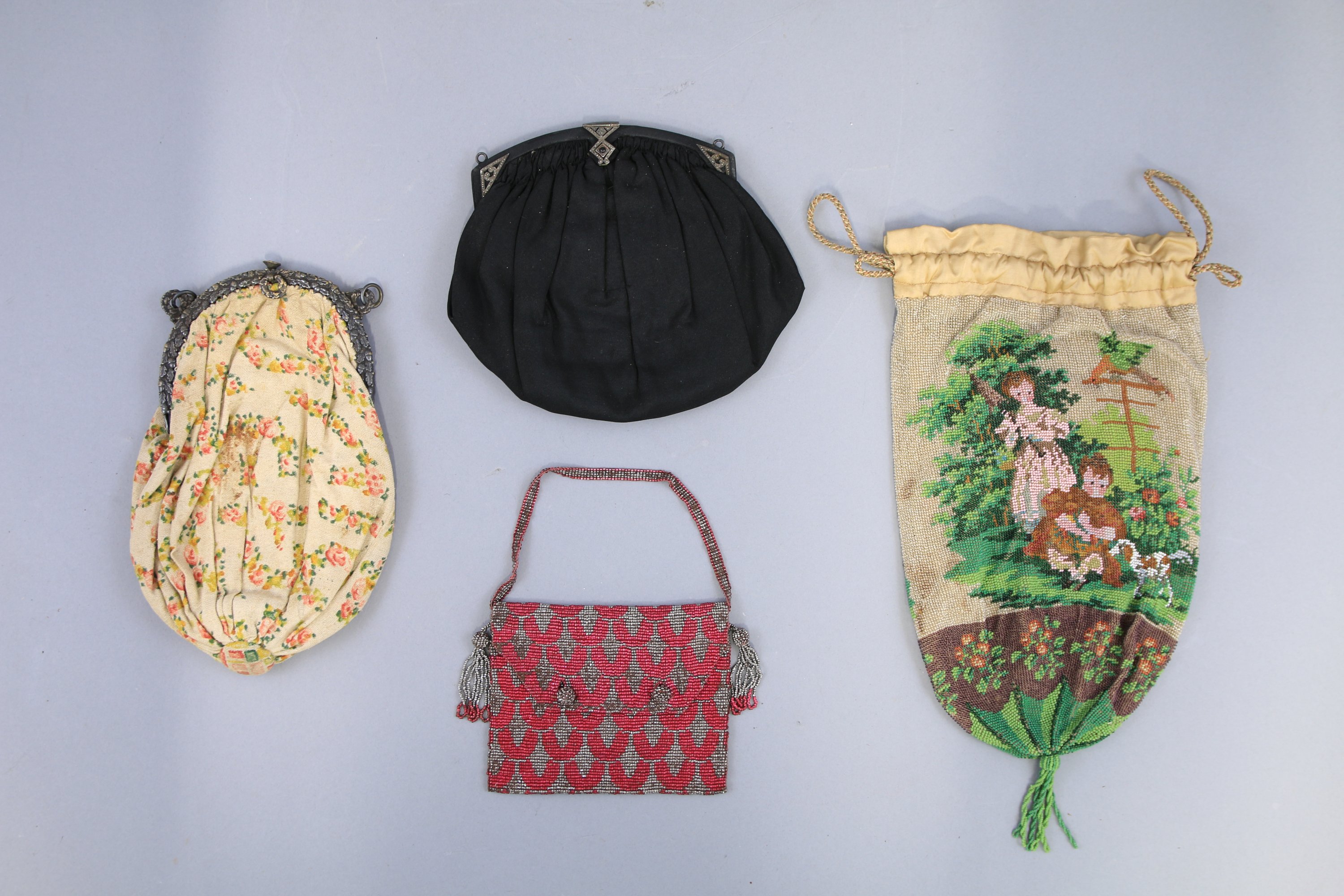en taffetas et satin, tissu imprimé et fermoir argenté, perles à décor d'enfant et lamé.