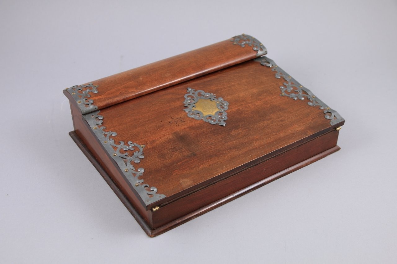 en acajou et bordures en étain en forme de rinceaux, le centre à décor d'un cartouche en laiton monogrammé "MF". Il dévoile un plateau de velours vert en partie basse et un rabat avec plumier, encrier et deux niches.