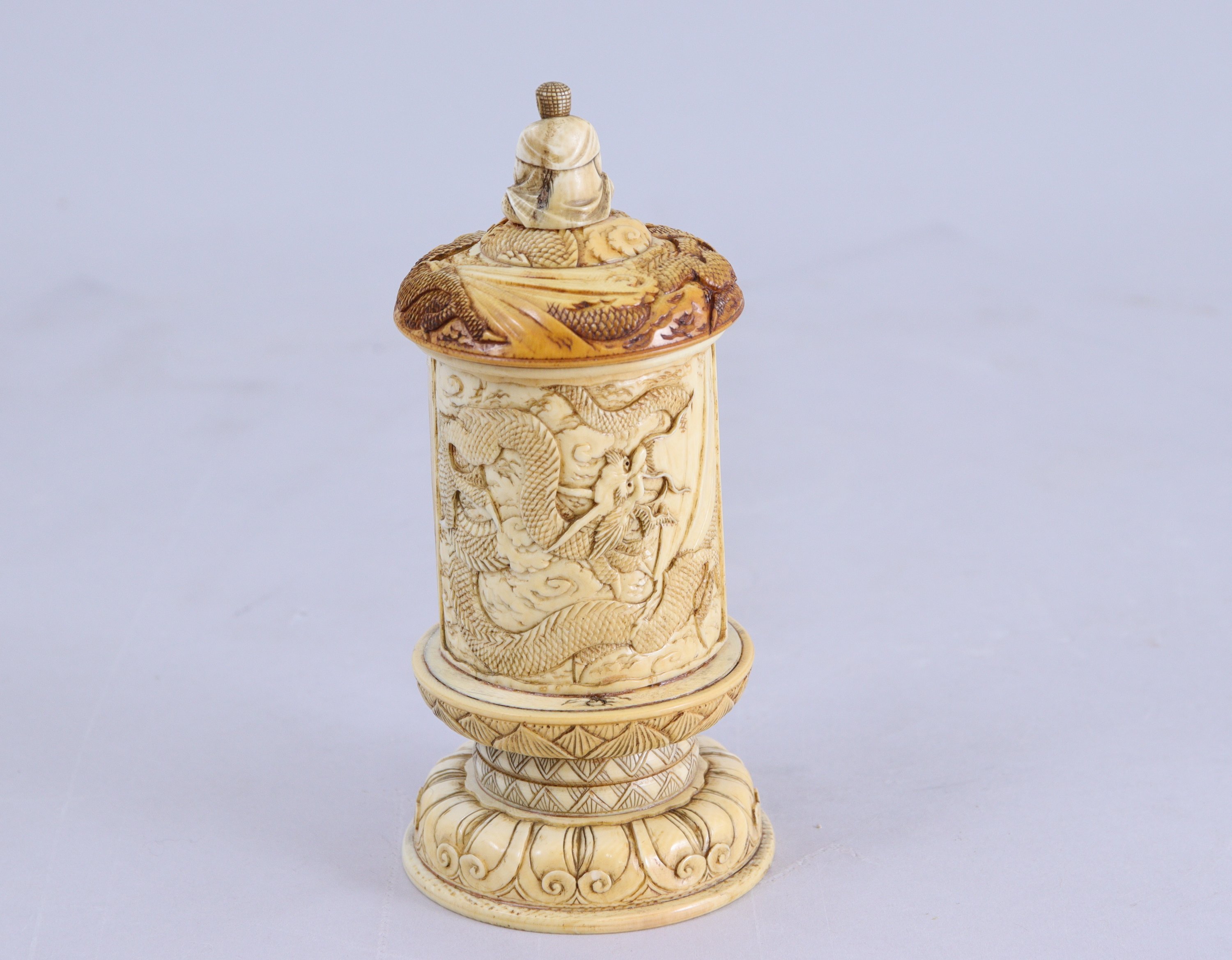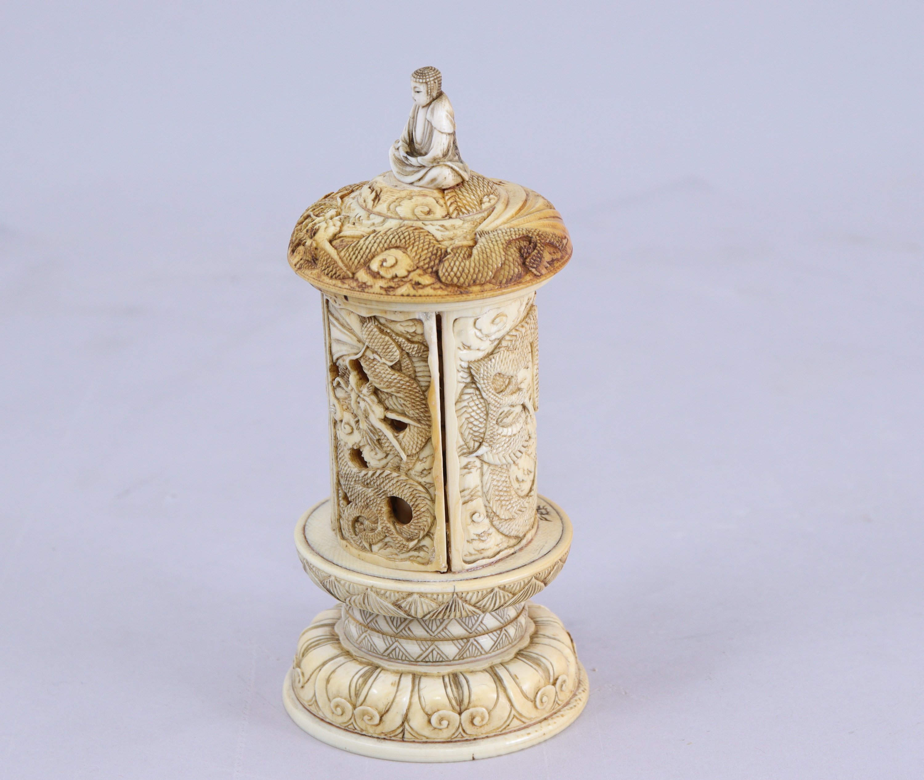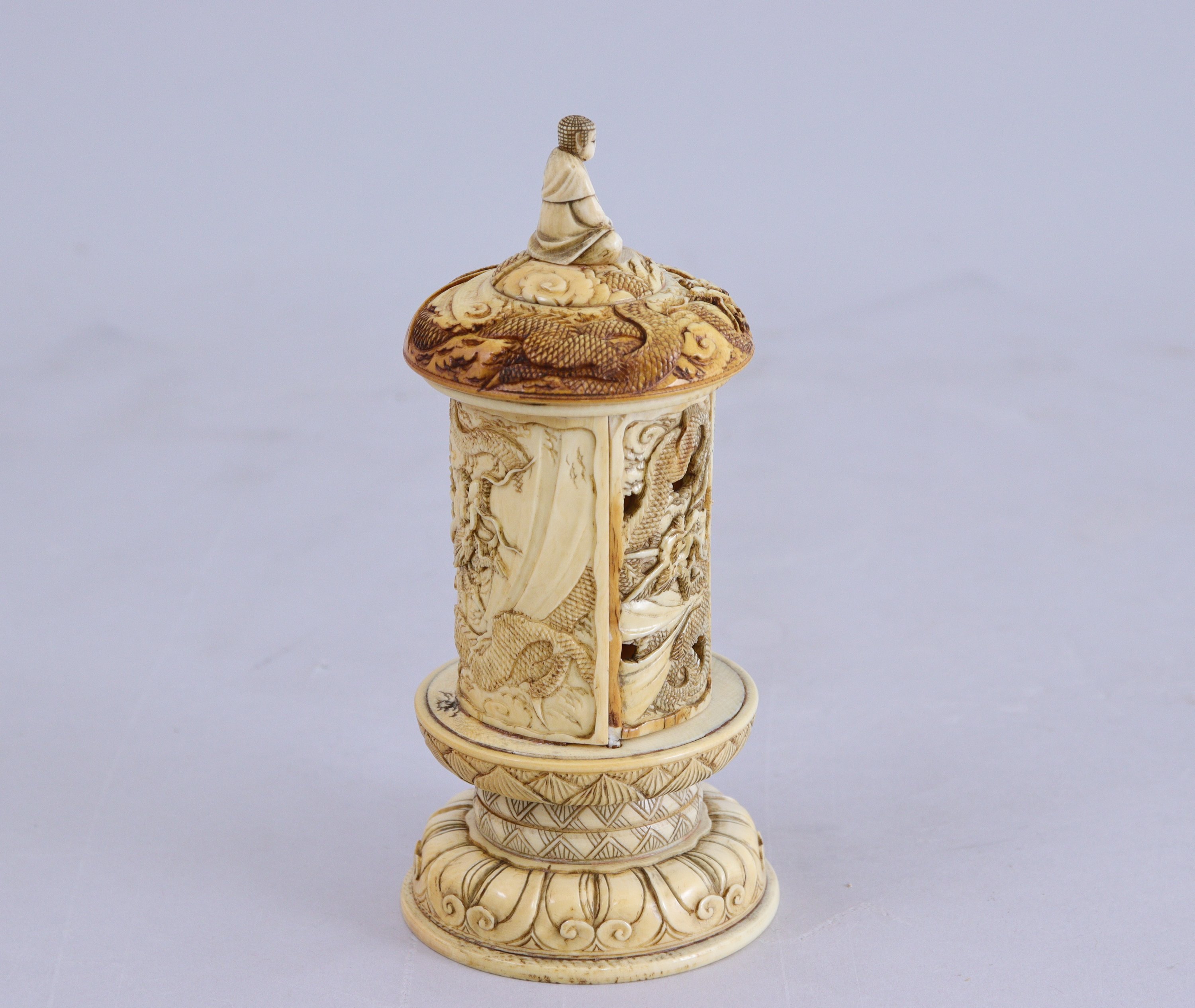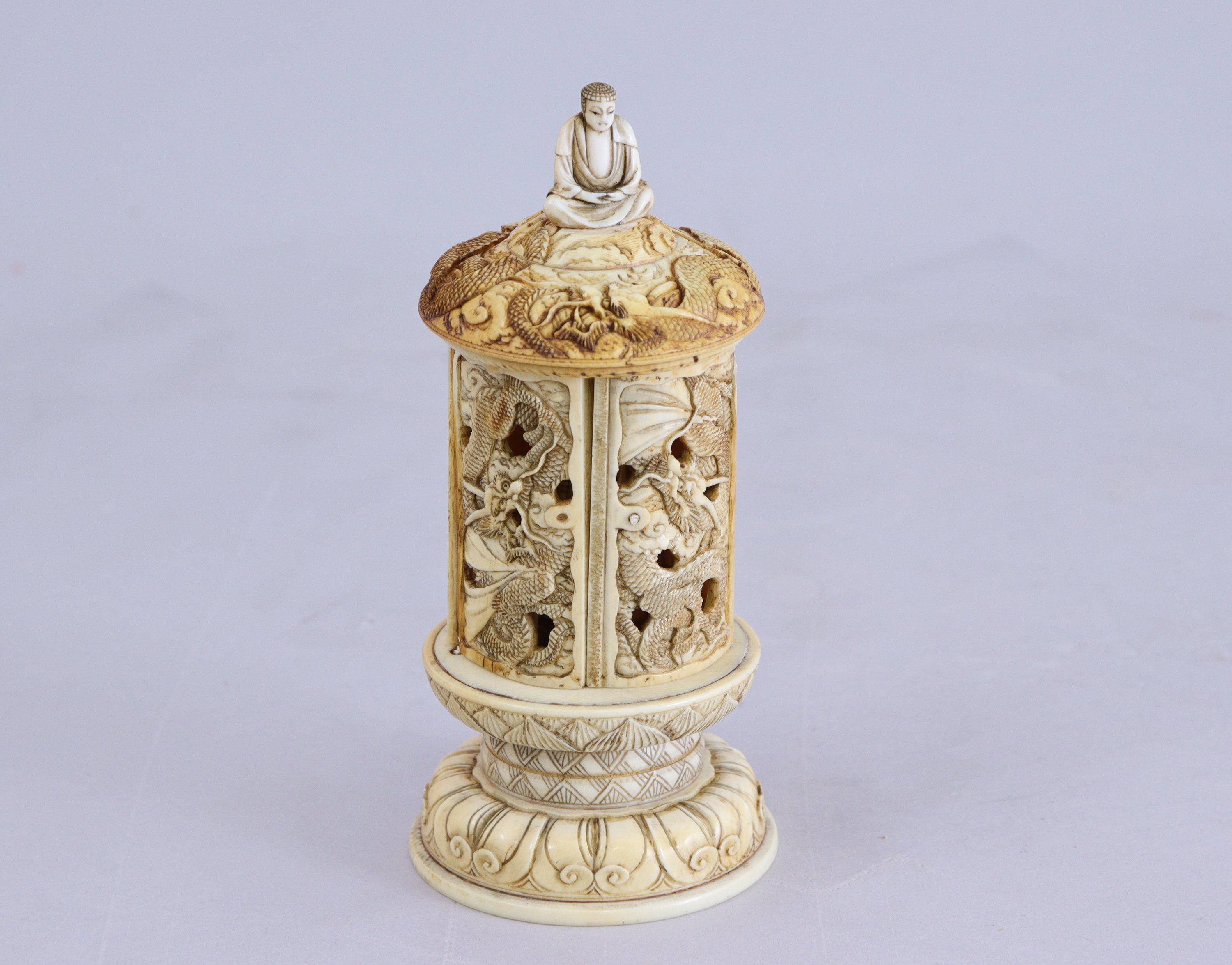 en ivoire, découvrant Kannon à l'intérieur tenant une branche de lotus. Les portes à décor ajouré de dragons dans les nuages, le toit surmonté d'un bouddha assis et sculpté d'un dragon.