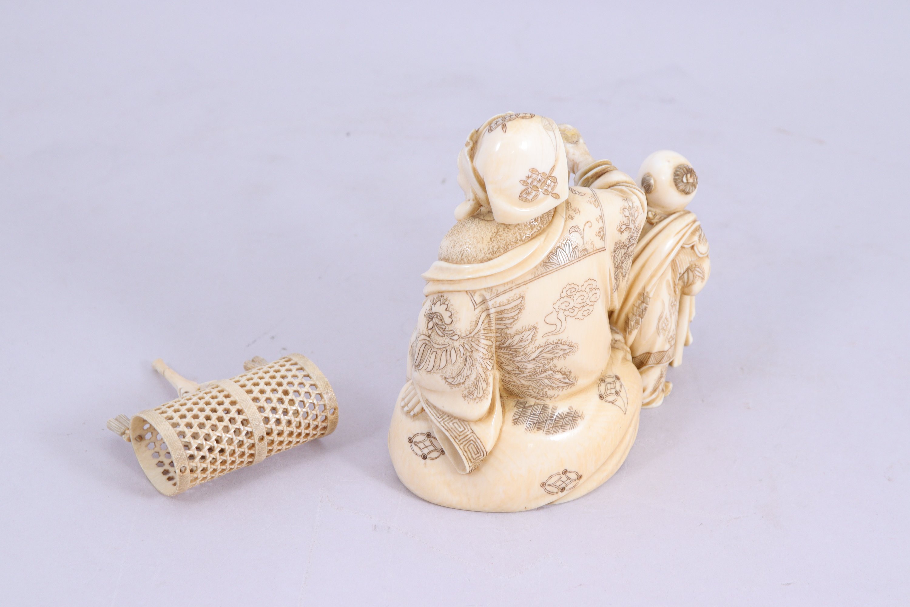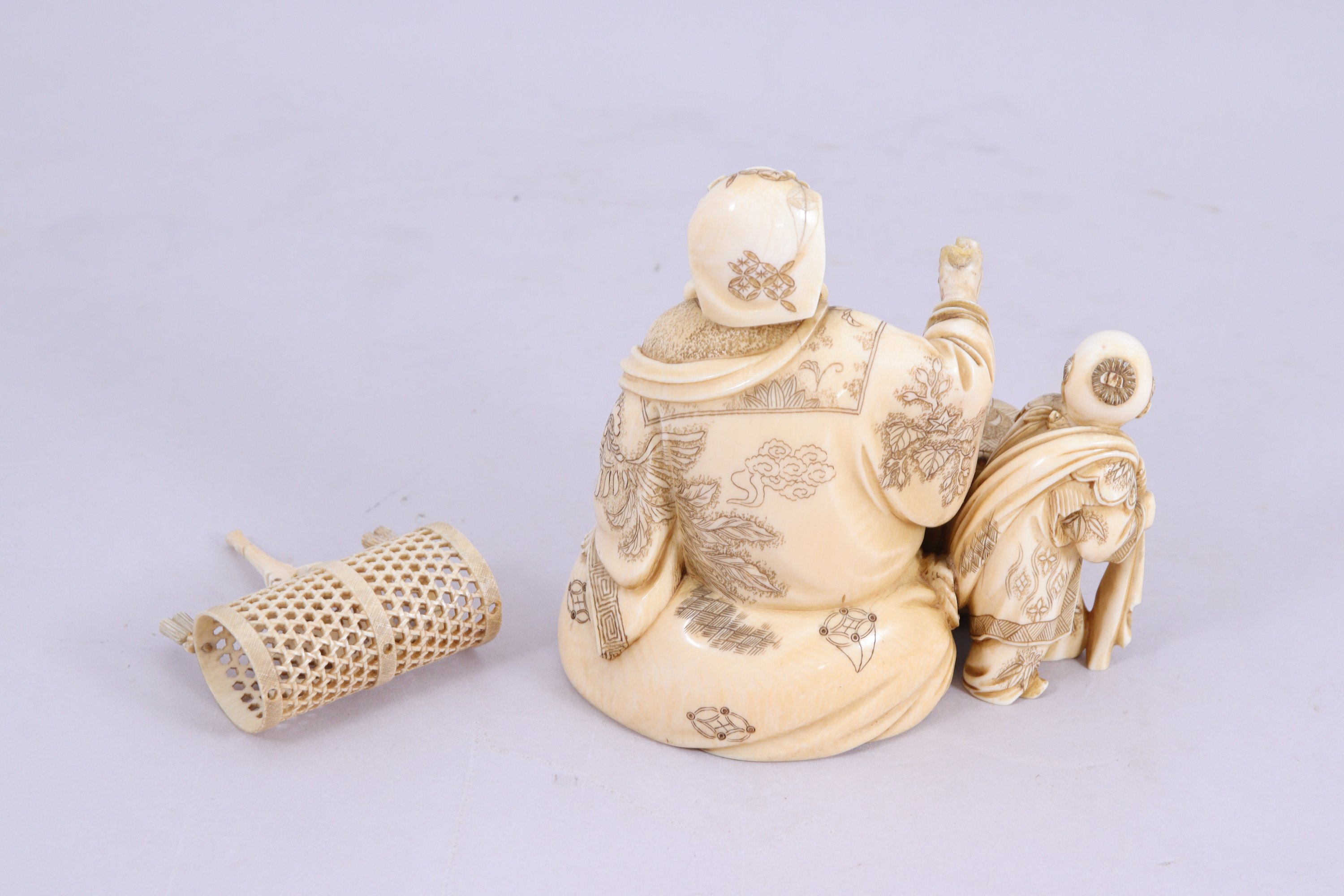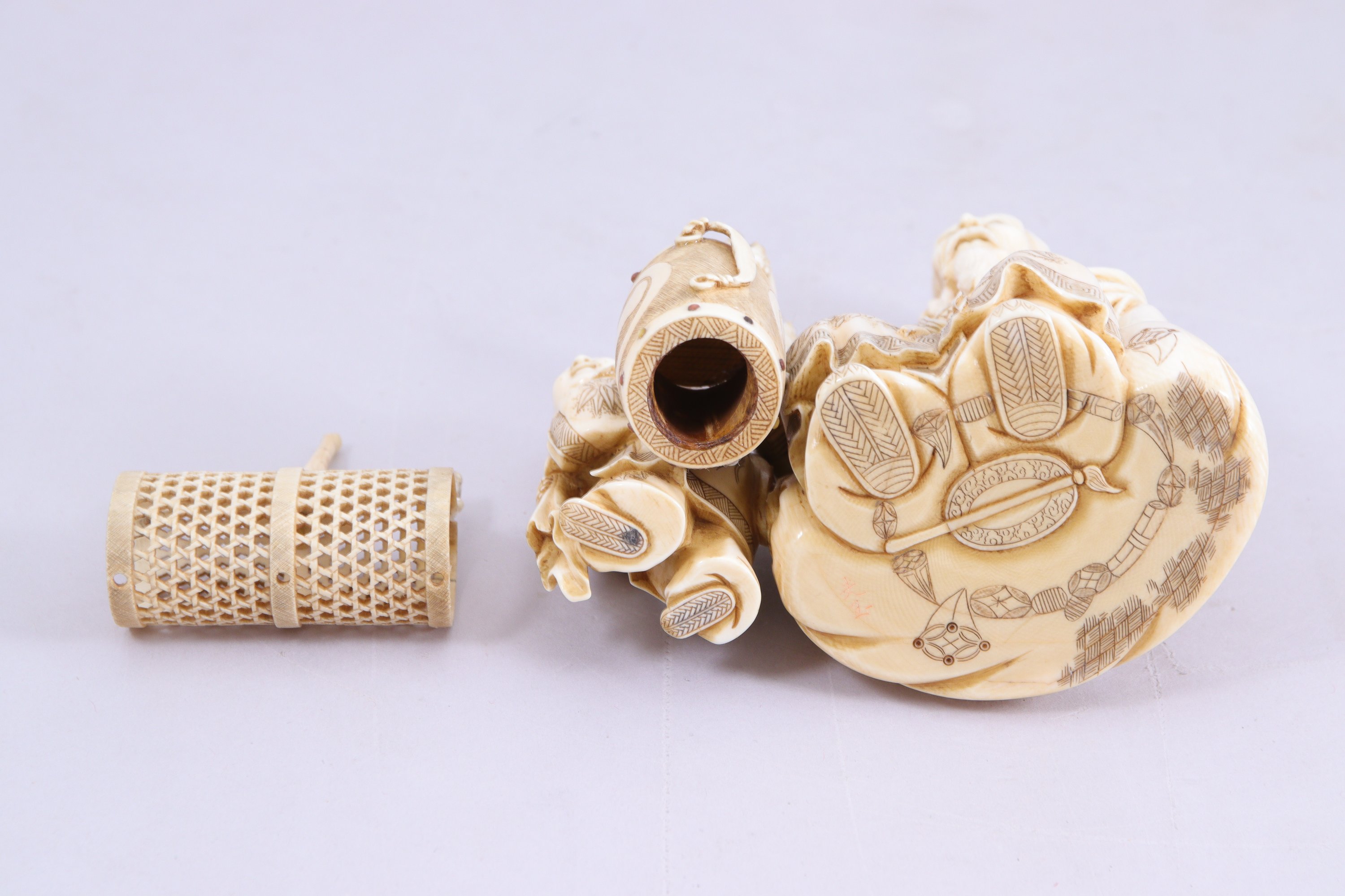 Okimono en ivoire, l'homme tenant un bâton pour le tambour posé devant lui. Les rivets du tambour incrustés de nacre.