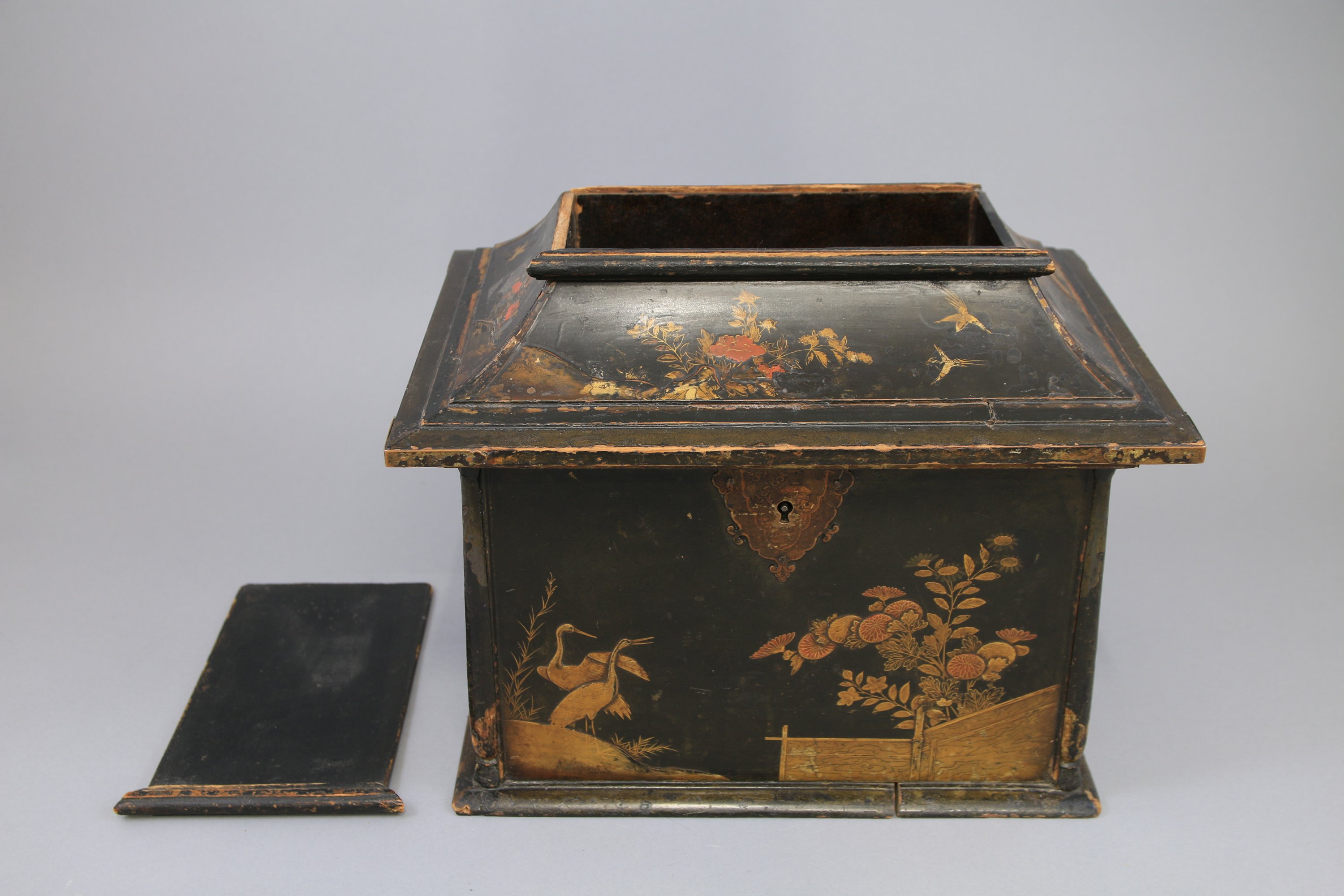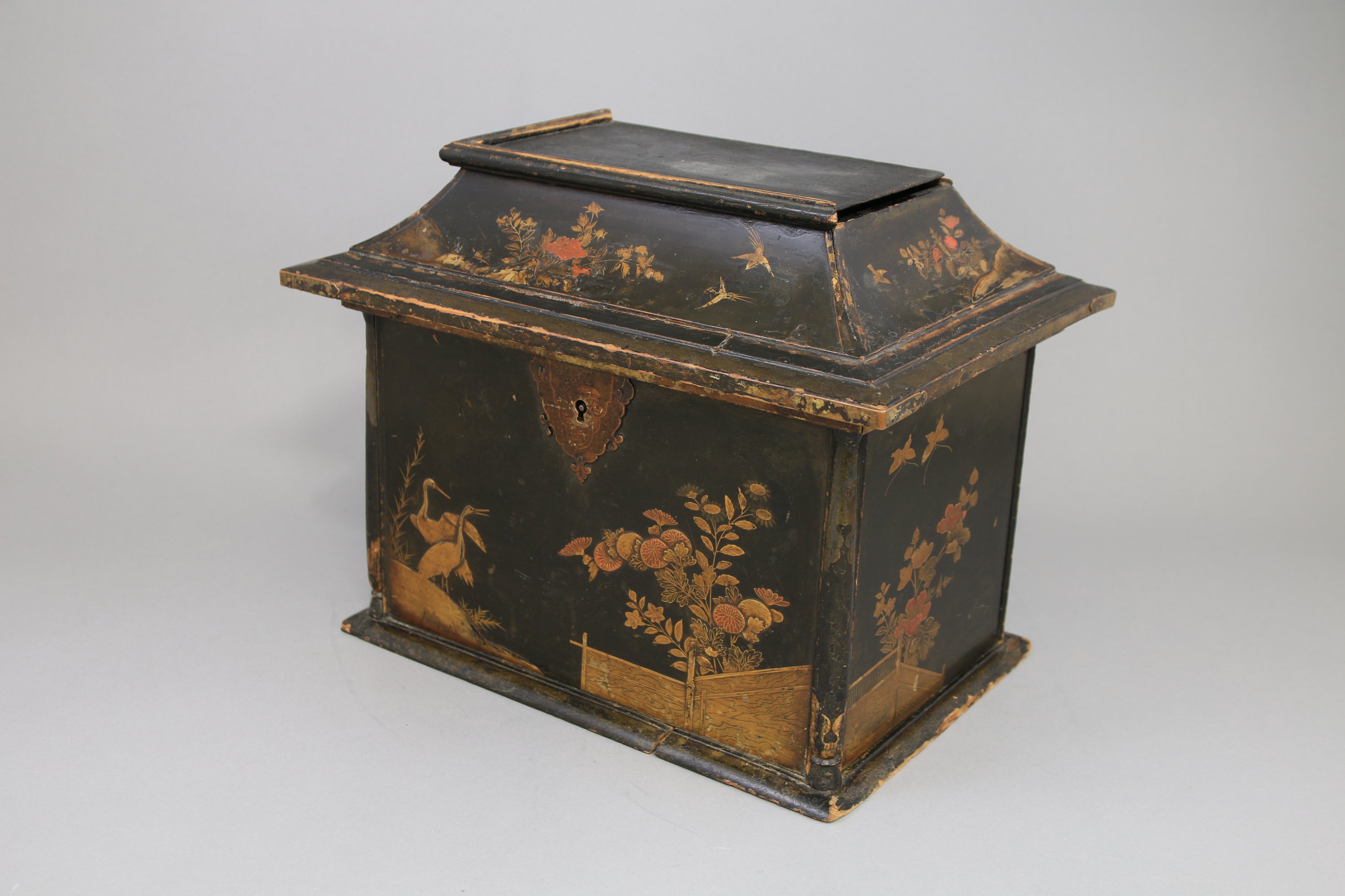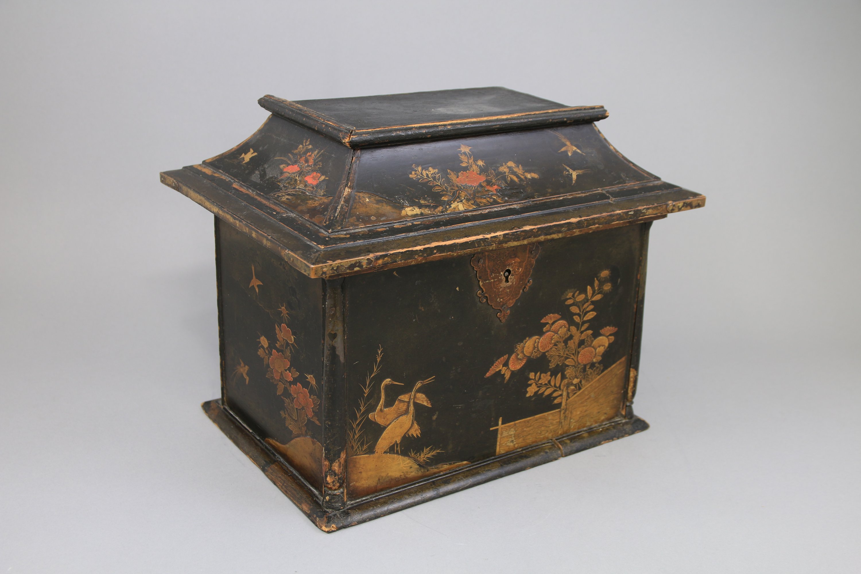 en forme de pavillon, en laque brune à décor de laque rouge et or de grues, papillons et chrysanthèmes, oiseaux et pivoines.