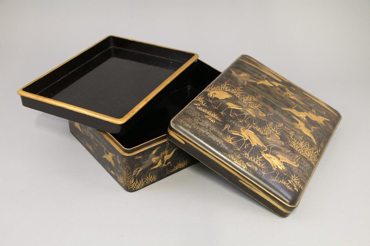 en laque brune à décor en hira maki-e et hedatsu de laque or, kirikane et hirame de grues piétant dans un étang de roseaux et en vol. L'intérieur en laque brune ouvrant sur un plateau.