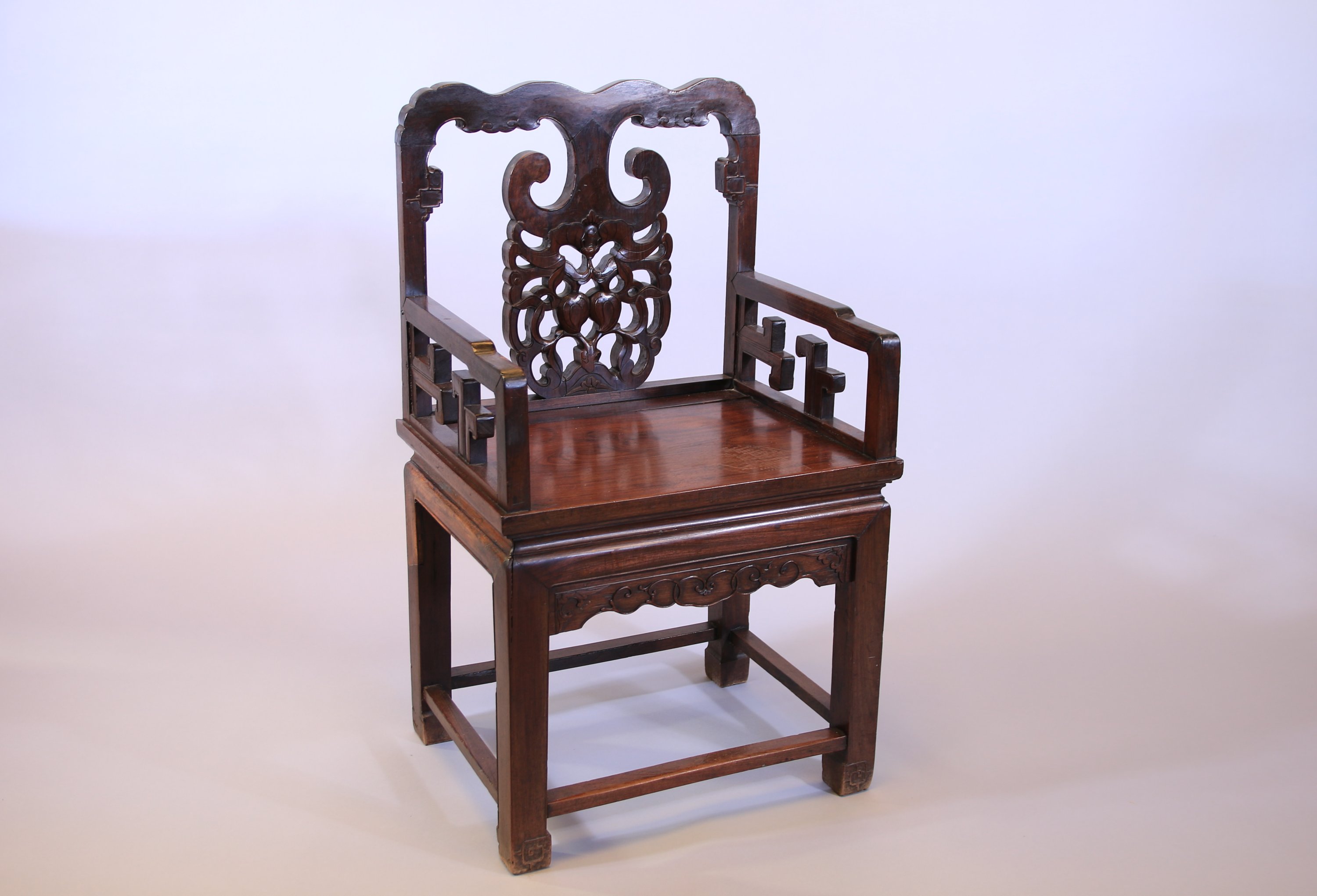 à dossier ajouré à décor d'une chauve-souris et de deux pêches de longévité évoluant dans des nuages. La ceinture est ornée de rinceaux. Il repose sur quatre pieds reliés par une entrejambe.