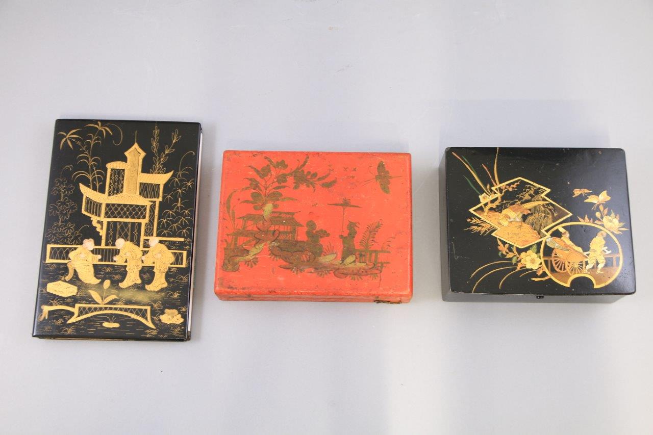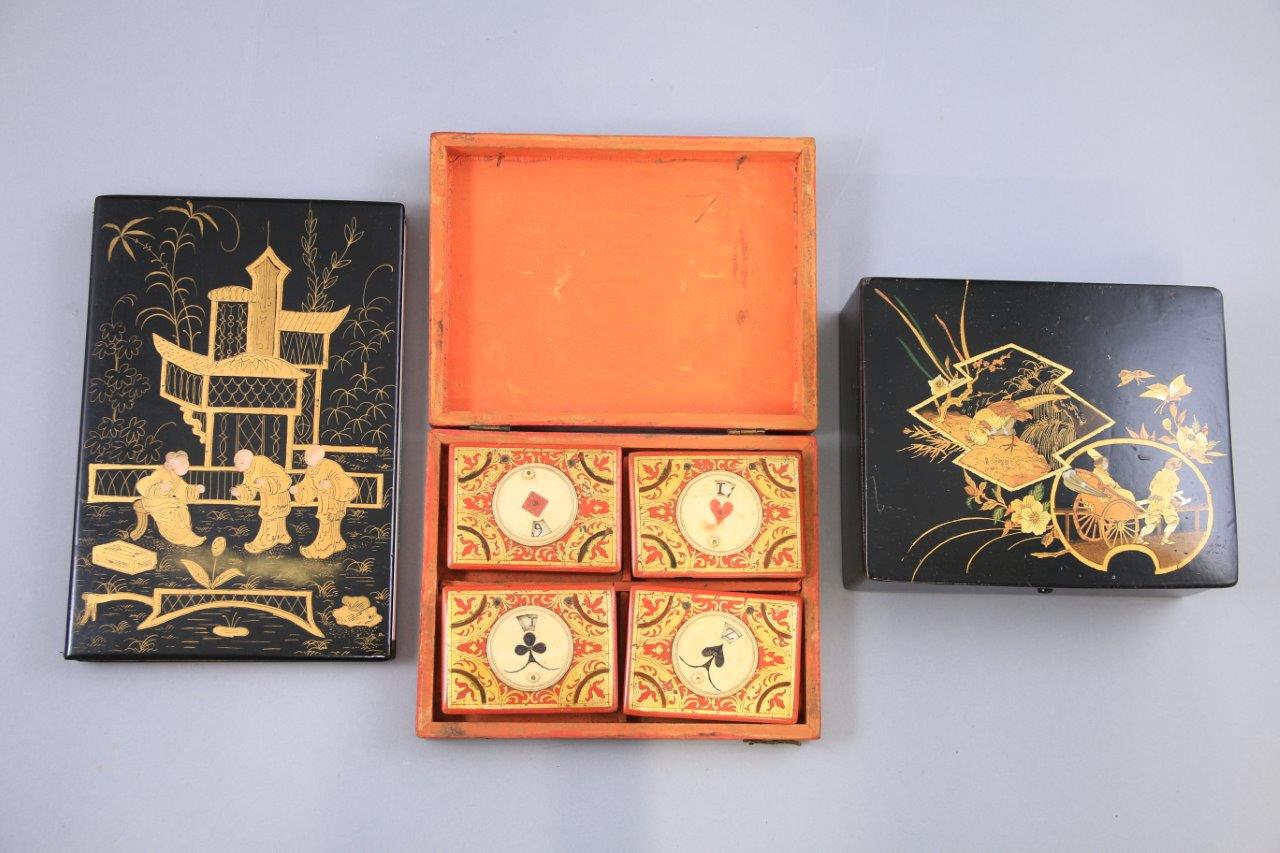 comprenant: deux boîtes, dont une boîte à jeux à décor de personnages sur fond rouge, les jetons en os et un carnet à décor de trois personnages dorés sur fond noir.