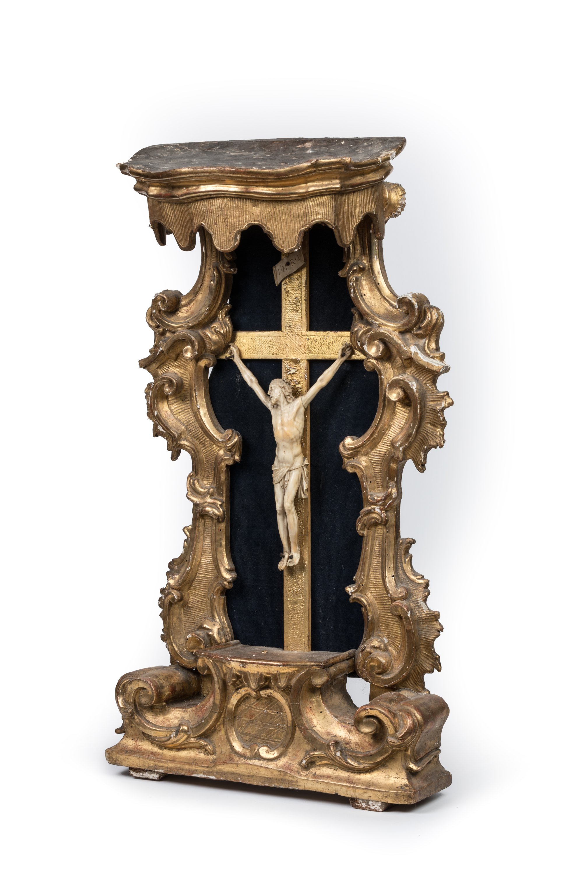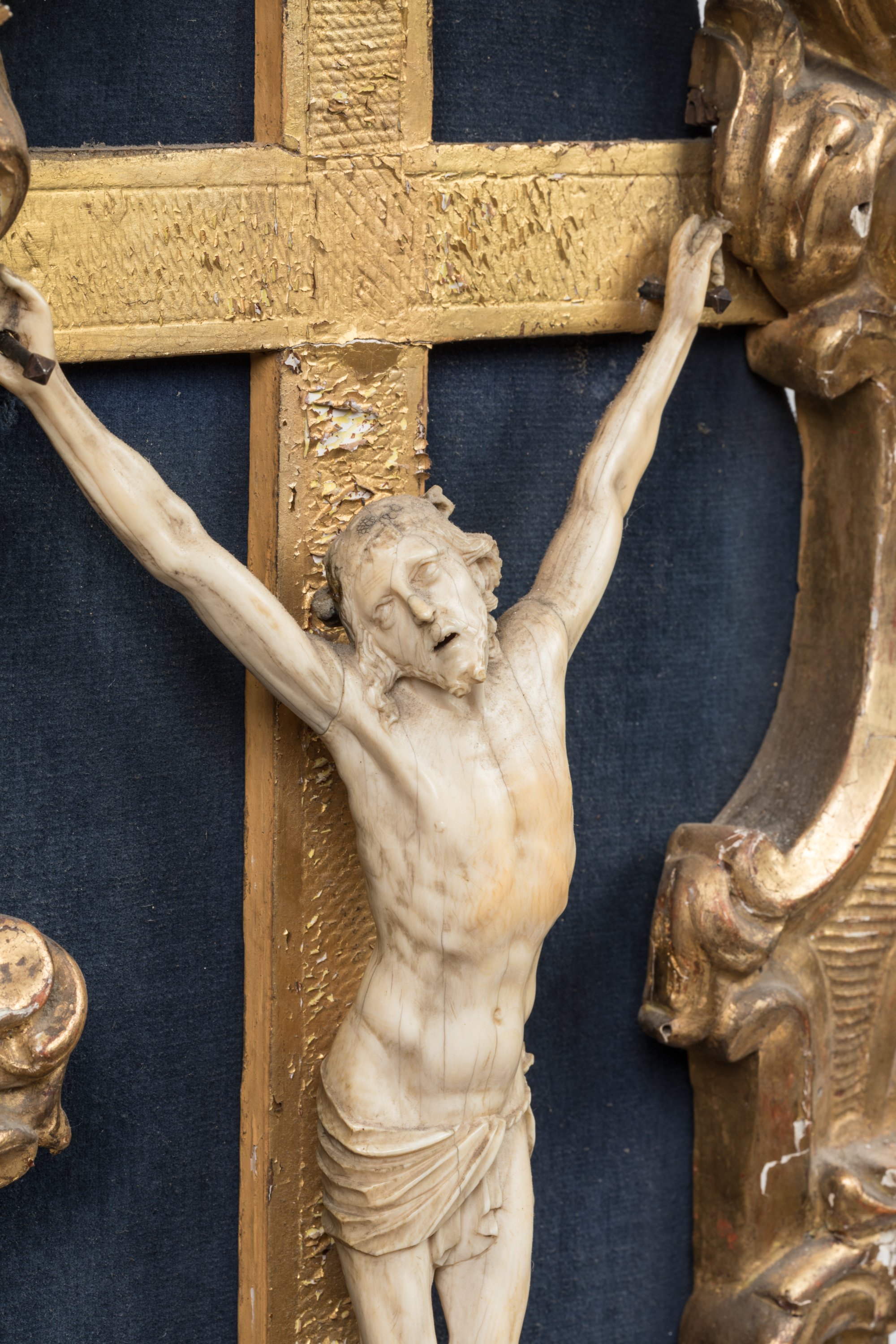 Sur un crucifix en bois doré dans un panneau reliquaire à la bordure ornée de volutes et surplombé d’un dais en bois doré.
