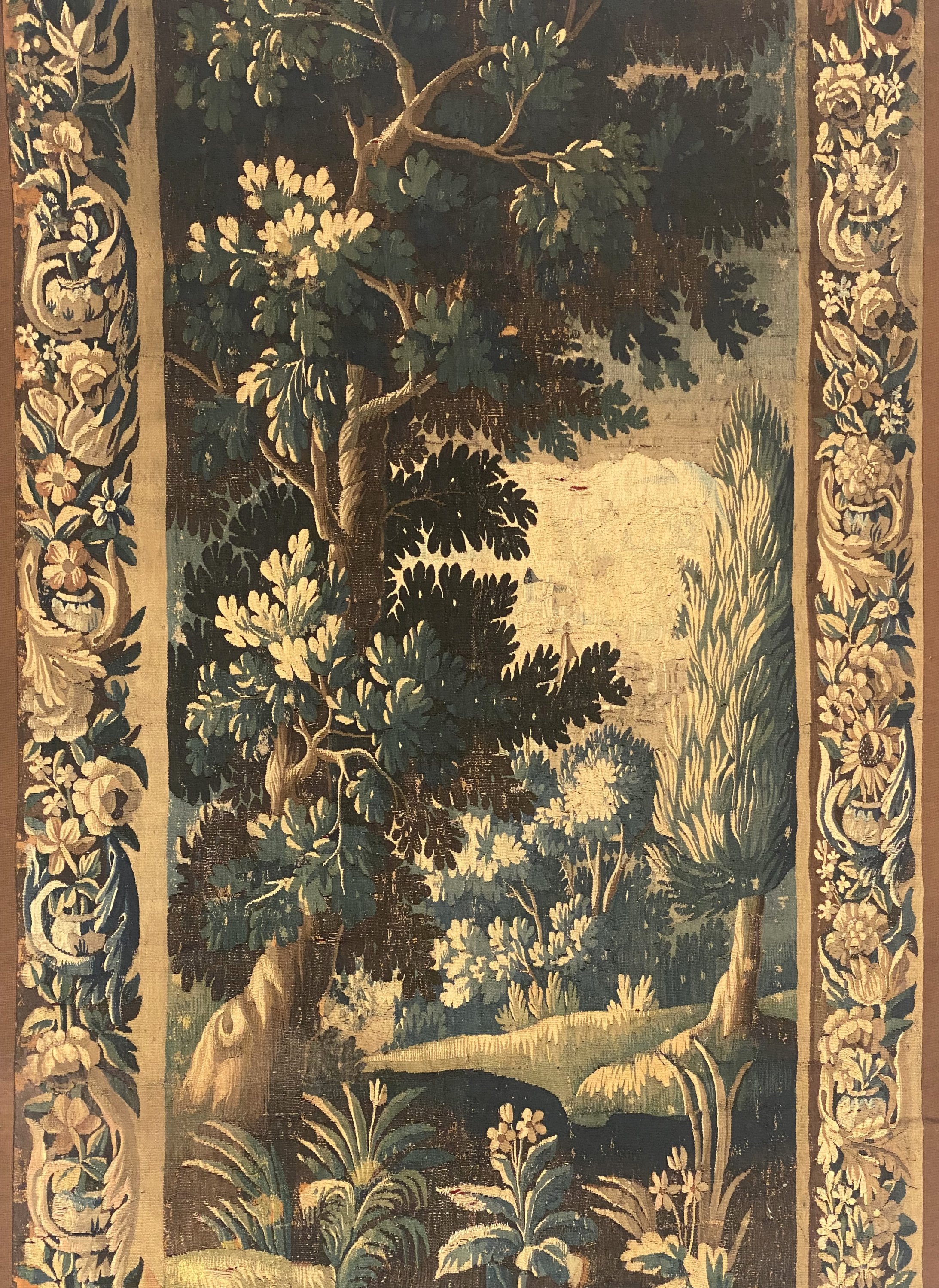 en laine et soie, verdure, avec sa bordure rentrayée de rinceaux de palmes et fleurs.